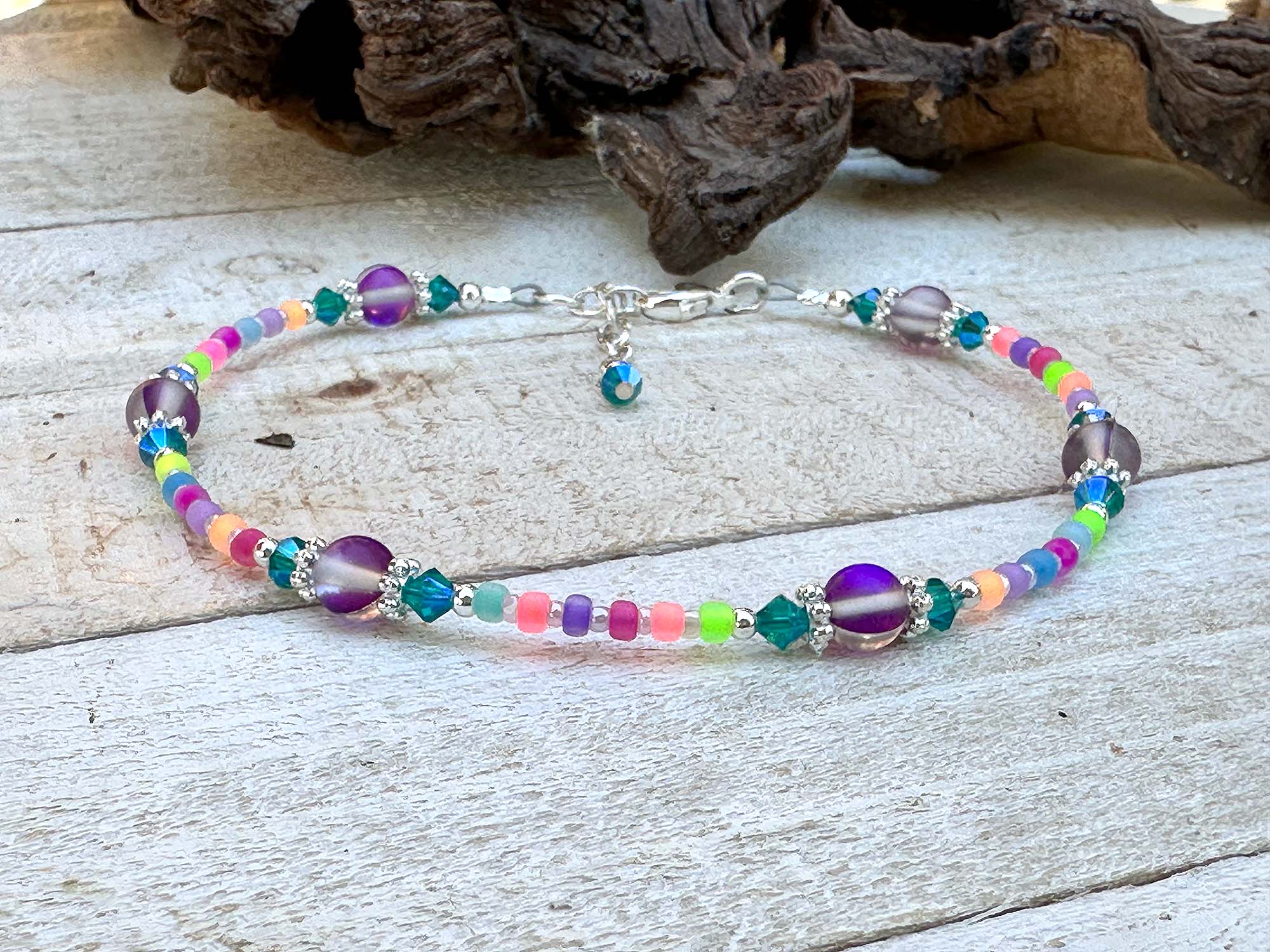 To preserve the vibrant colors and shimmering beauty of these beads, please avoid exposure to pool chemicals or other harsh substances, as they may alter the color over time. To extend the life of your anklet, it's best to remove it before showering.