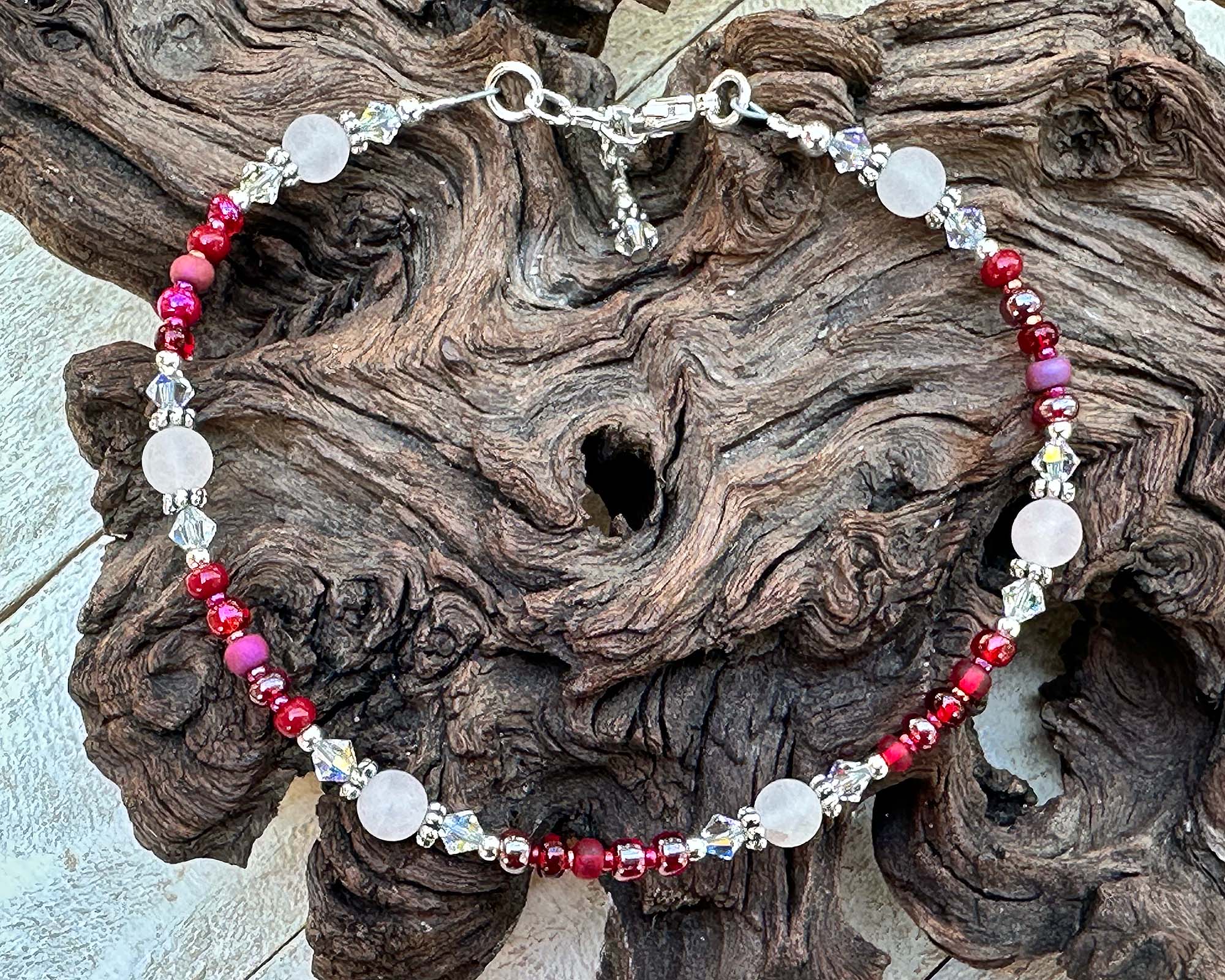 Elevate your style with our 9 1/2" Rose Quartz Passion Red Crystal Beaded Anklet, a perfect statement piece for any occasion. This stunning anklet features a delightful mix of matte rose quartz, bold red seed beads, sparkling iridescent crystals, and silver-plated accents. Ideal for everyday wear or special events, this accessory adds a bold and eye-catching touch to any outfit. Available in various sizes—contact us for custom sizing! Limited stock available, so hurry and make it yours.