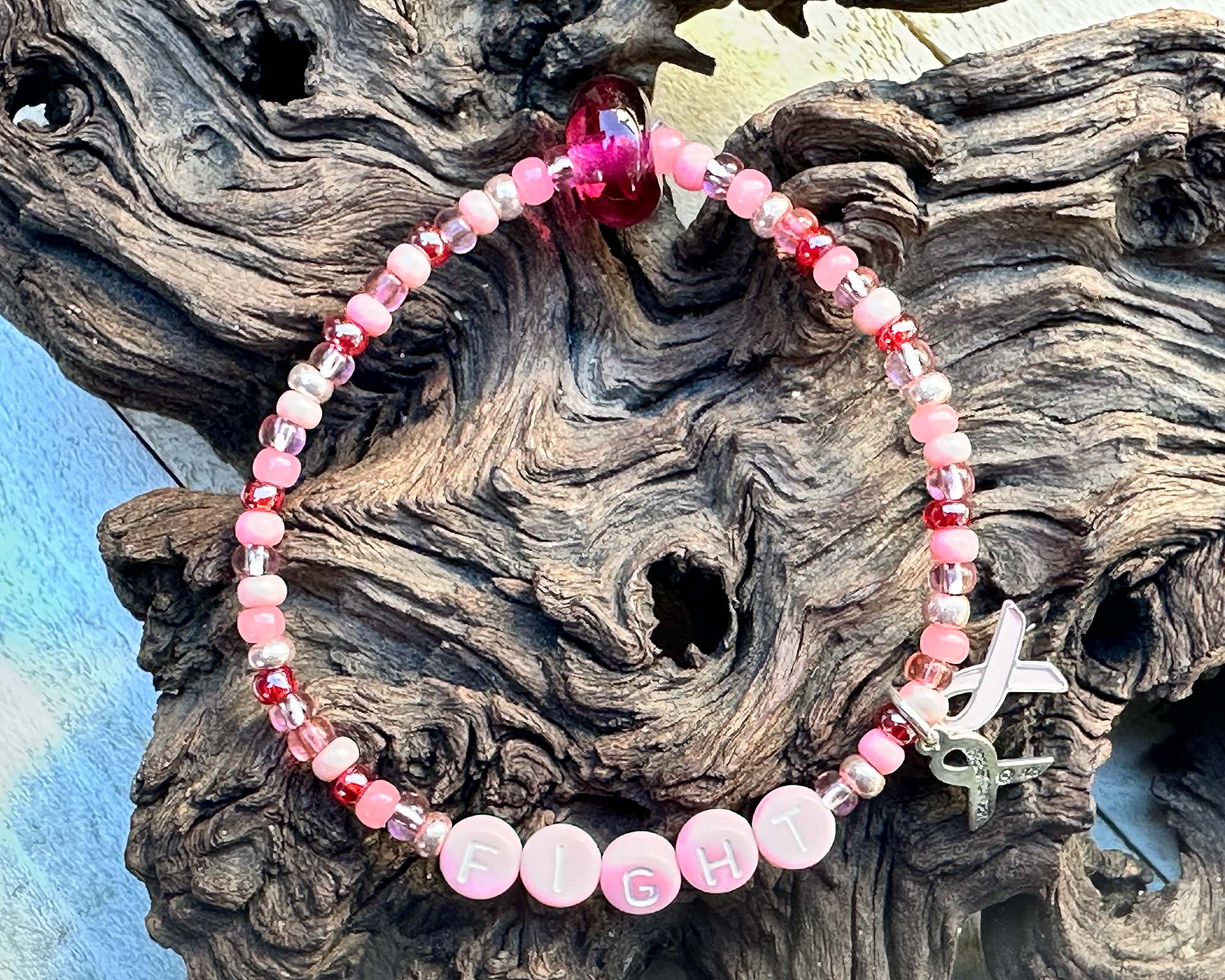This "Fight" Breast Cancer Awareness Lampwork Bracelet is thoughtfully created with pink Czech seed beads, pink plastic letter beads, and a handmade pink lampwork bead. At 7 inches, it offers a perfect fit for everyday wear and features an artisan touch that brings a smile every time you see it. With around 50% of profits donated to breast cancer research and support organizations, wearing this bracelet not only celebrates strength and hope but also contributes to a meaningful cause. Made with care and craftsmanship, it’s a truly unique accessory from Kyndra’s exclusive collection, showcasing her artistic vision and in-house handcrafted lampwork bead