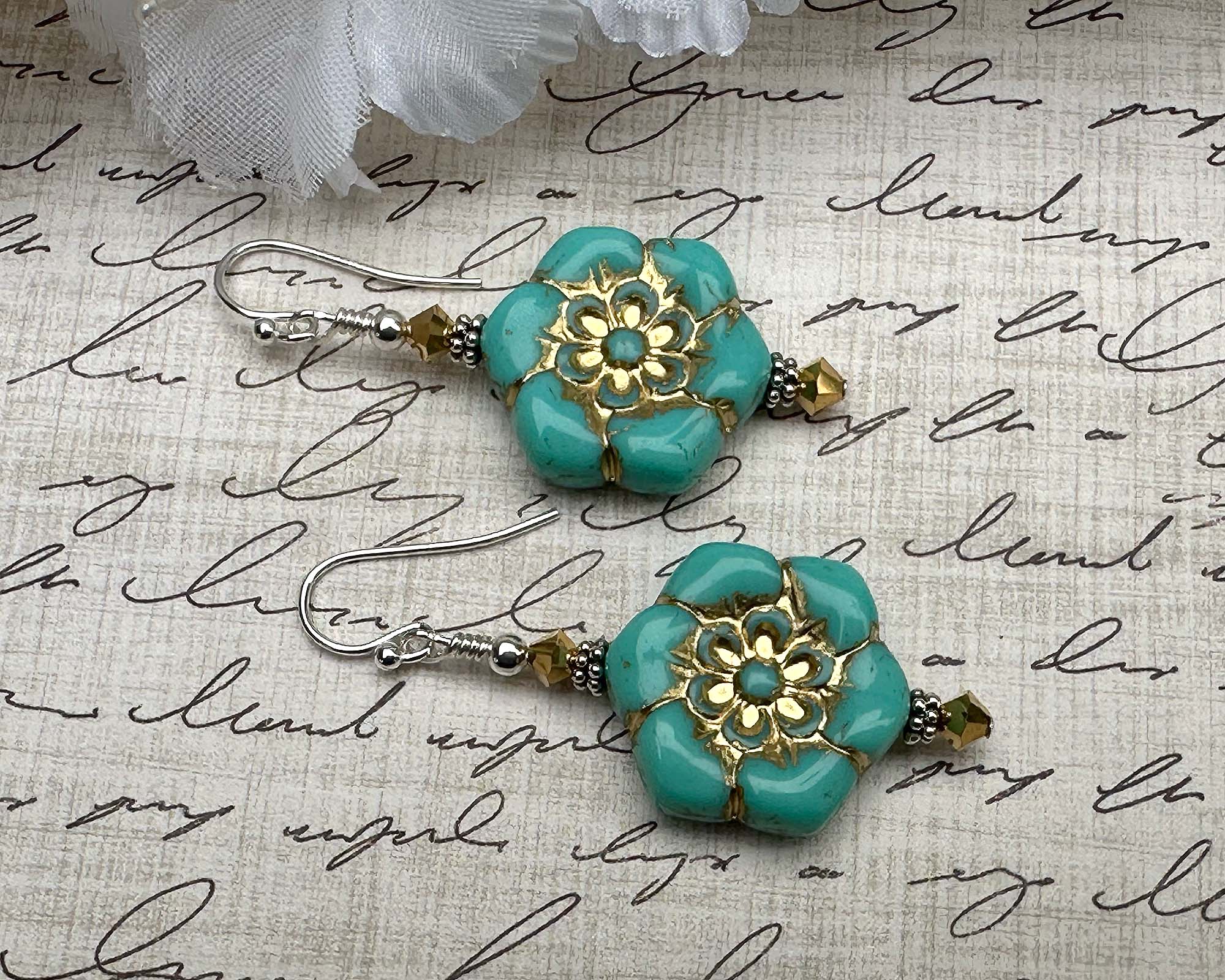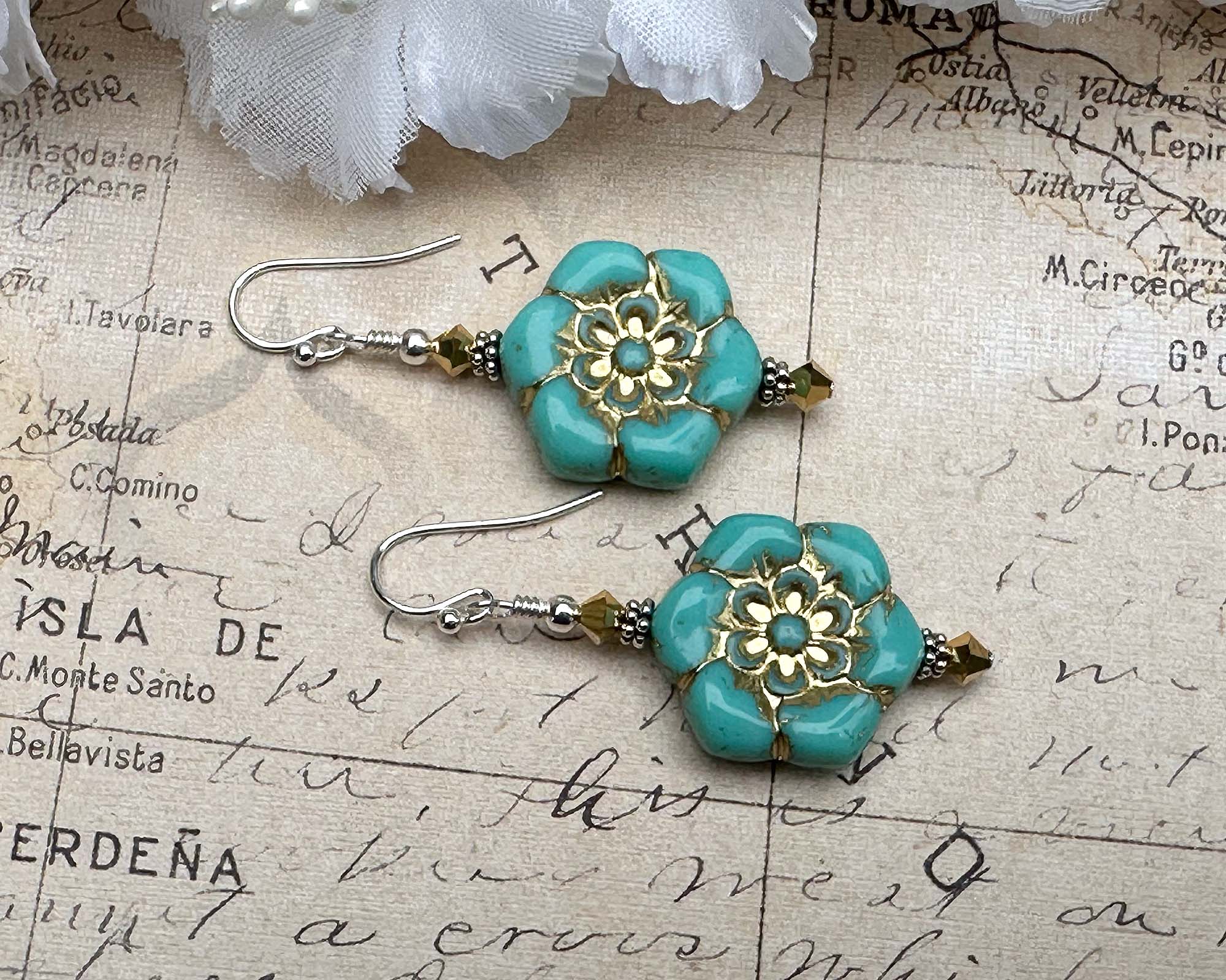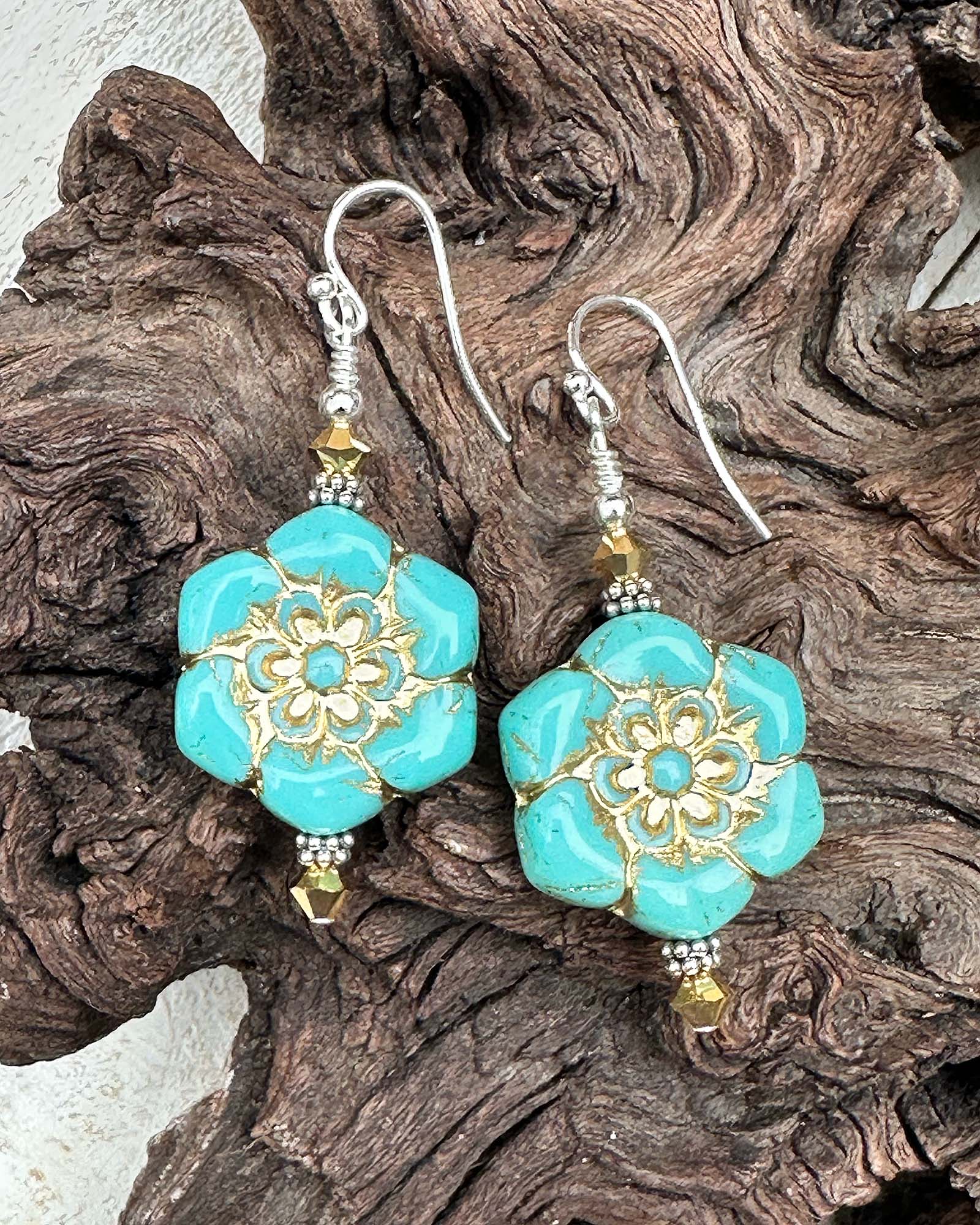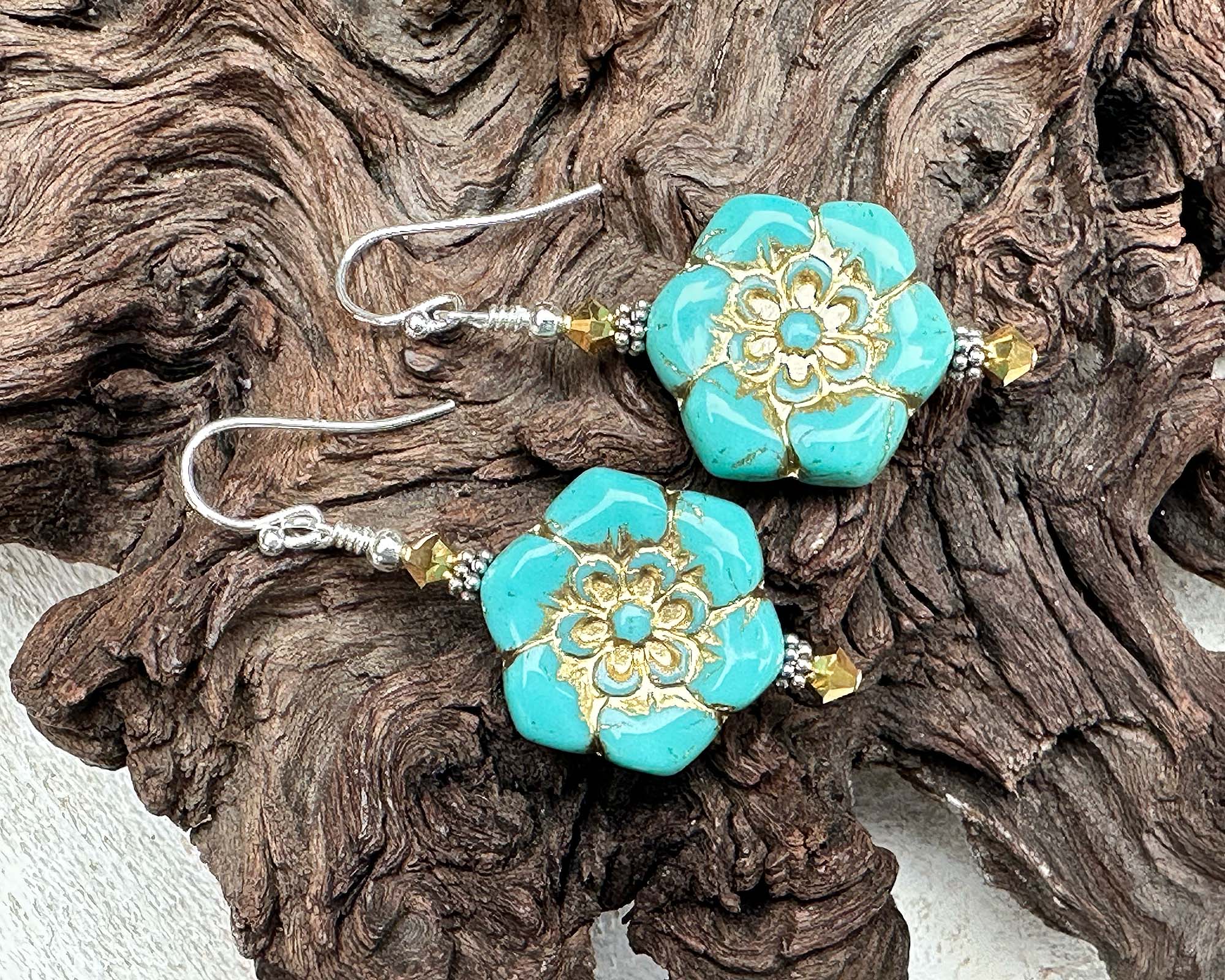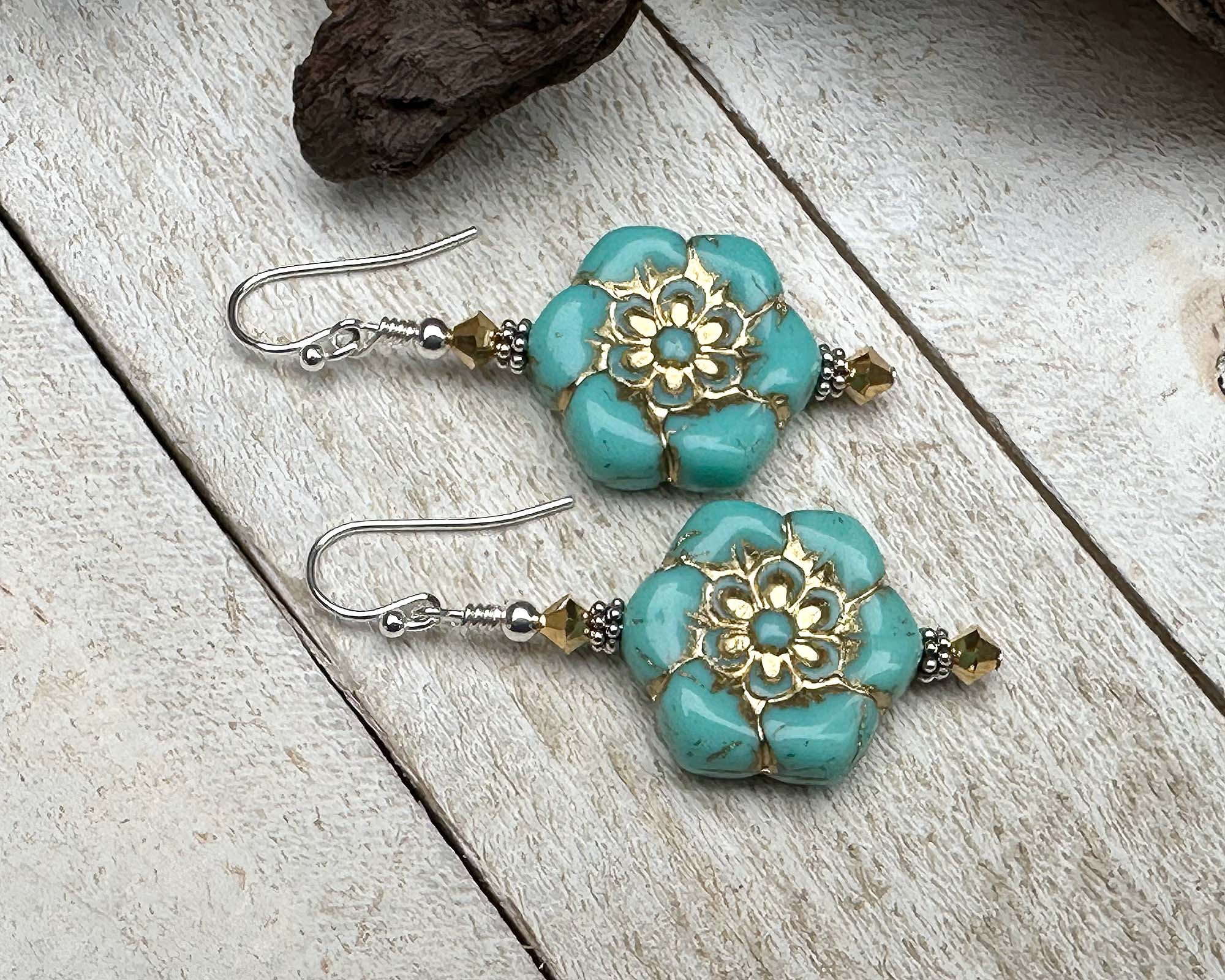 Bring botanical brilliance to your ears with these captivating 2-inch teal green gold floral earrings. Featuring teal green Czech pressed flower glass beads paired with glittering gold aurum faceted crystals, Bali sterling silver accents, and .925 silver components, these blooms pack serious style credentials. The whimsical floral design transitions seamlessly from casual days to special celebrations, adding personality and color wherever you go. Crafted with premium materials built for longevity, they're the kind of earrings that become instant favorites. Whether you're a nature-loving trendsetter or shopping for that free-spirited friend, these beauties deliver bohemian flair with undeniable charm and staying power.
