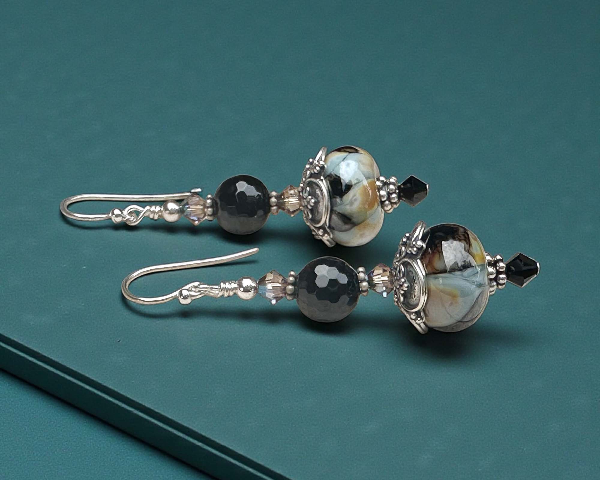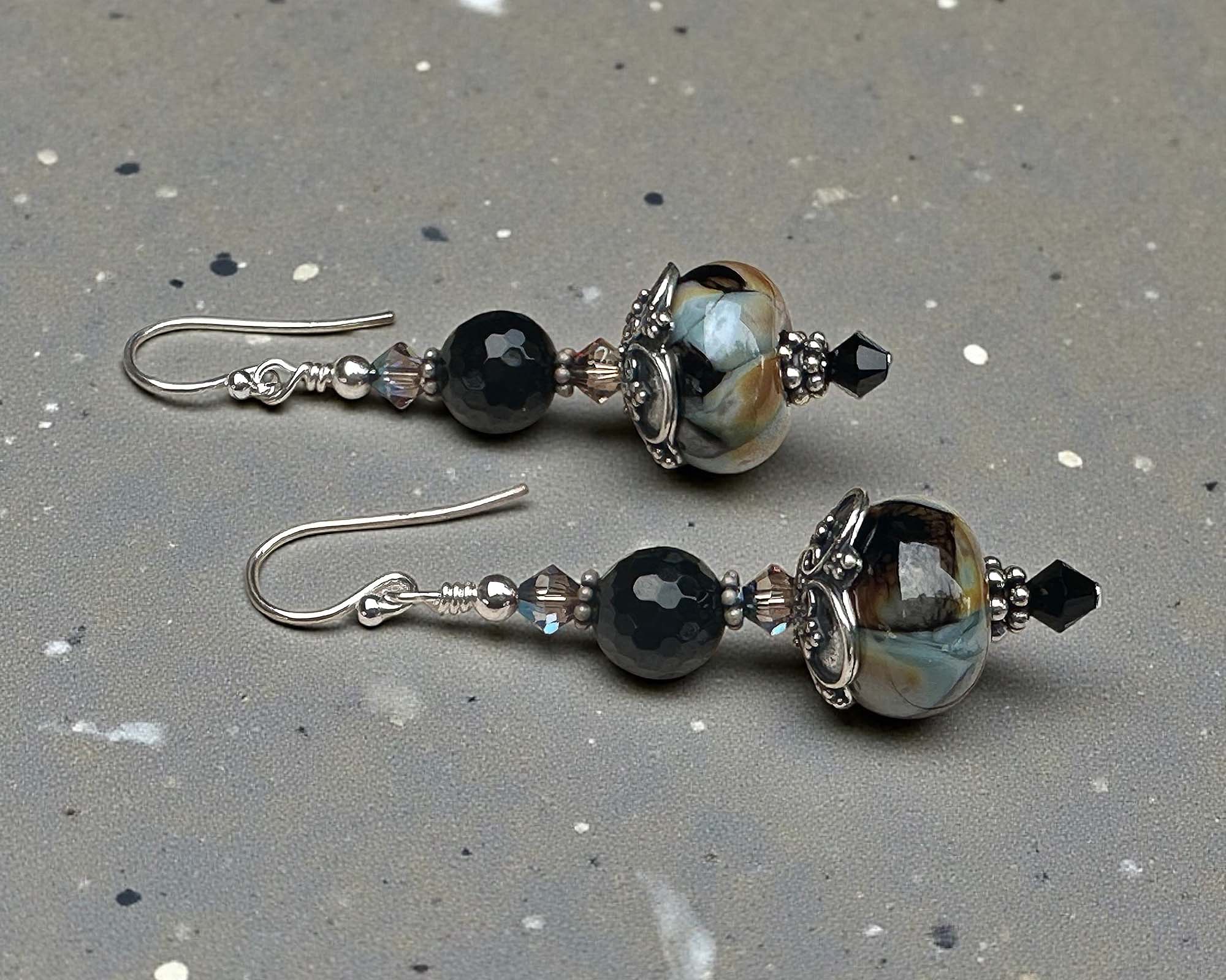 The lampwork focal beads are complemented by faceted black agate gemstones for natural contrast and grounding elegance, along with gray and black Swarovski Austrian crystals that add subtle sparkle and light play. Ornate Bali .925 sterling silver accents provide texture and artisan detail, while sterling silver ear wires complete the design with comfortable everyday wearability.
