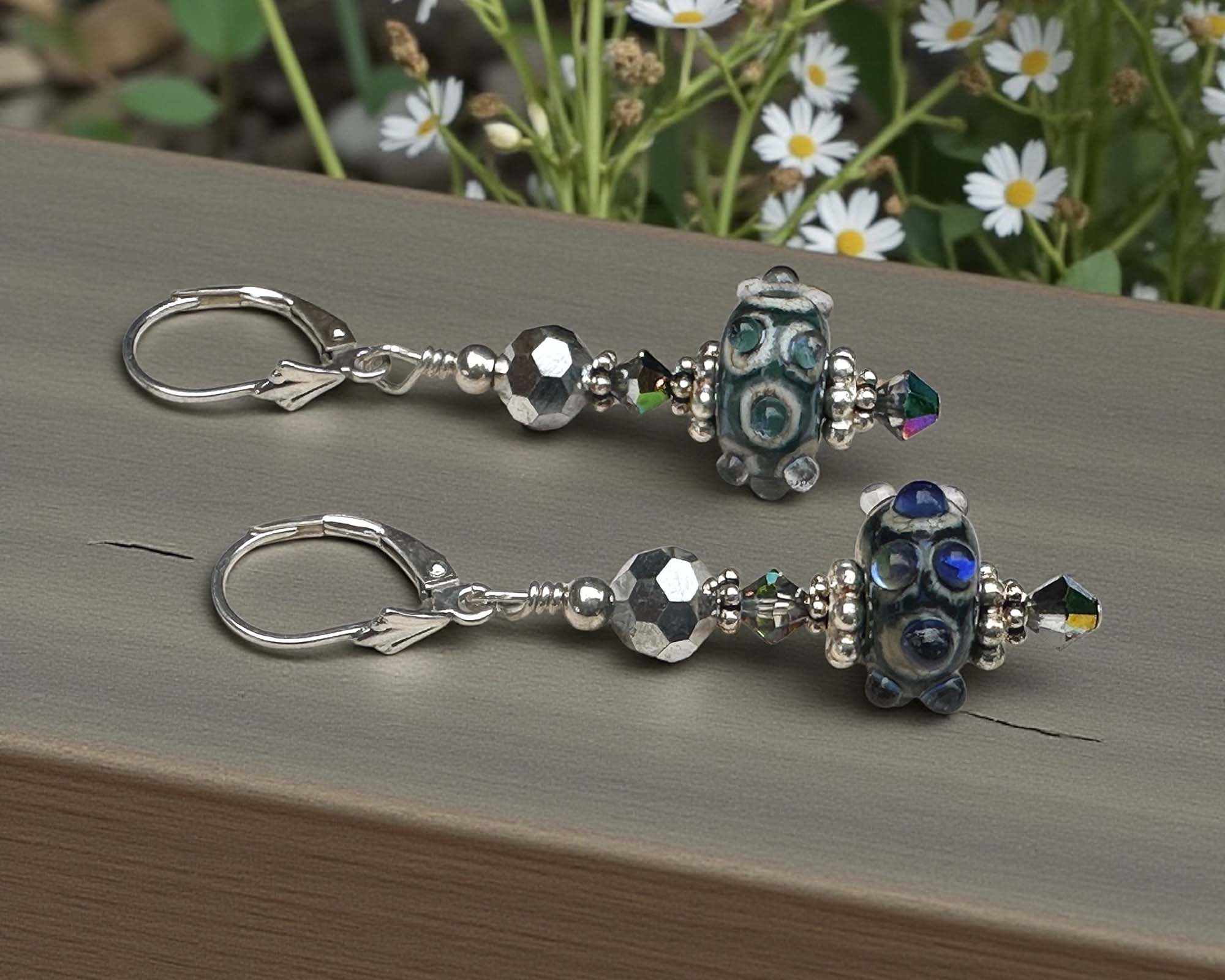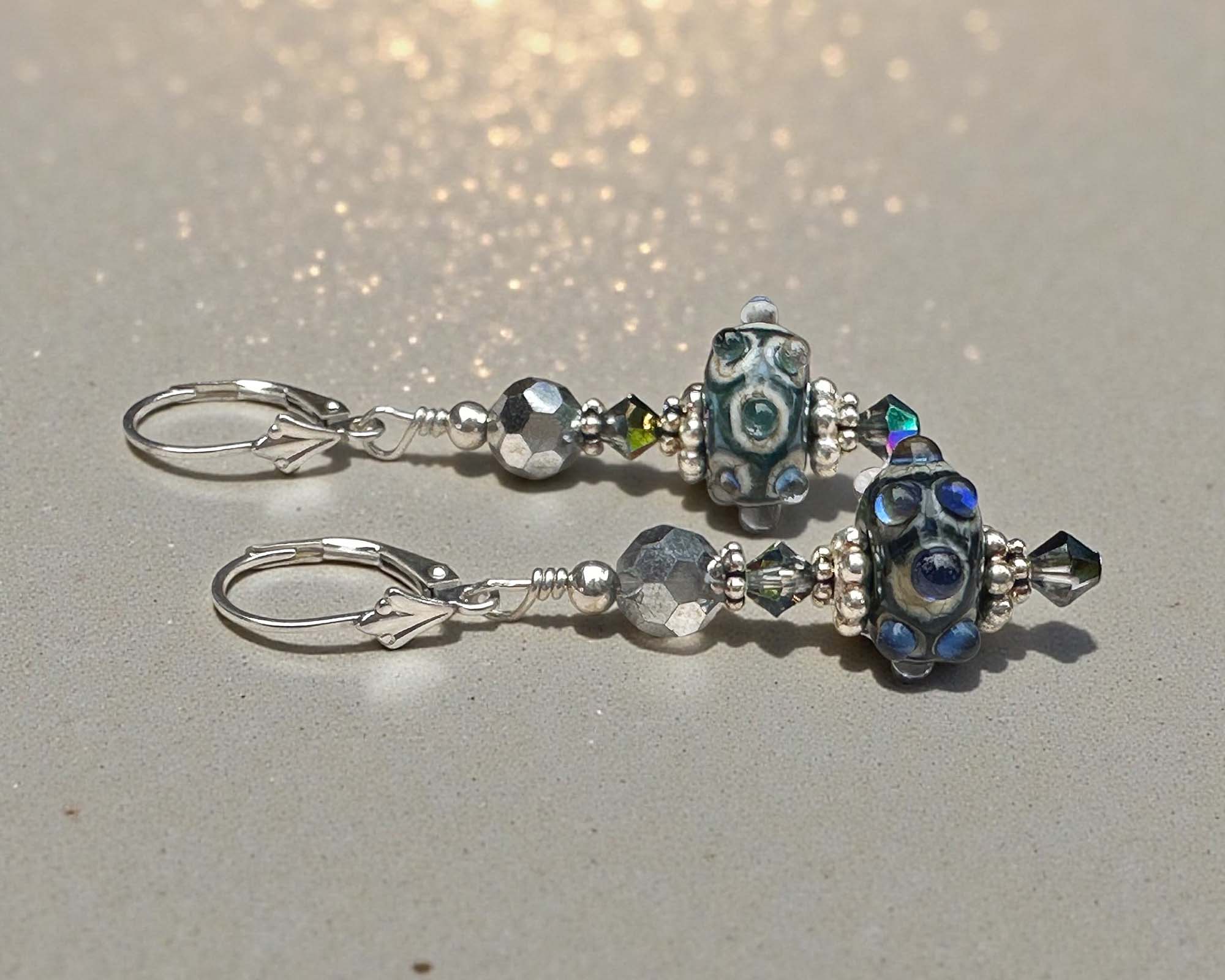 These beautiful, one-of-a-kind handmade earrings feature luminous metallic silver-blue lampwork glass beads that shimmer with depth and dimensional character. Individually formed in the flame in my studio using Double Helix and Effetre glass, each bead develops unique tonal variations of steel blue, grey, and subtle metallic highlights that cannot be replicated — making every pair a wearable piece of glass art.