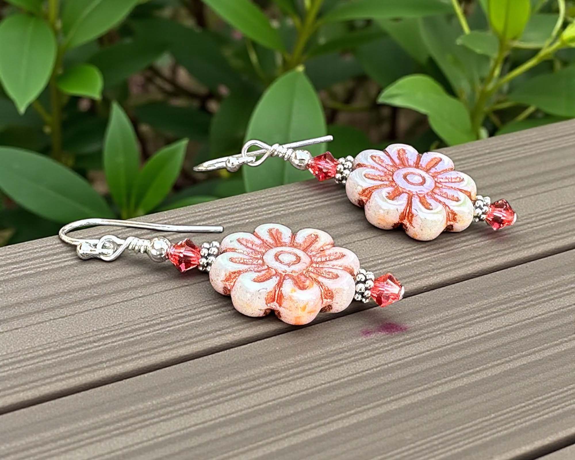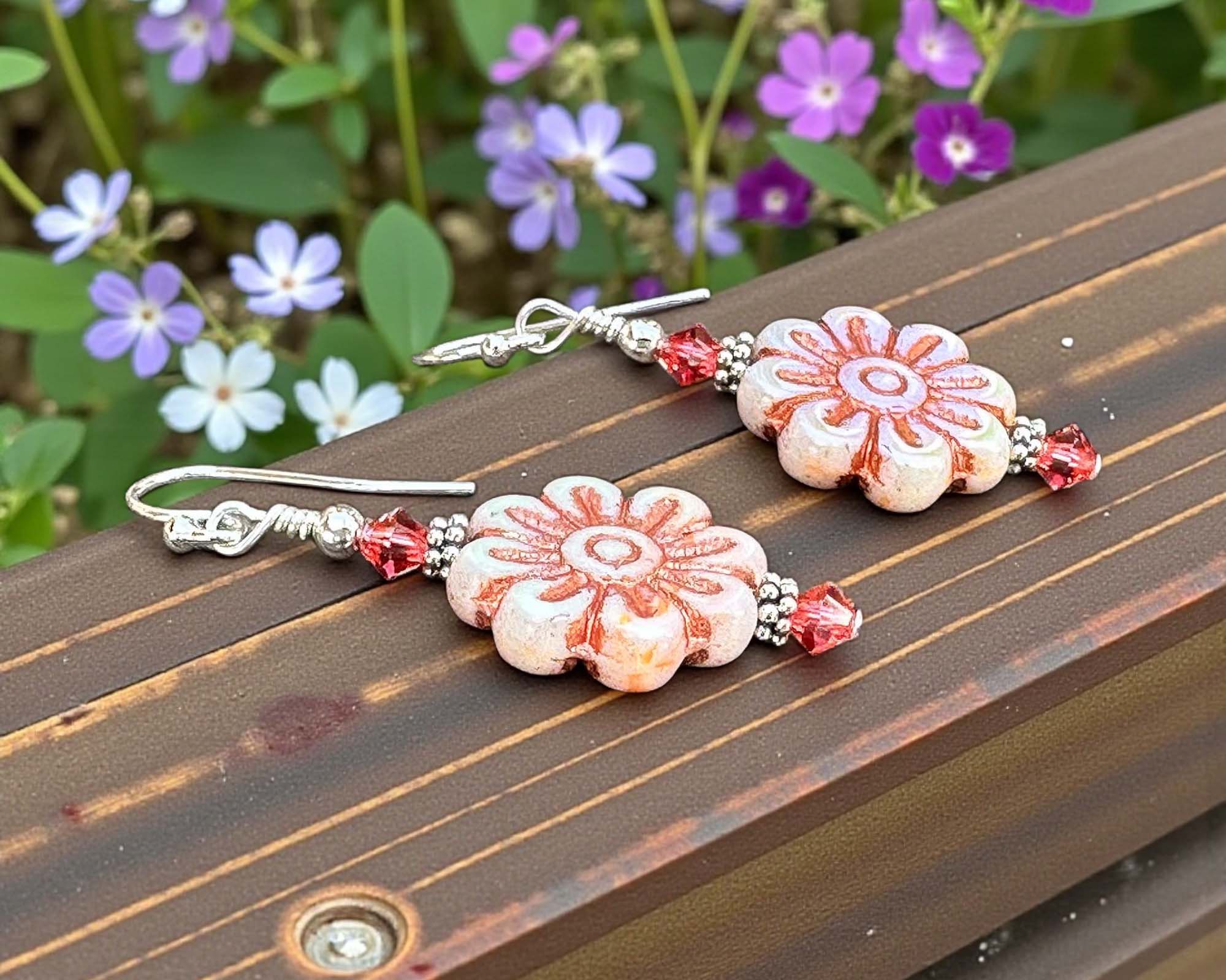 Step into a world of botanical bliss with these charming 1 3/4 inch pink floral earrings, expertly crafted with Bali .925 silver and sterling silver accents. Adorned with exquisite Czech pressed flower glass beads and radiant coral pink crystals, they shimmer and shine with every turn of your head. From casual coffee runs to fancy nights out, these whimsical wonders inject instant flair and personality into any outfit. Constructed with premium materials built to last, you'll reach for them time and time again. Perfect for free spirits who love one-of-a-kind pieces or anyone seeking a delightful gift, these blooming beauties are sure to make a statement. Watch your everyday look transform into something absolutely magical!