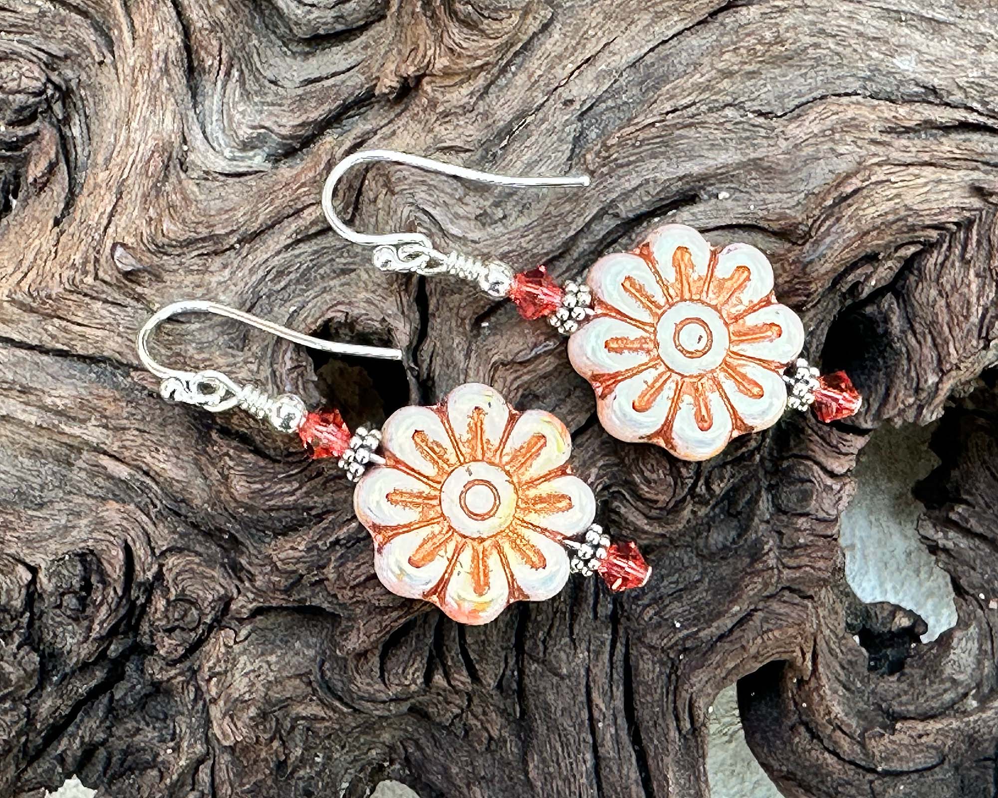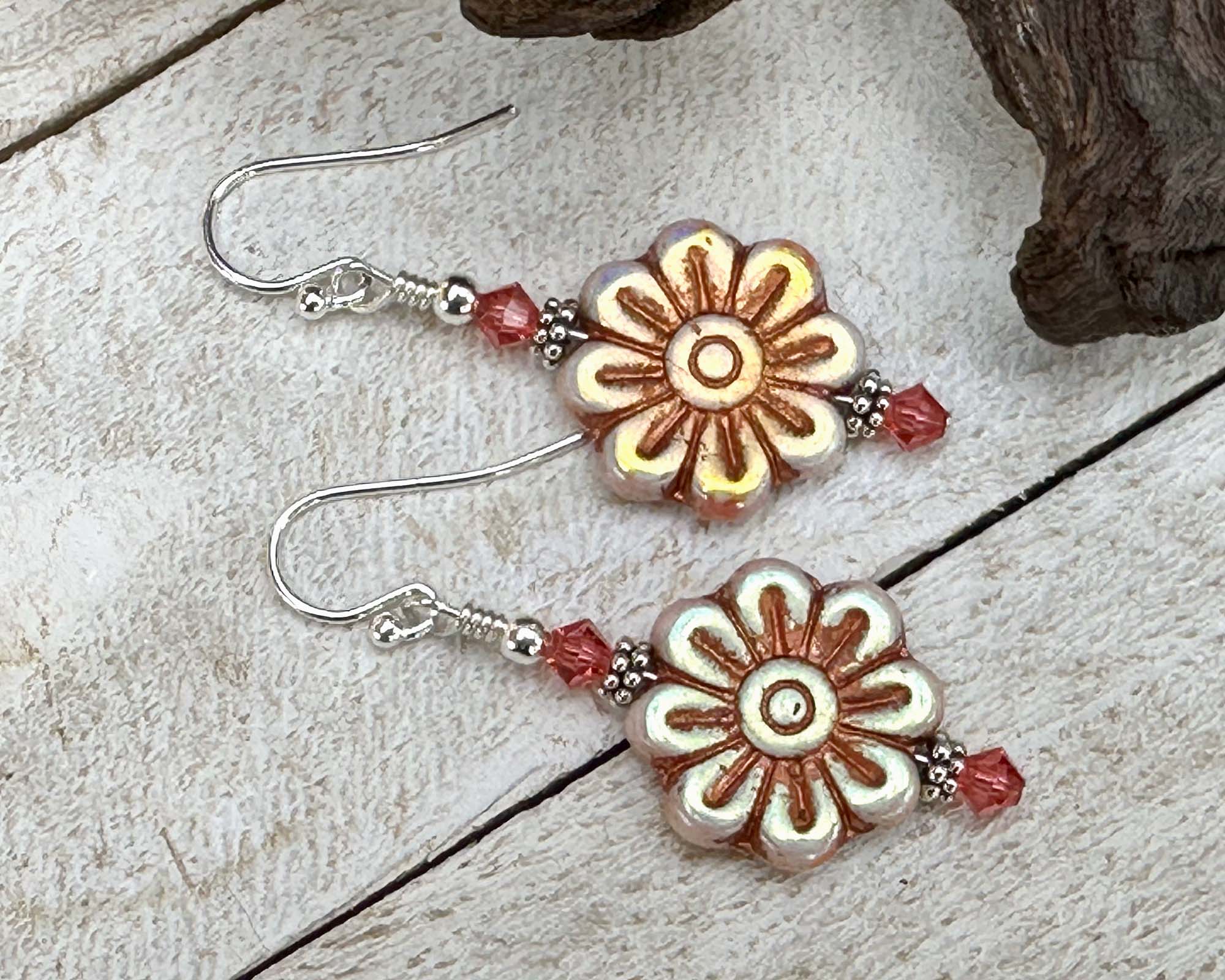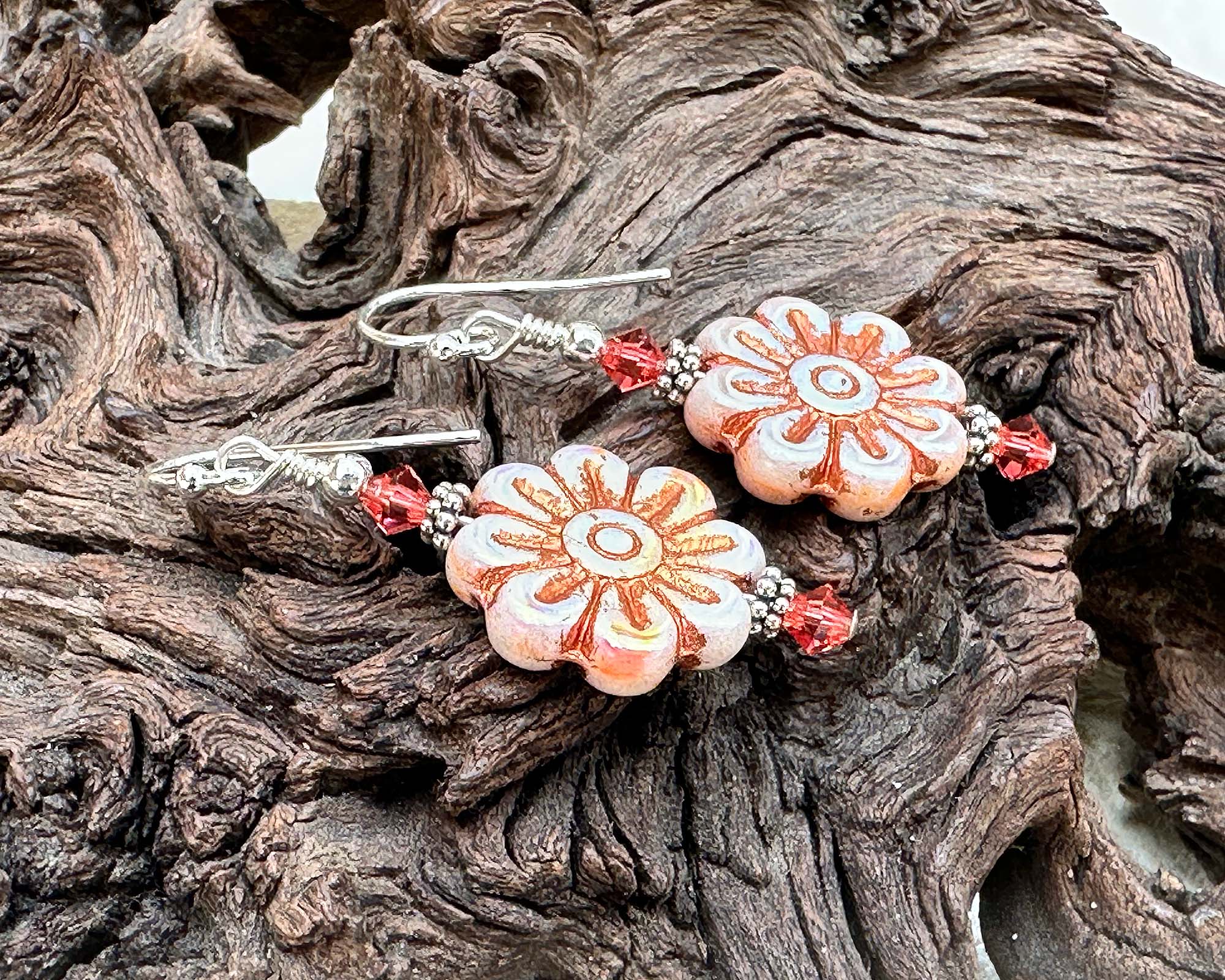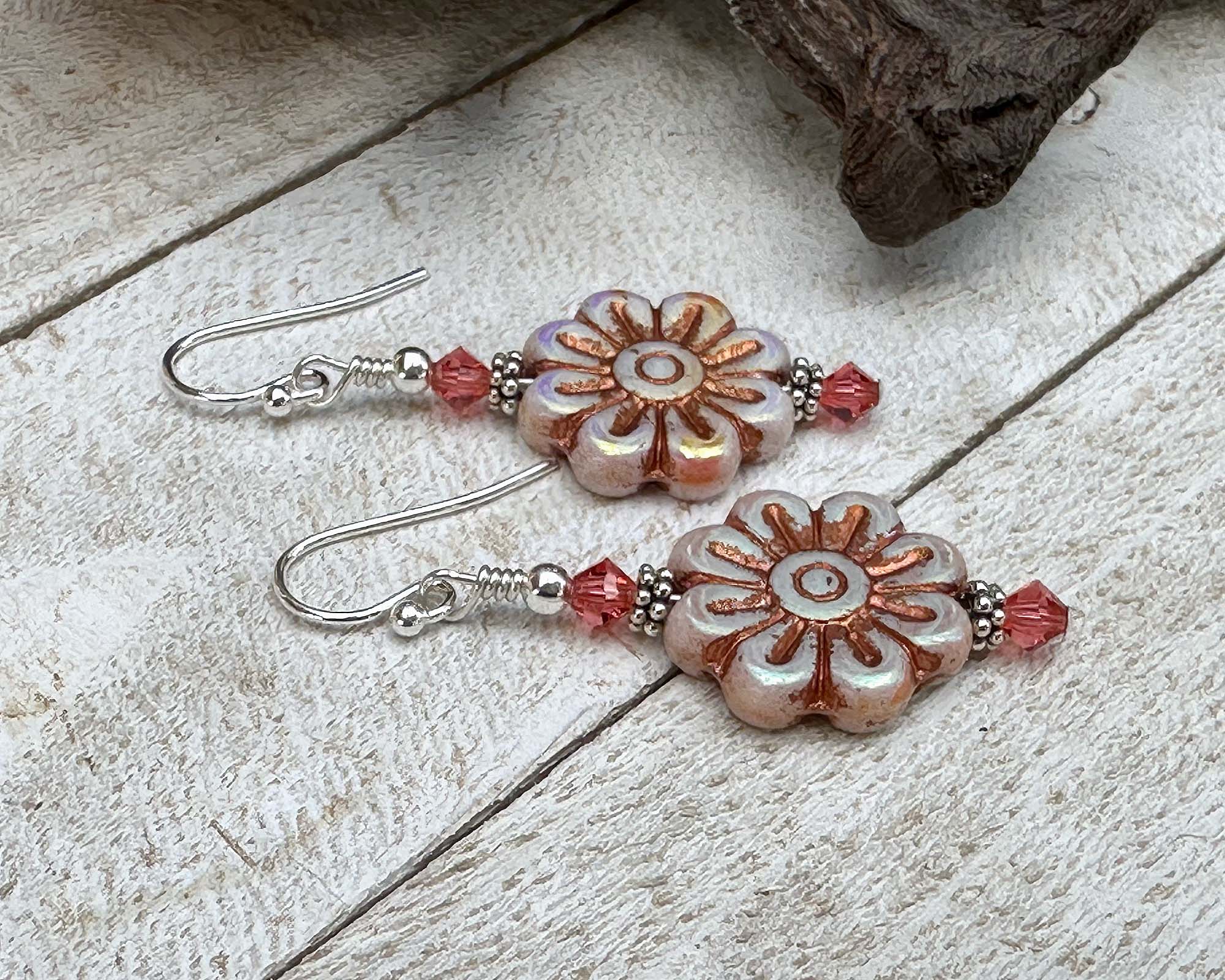 Embrace nature's charm with these delightful 1 3/4 inch pink floral earrings, expertly designed using Bali .925 silver and sterling silver. Each earring features beautiful peach Czech pressed flower glass beads paired with luminous coral pink crystals that dance with light. Whether you're grabbing coffee with friends or heading to an elegant soirée, these playful botanical treasures add instant character and sparkle to your style. Made from quality materials that withstand everyday wear, they're destined to become your go-to favorites. Ideal for bohemian jewelry lovers or anyone hunting for a meaningful gift, these blooming stunners deliver undeniable charm and pizzazz. Let them turn your ordinary day into something truly enchanting!