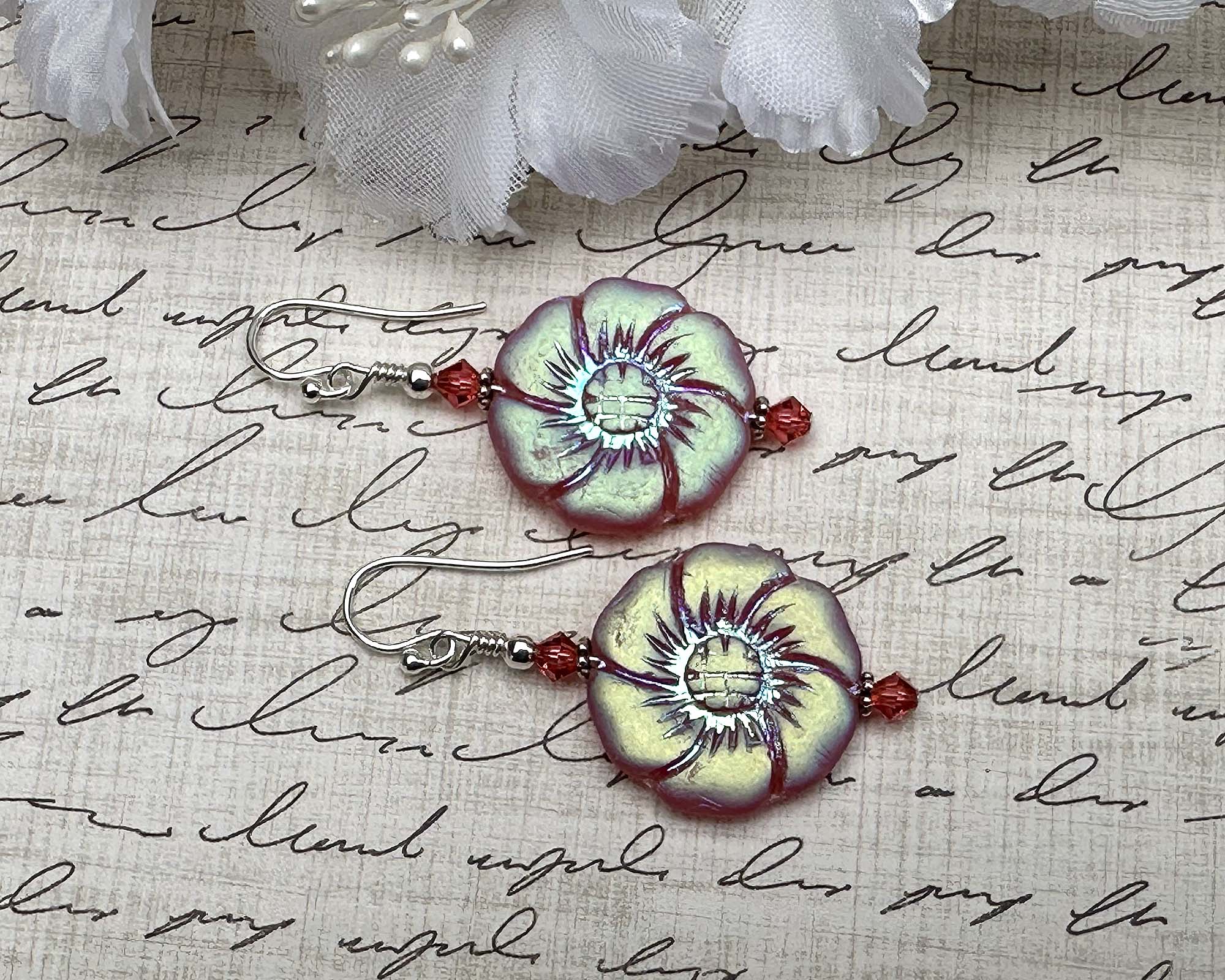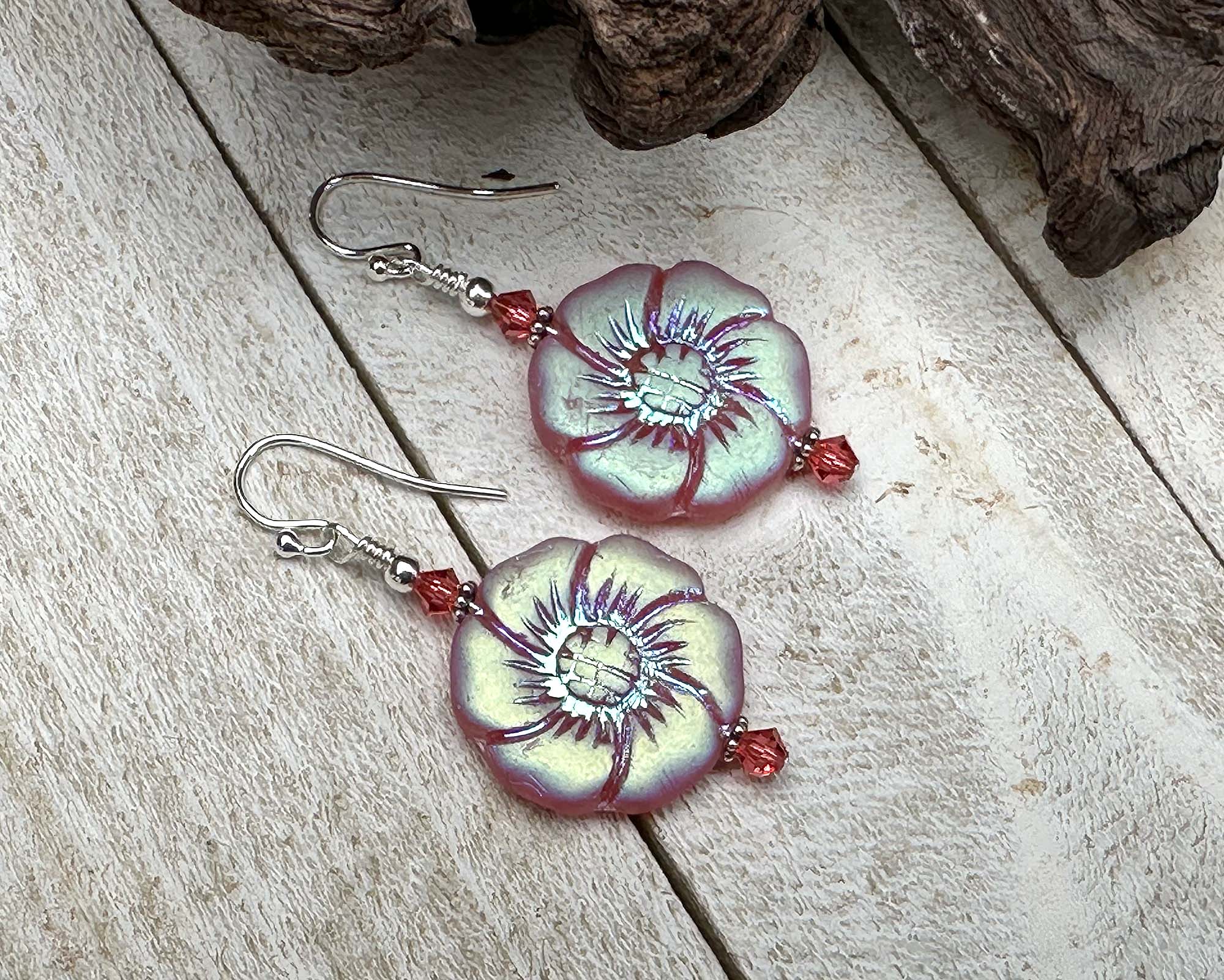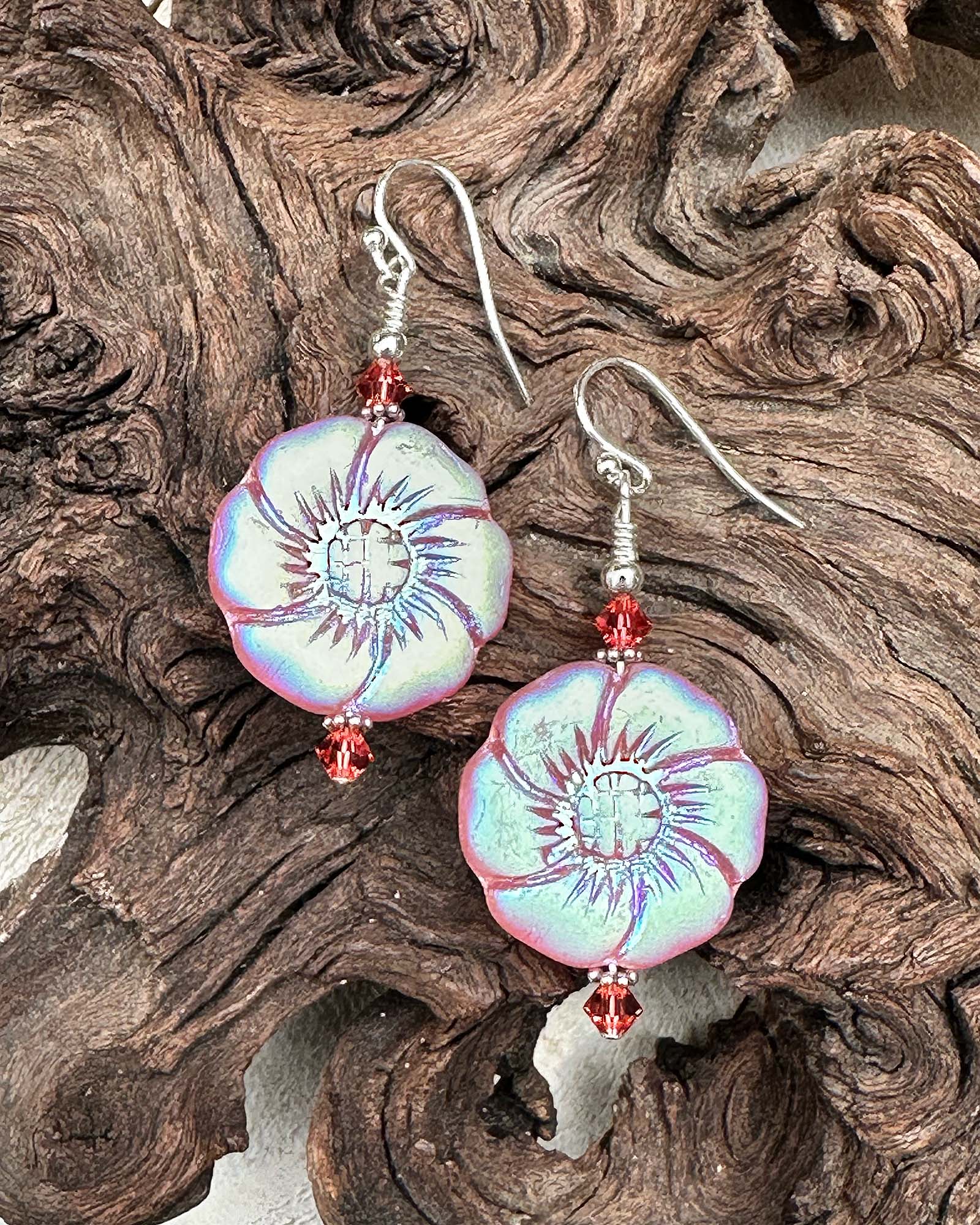 Add a vibrant touch to your jewelry collection with these exquisite 2-inch pink floral Bali .925 silver earrings. Each earring features striking Czech pressed flower glass beads, coral pink crystals, Bali .925 silver beads, and sterling silver components. The delicate floral design brings a whimsical charm to any outfit, whether you're dressing up for a special occasion or adding flair to your everyday look. These beautifully crafted earrings showcase quality materials that promise lasting elegance and durability. Perfect for anyone who loves nature-inspired jewelry with personality, they make a thoughtful gift for the bohemian spirit in your life. Let these blooming beauties become your new go-to accessory for making a colorful statement. One side of the flower has iridescent accents and the other side is plain pink.