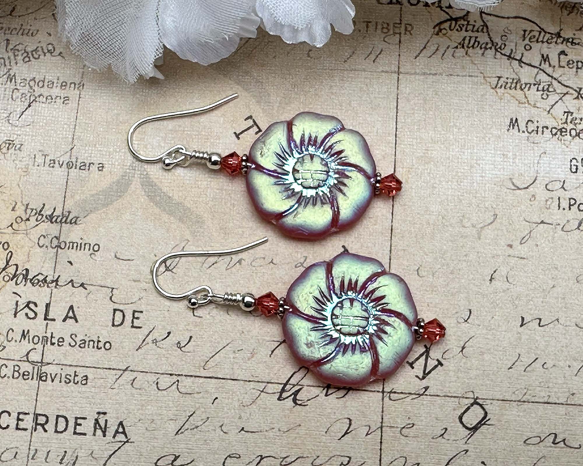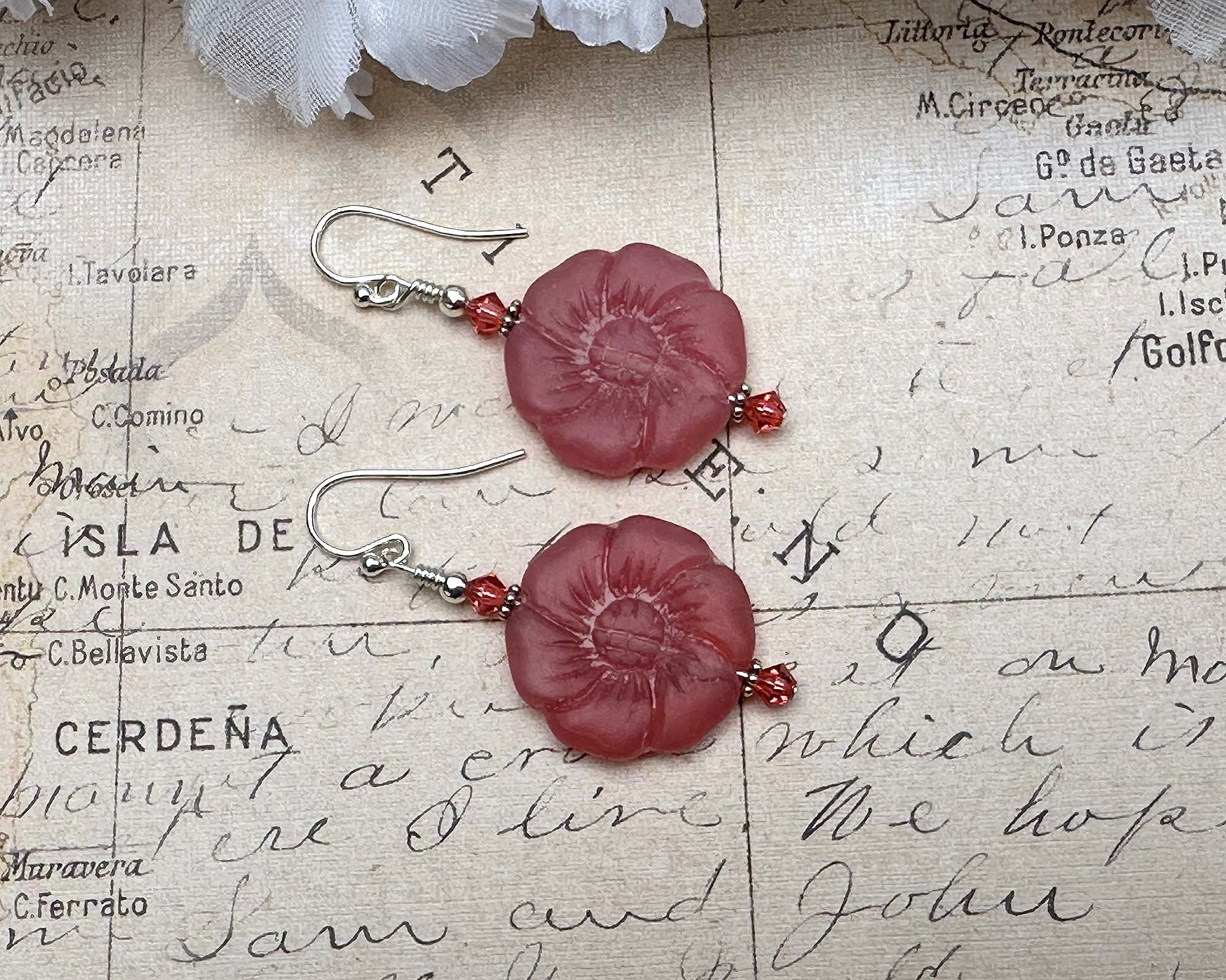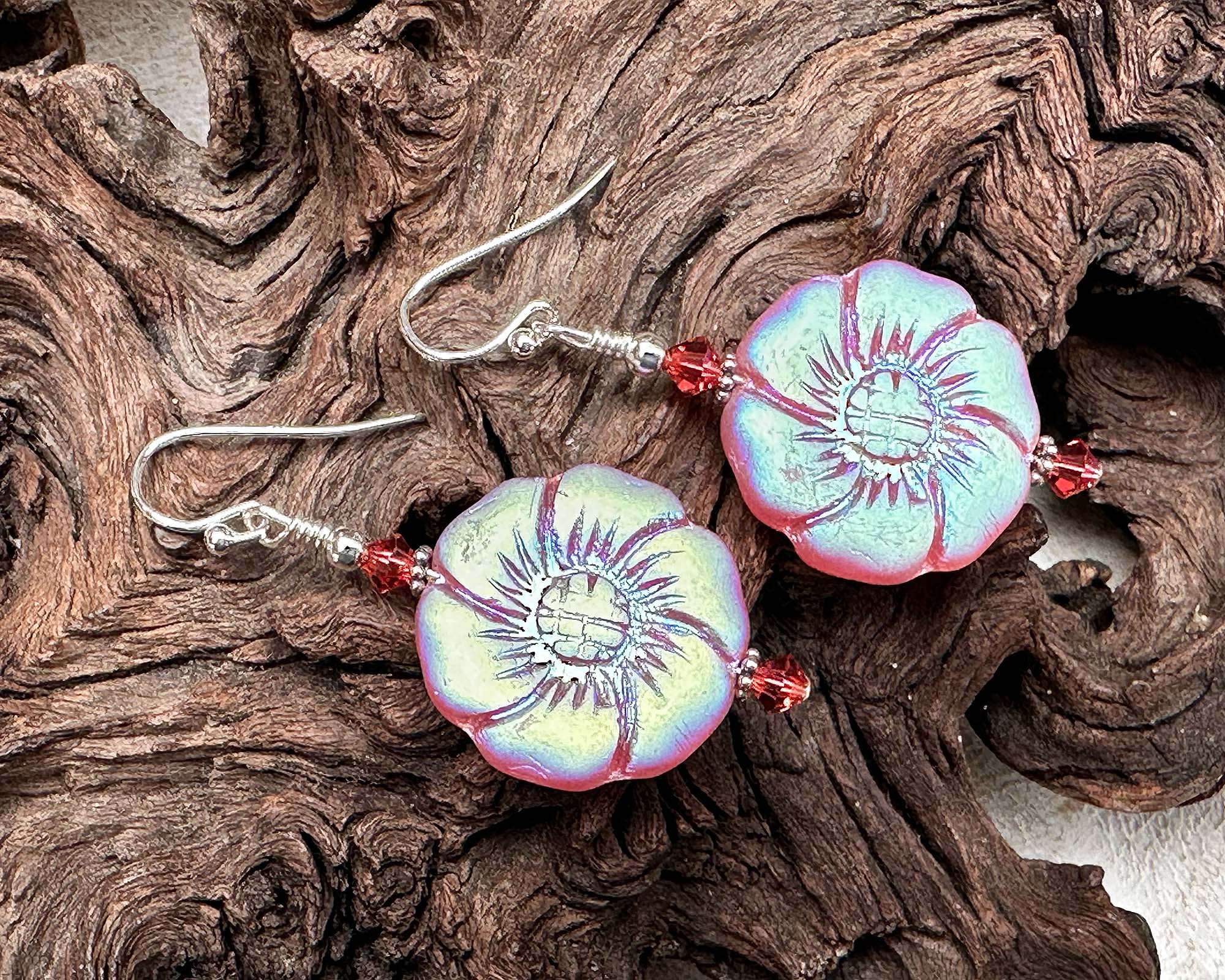 Add a vibrant touch to your jewelry collection with these exquisite 2-inch pink floral Bali .925 silver earrings. Each earring features striking Czech pressed flower glass beads, coral pink crystals, Bali .925 silver beads, and sterling silver components. The delicate floral design brings a whimsical charm to any outfit, whether you're dressing up for a special occasion or adding flair to your everyday look. These beautifully crafted earrings showcase quality materials that promise lasting elegance and durability. Perfect for anyone who loves nature-inspired jewelry with personality, they make a thoughtful gift for the bohemian spirit in your life. Let these blooming beauties become your new go-to accessory for making a colorful statement. One side of the flower has iridescent accents and the other side is plain pink.