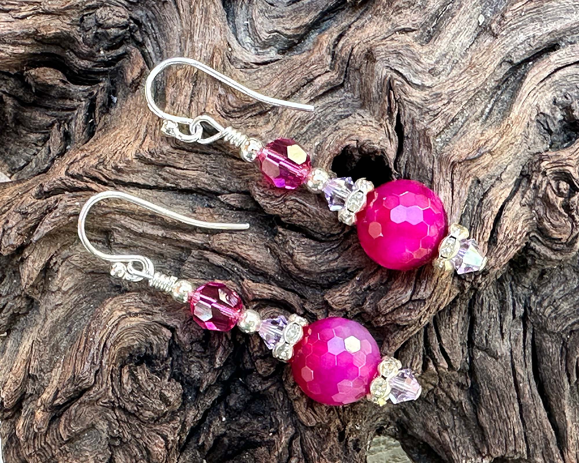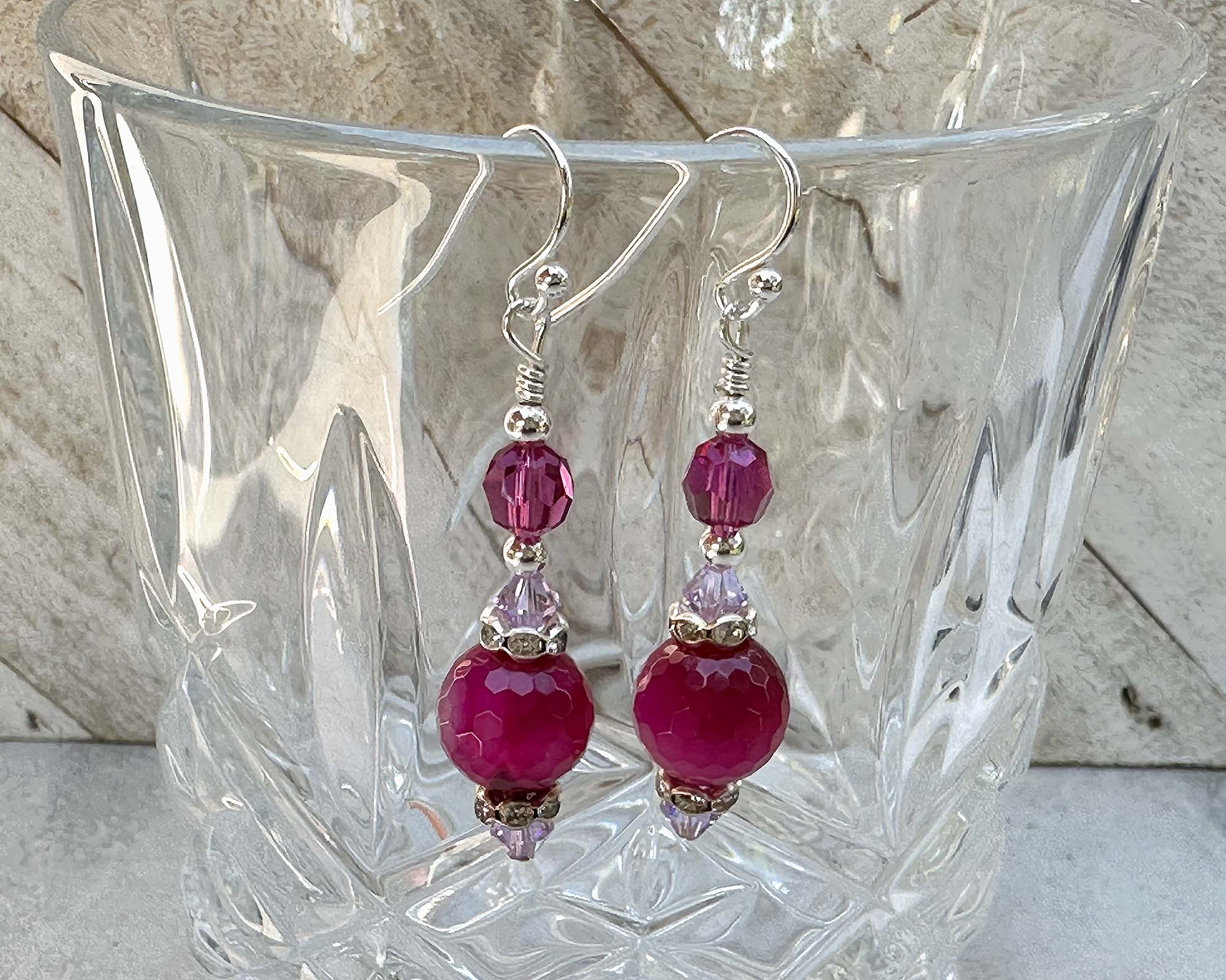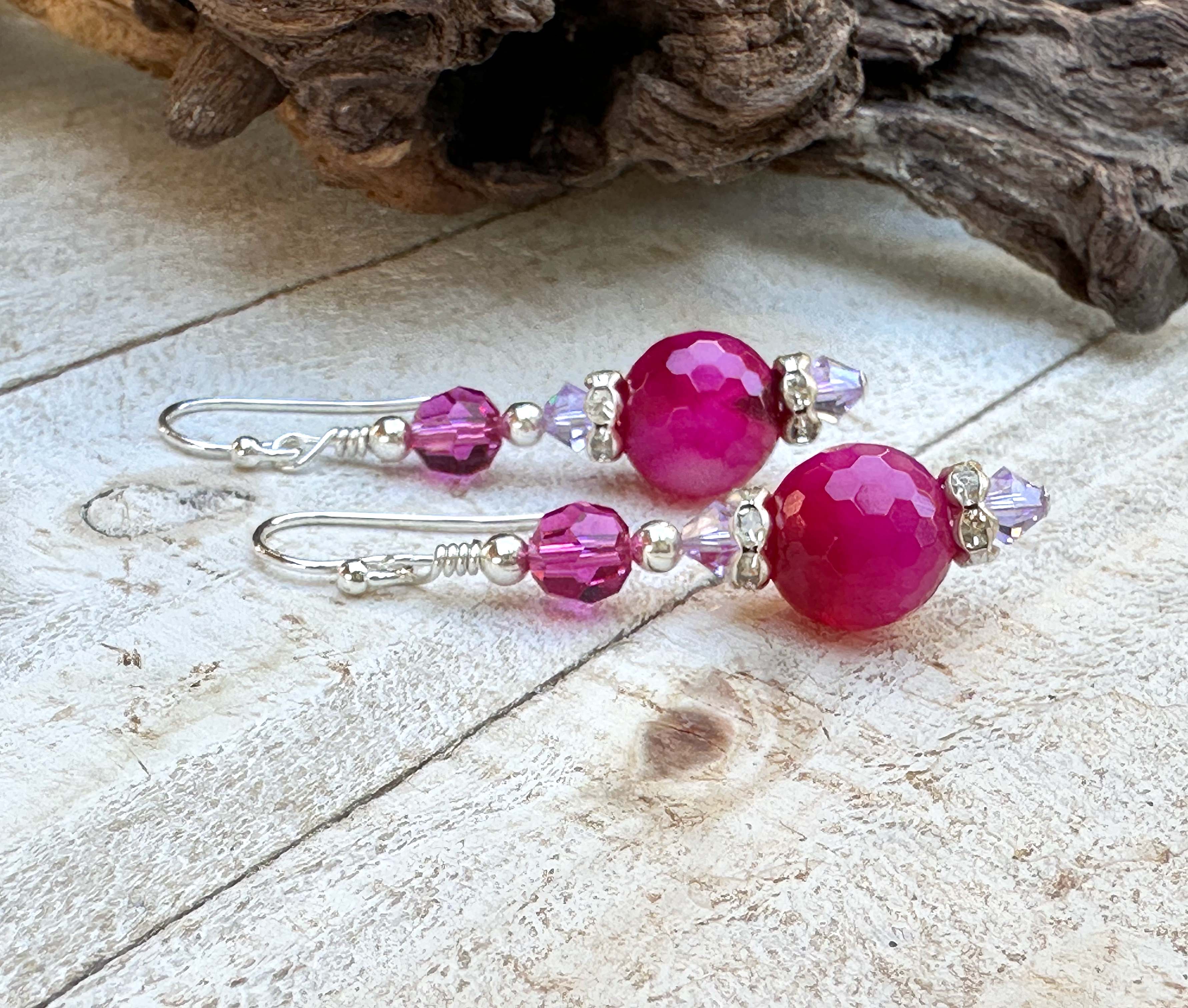 Add a vibrant touch to your jewelry collection with these exquisite 2-inch dyed pink quartz and Bali .925 silver earrings. Each earring features striking faceted pink quartz beads, radiating a rich fuchsia hue that perfectly complements the intricate Bali silver components. Fuchsia Swarovski crystals and lavender crystals accent these beautiful beads. Accented with delicate sterling silver earwires and shimmering titanium accents, these earrings blend elegance and modernity.