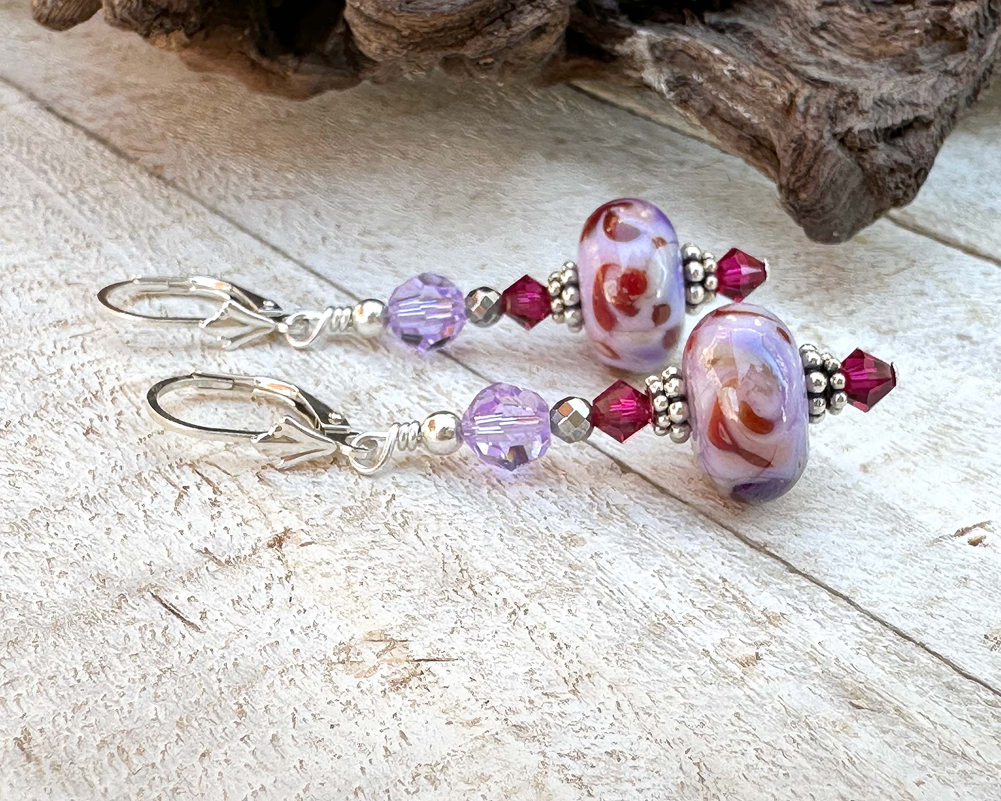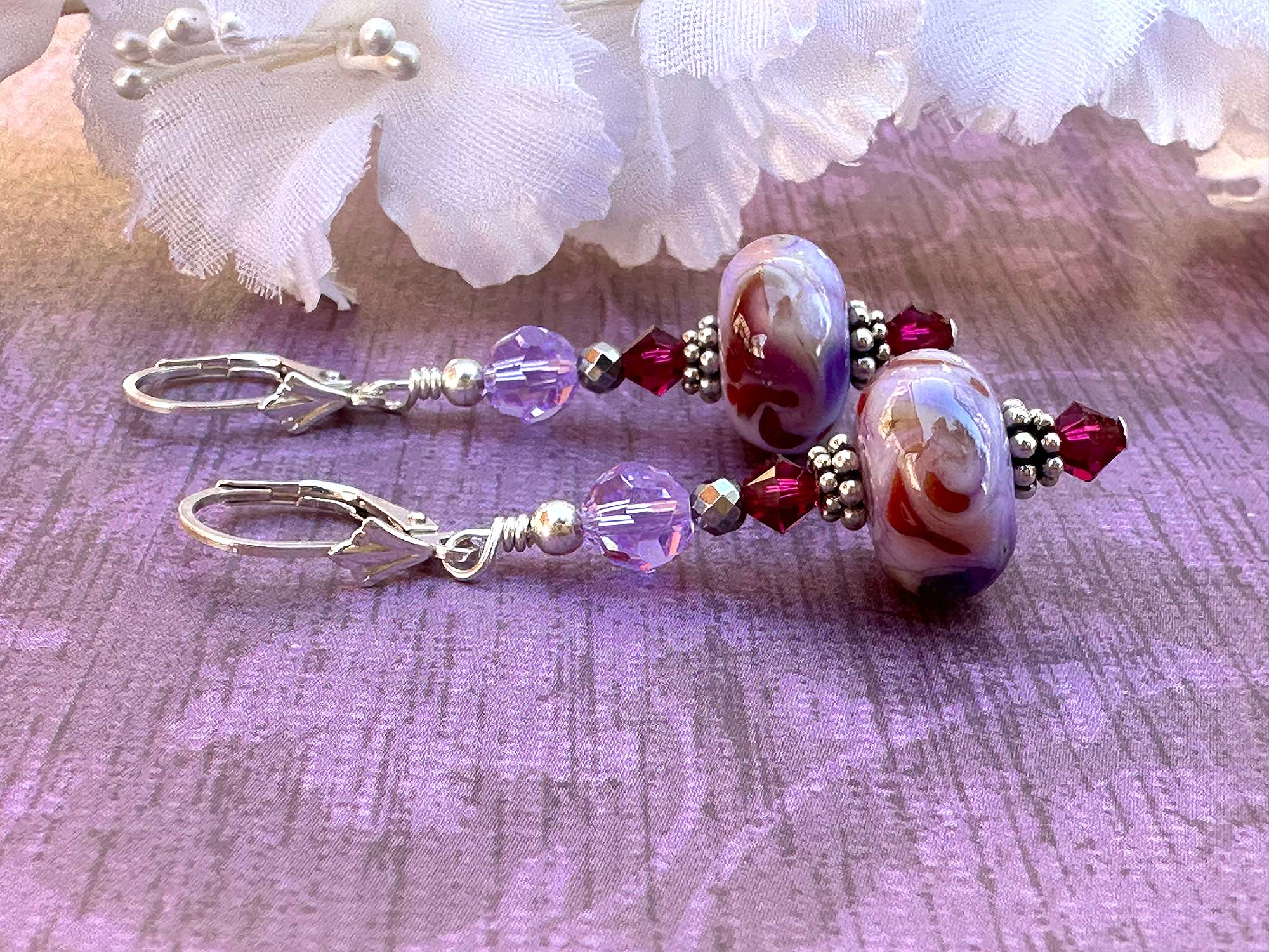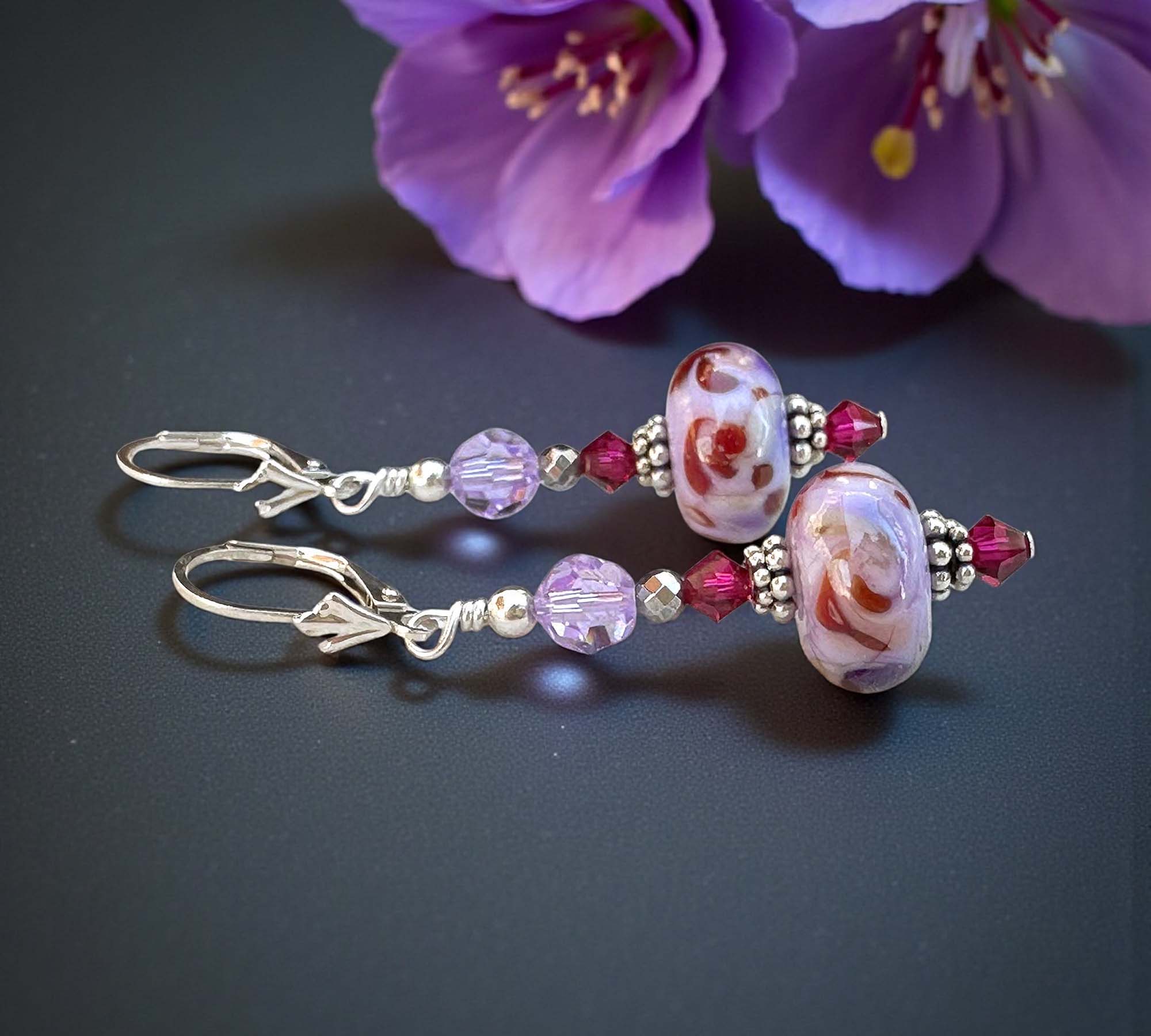 Ruby Lavender Lampwork Bead Earrings – Crafted by hand with sterling silver and sparkling faceted crystals for a vibrant touch.