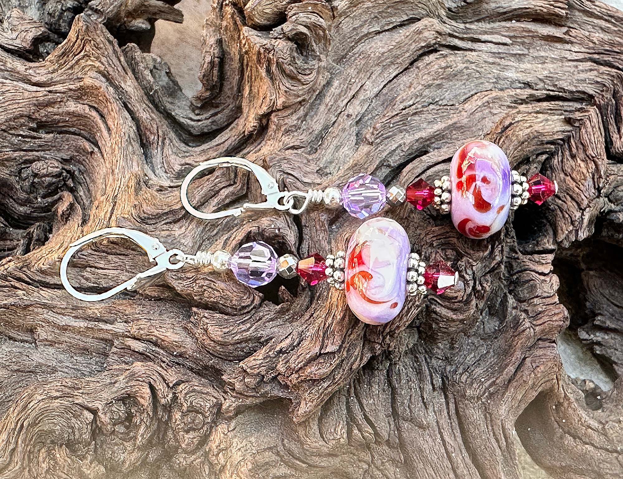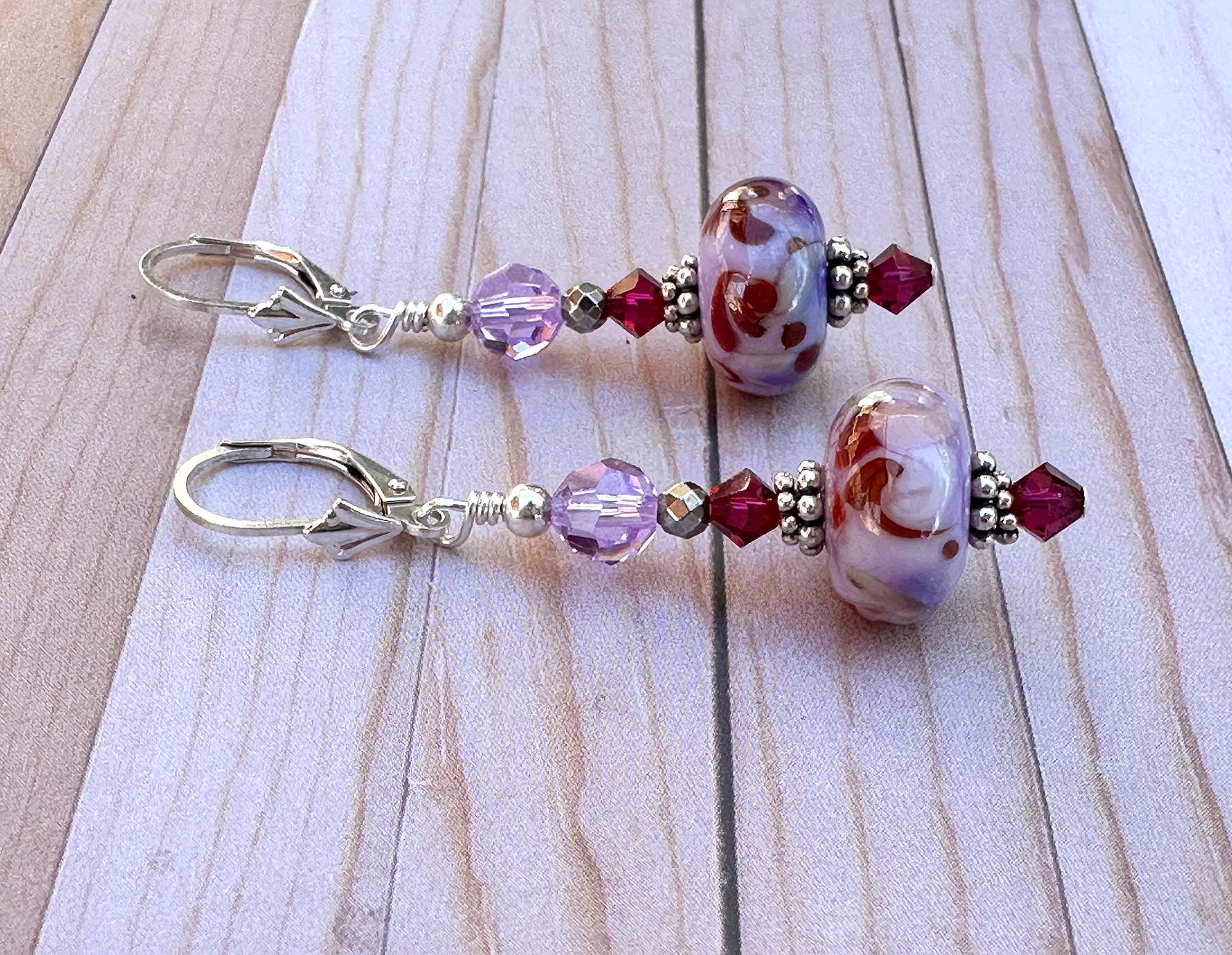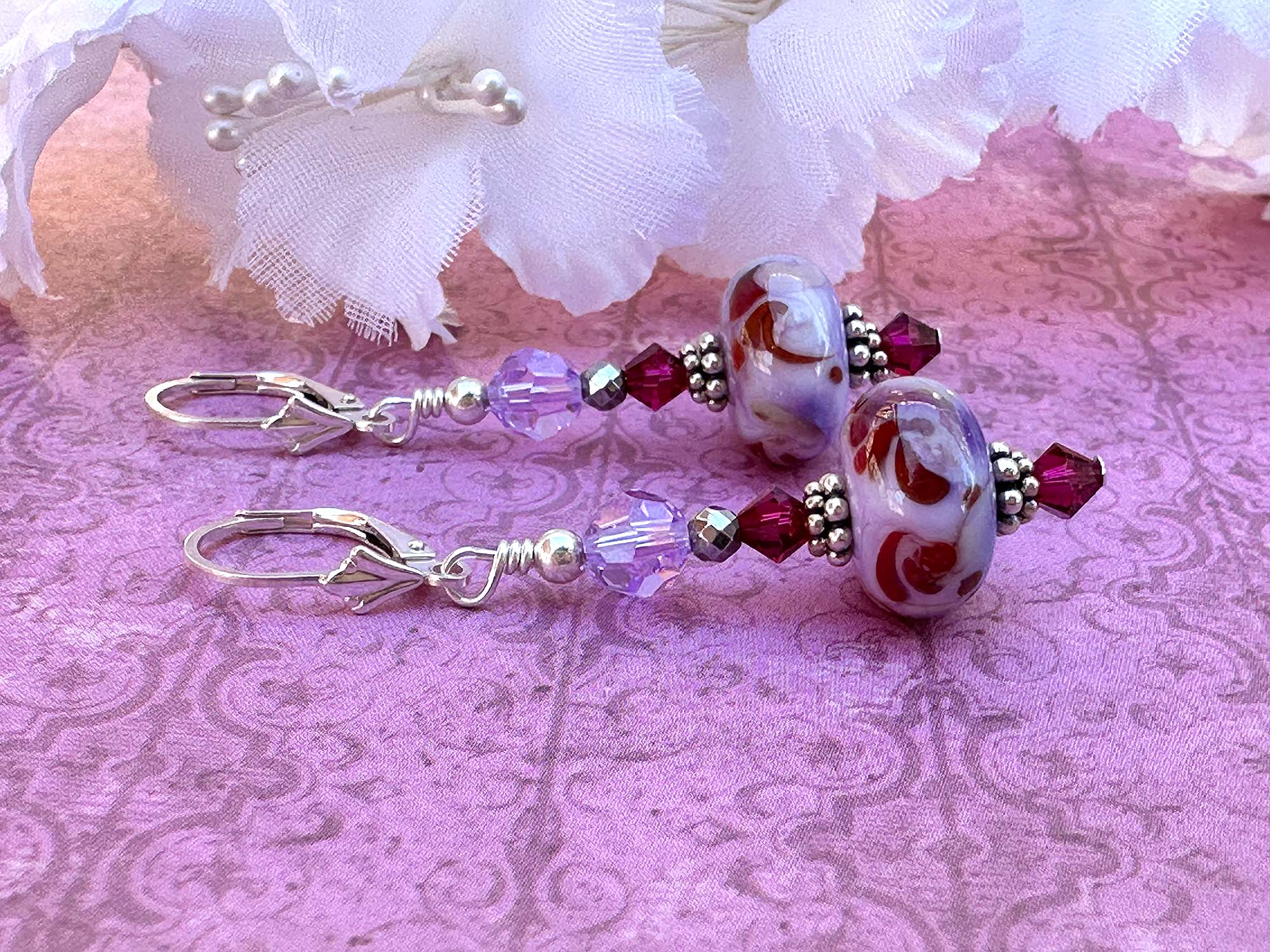 Ruby Lavender Lampwork Bead Earrings – Crafted by hand with sterling silver and sparkling faceted crystals for a vibrant touch.