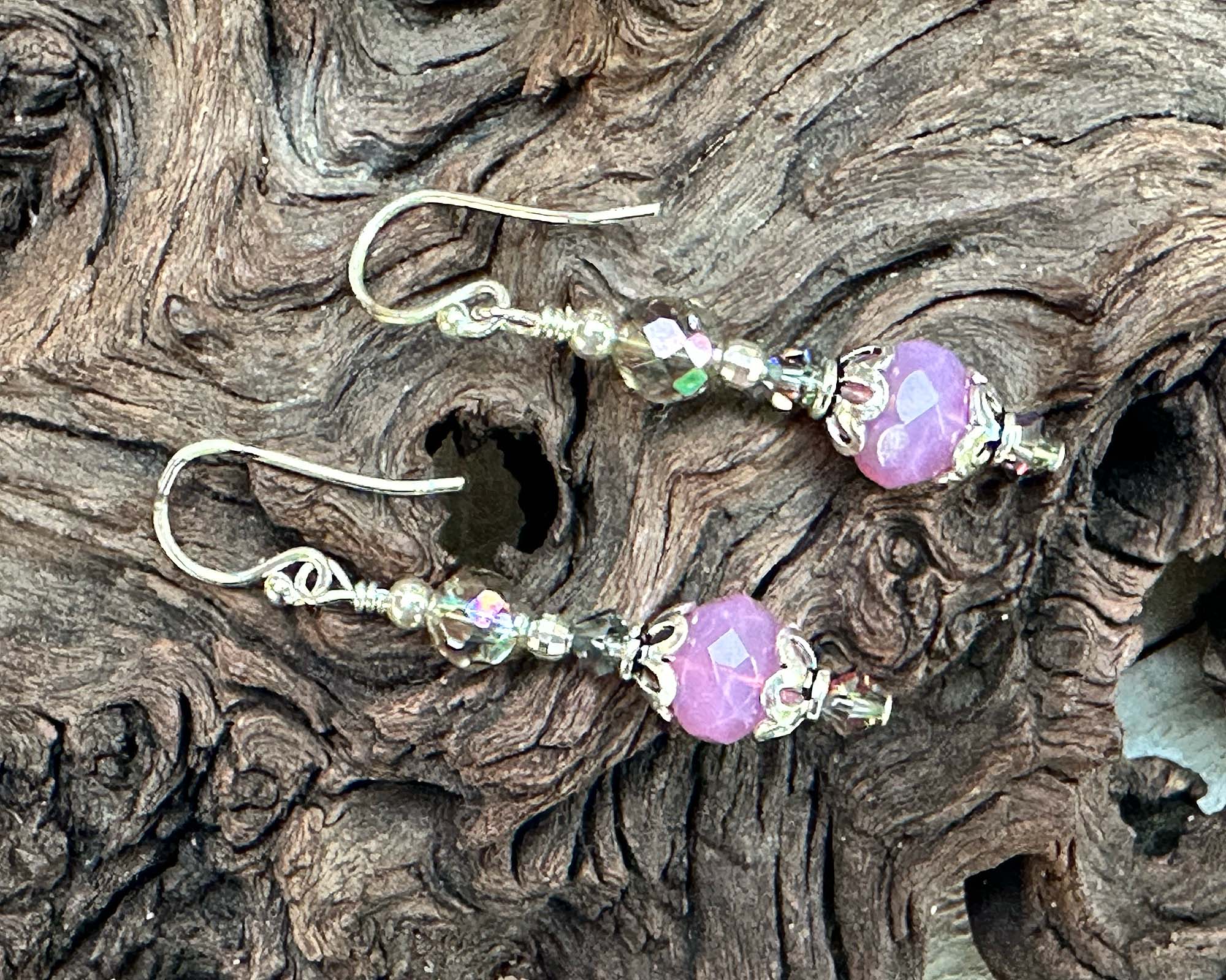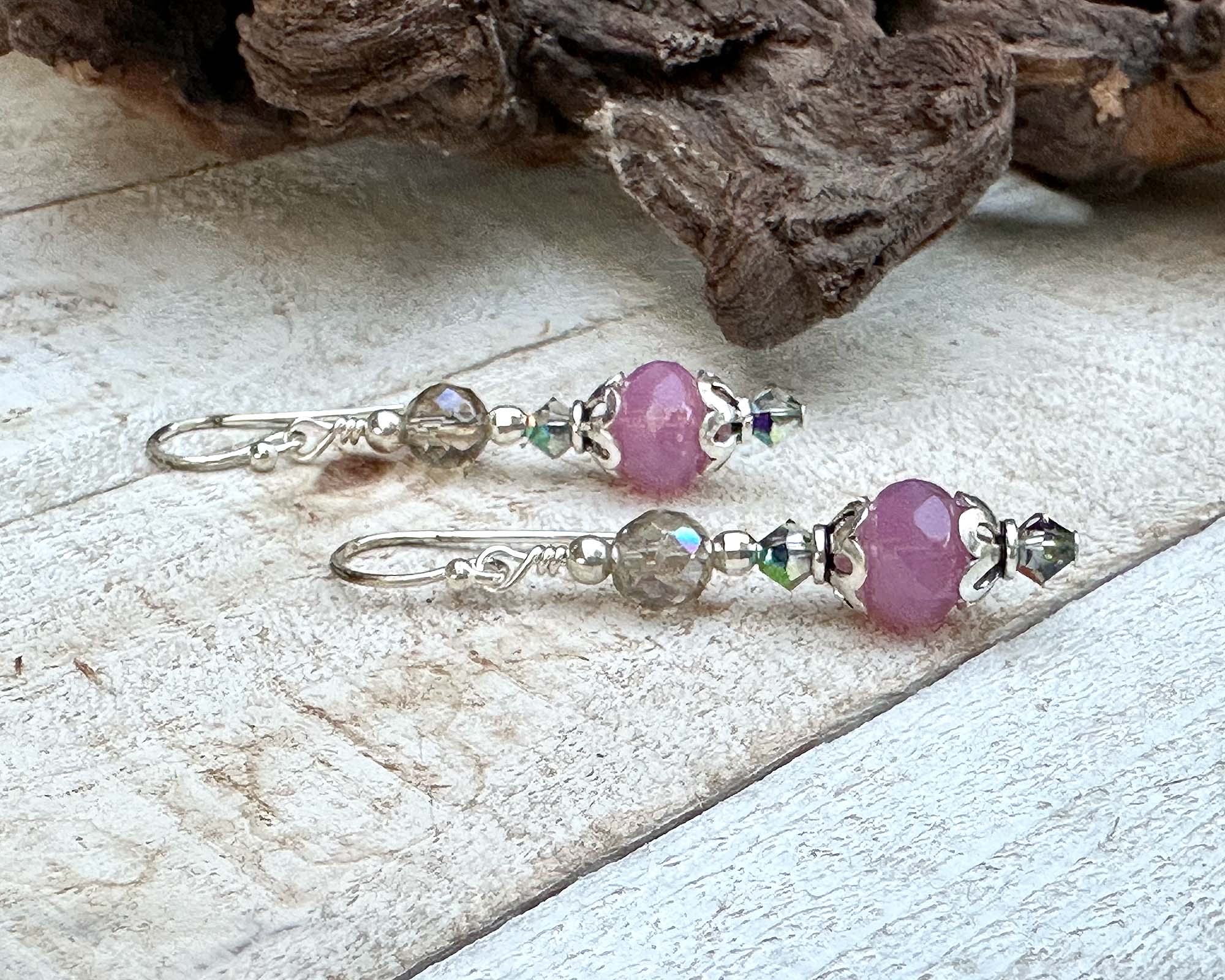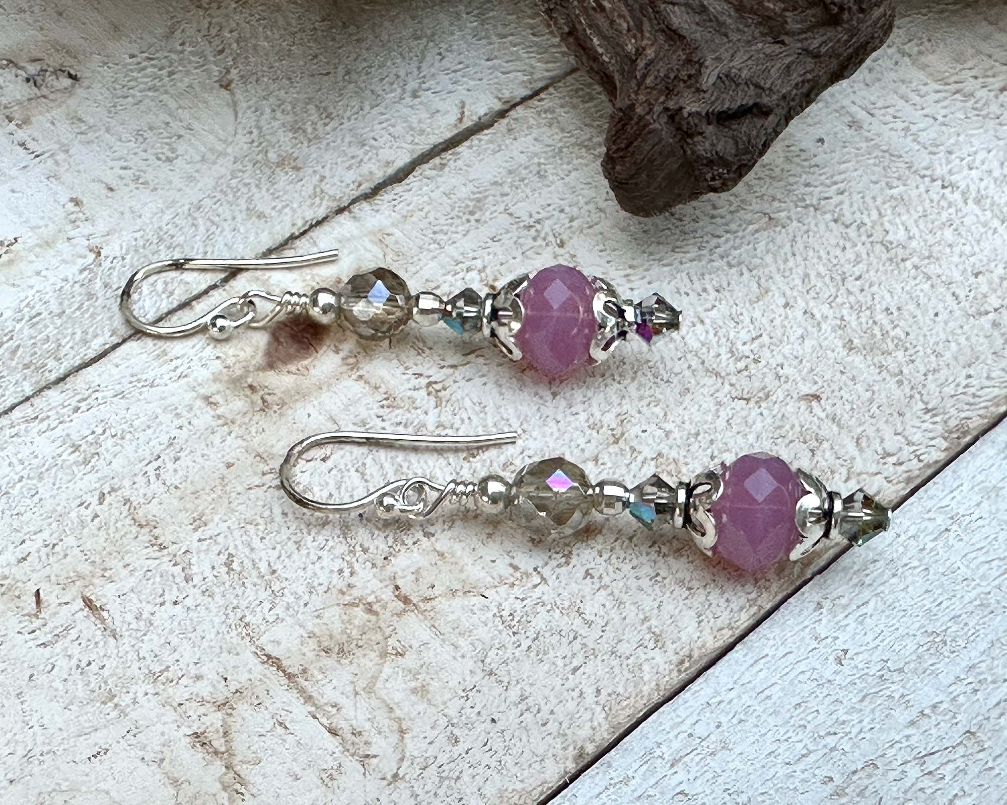 Add a touch of elegance to your accessory collection with these handcrafted 1 1/2 inch beaded rose crystal earrings. Each pair features dazzling vitrail Swarovski Austrian crystals that reflect a rainbow of colors, expertly paired with rose pink faceted Czech glass beads for a charmingly vibrant look.