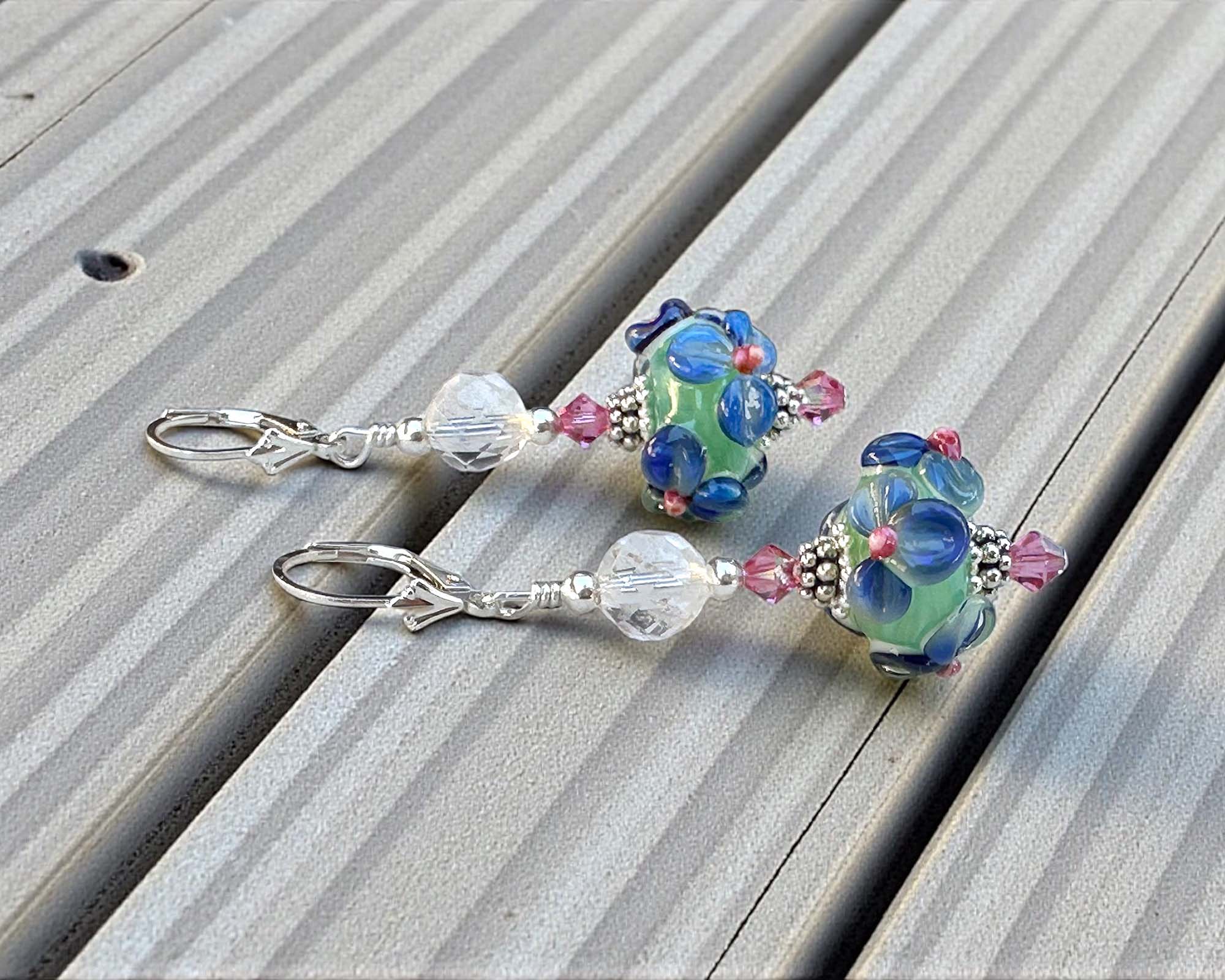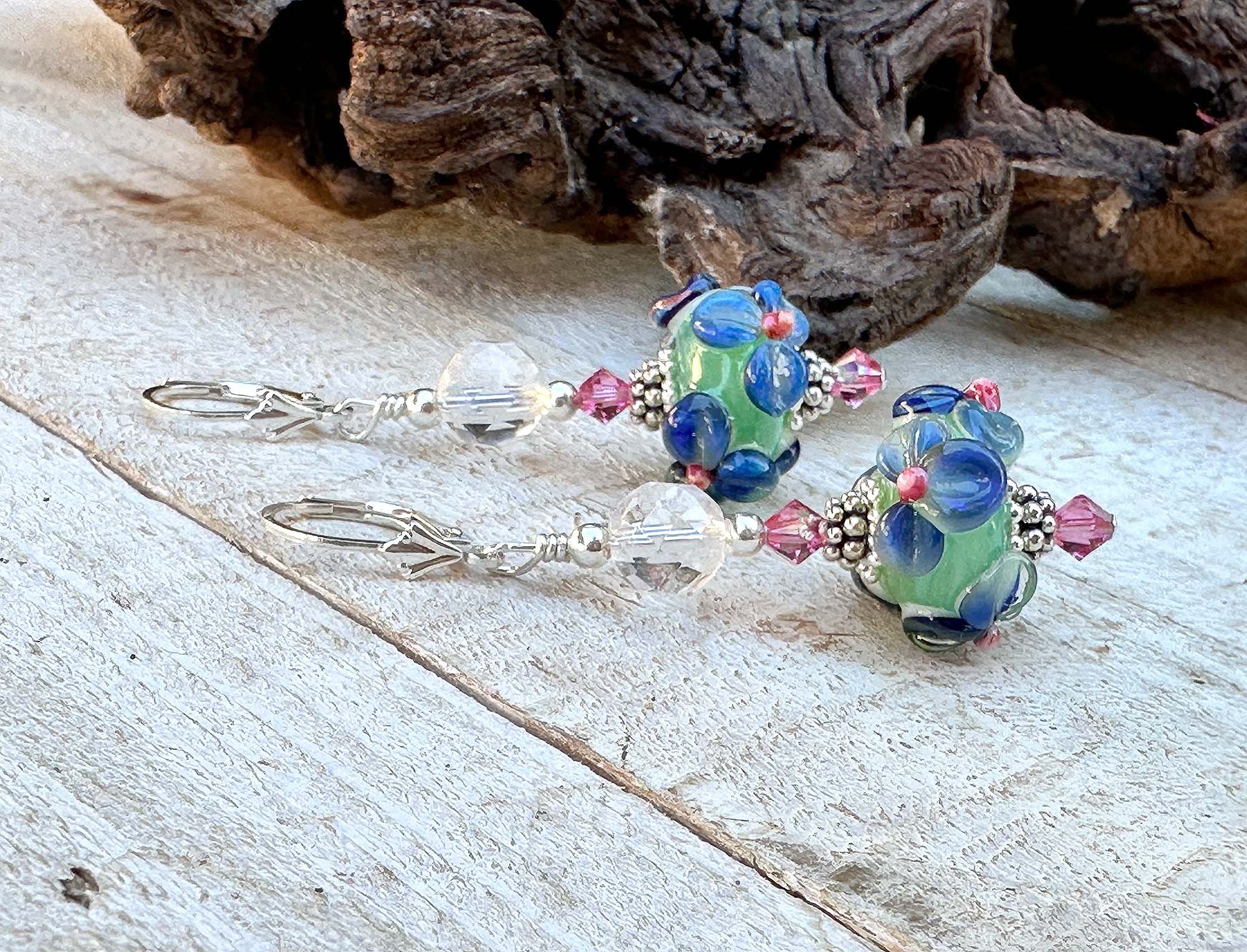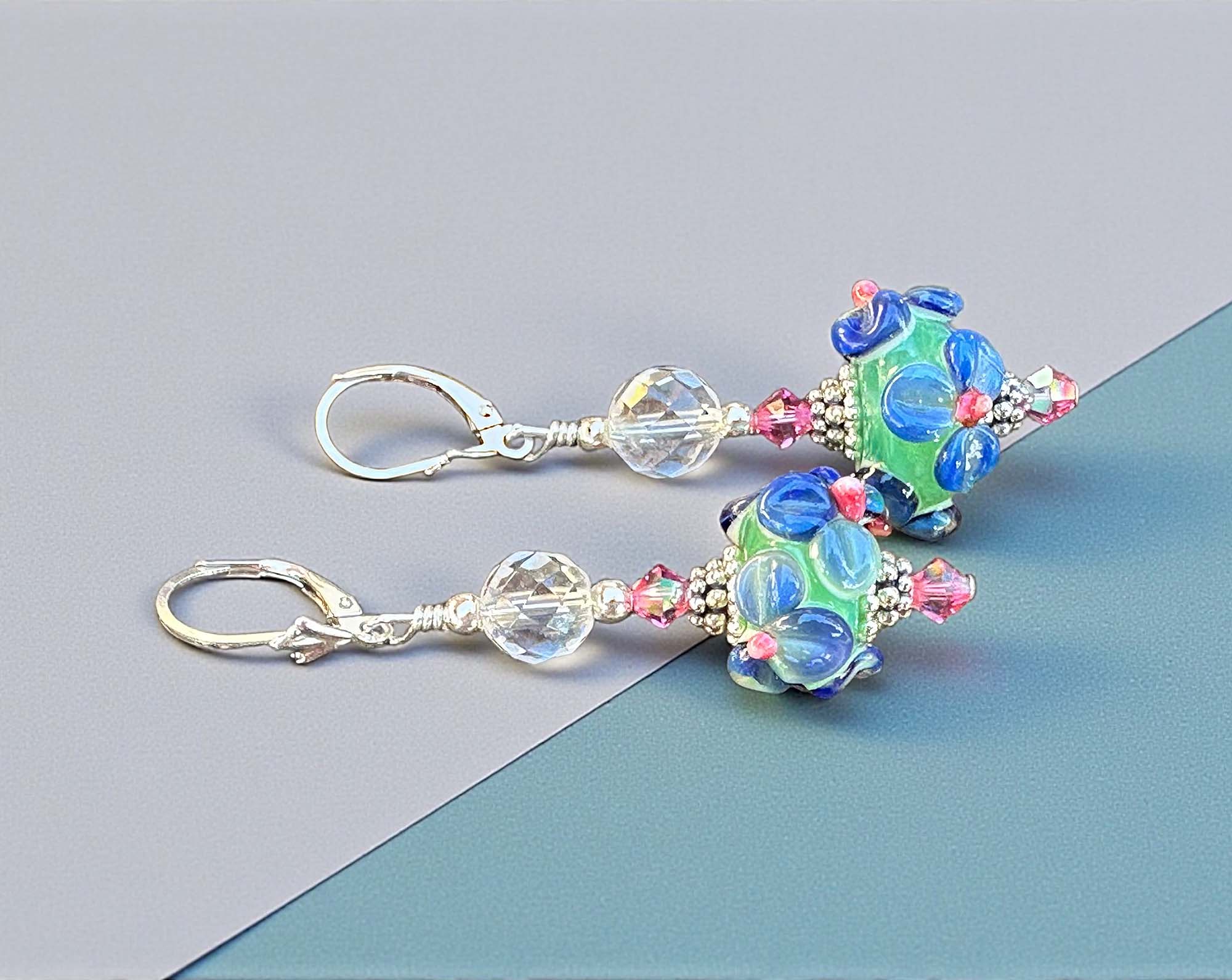 These artisan focal beads are paired with sparkling rose crystal accents and faceted clear crystal rounds that add brilliance without overpowering the handmade glass. Genuine Bali .925 sterling silver components and secure sterling silver leverbacks provide both elegance and lasting durability.