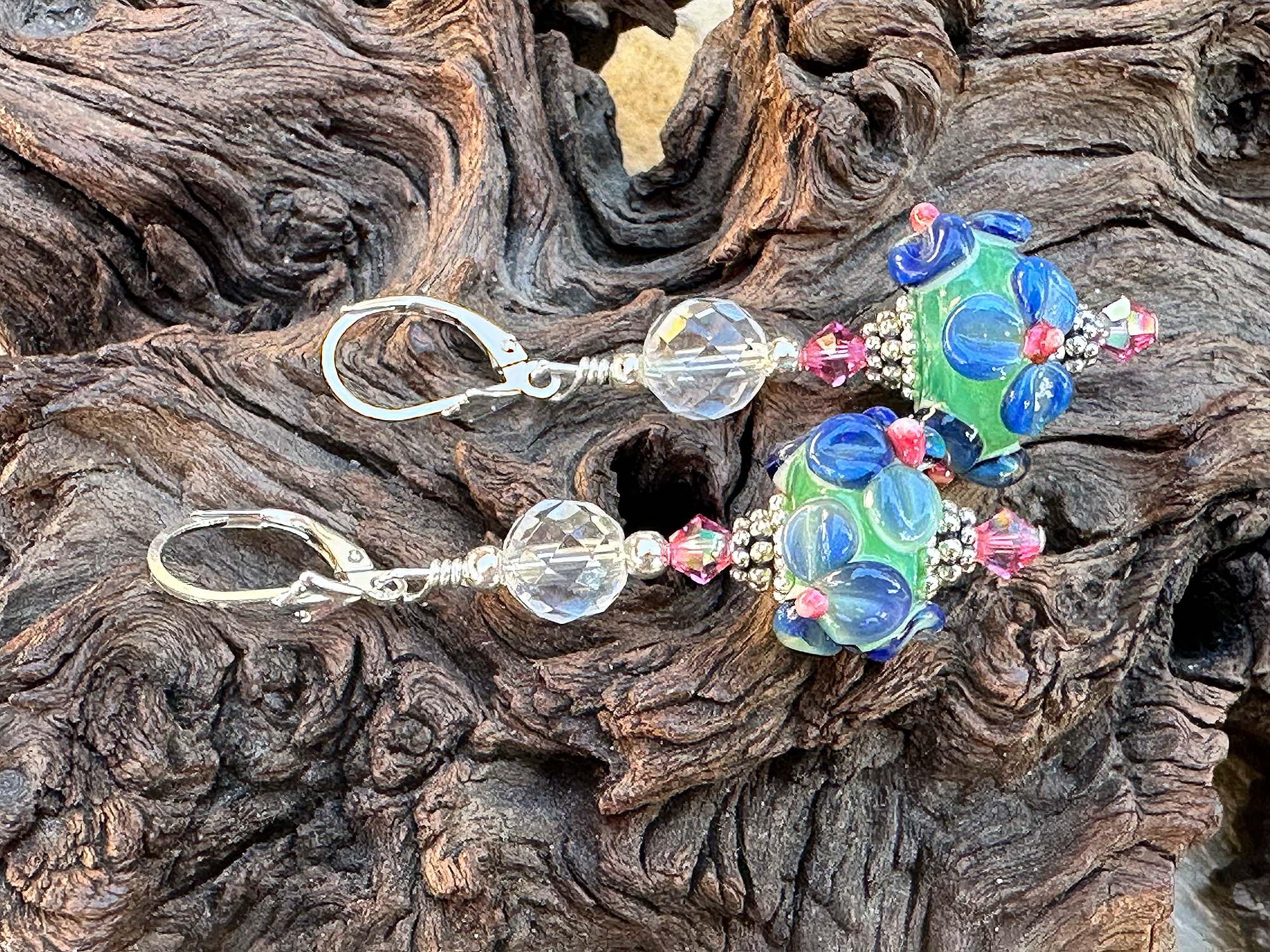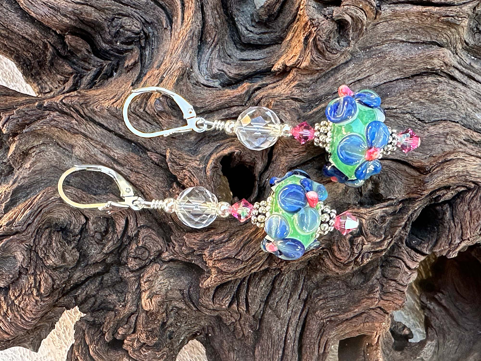 - Beads: Handmade lampwork glass, crystal accents