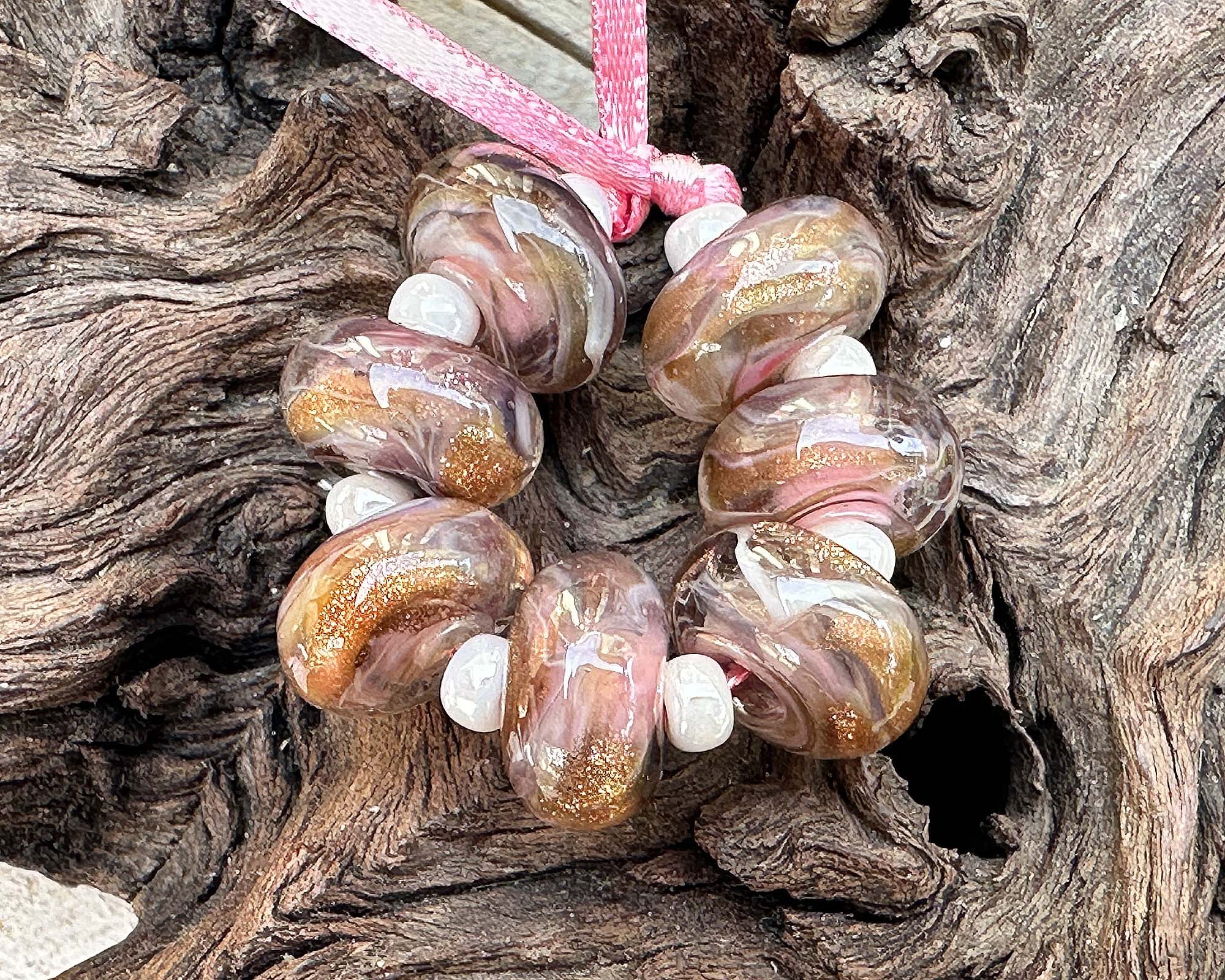 Meet your new favorite bead set! These six handcrafted Rosewood Pink Shimmer lampwork beads showcase a gorgeous mauve palette with moody plum notes and golden aventurine sparkle woven throughout. Crafted right here in our studio using premium Reichenbach, Effetre, and CIM soft glass, then kiln-annealed for incredible durability, each bead is totally one-of-a-kind. Whether you're stringing bracelets, necklaces, or mixed-media creations, these artisan beauties deliver the character and charm that make your work unmistakably yours.