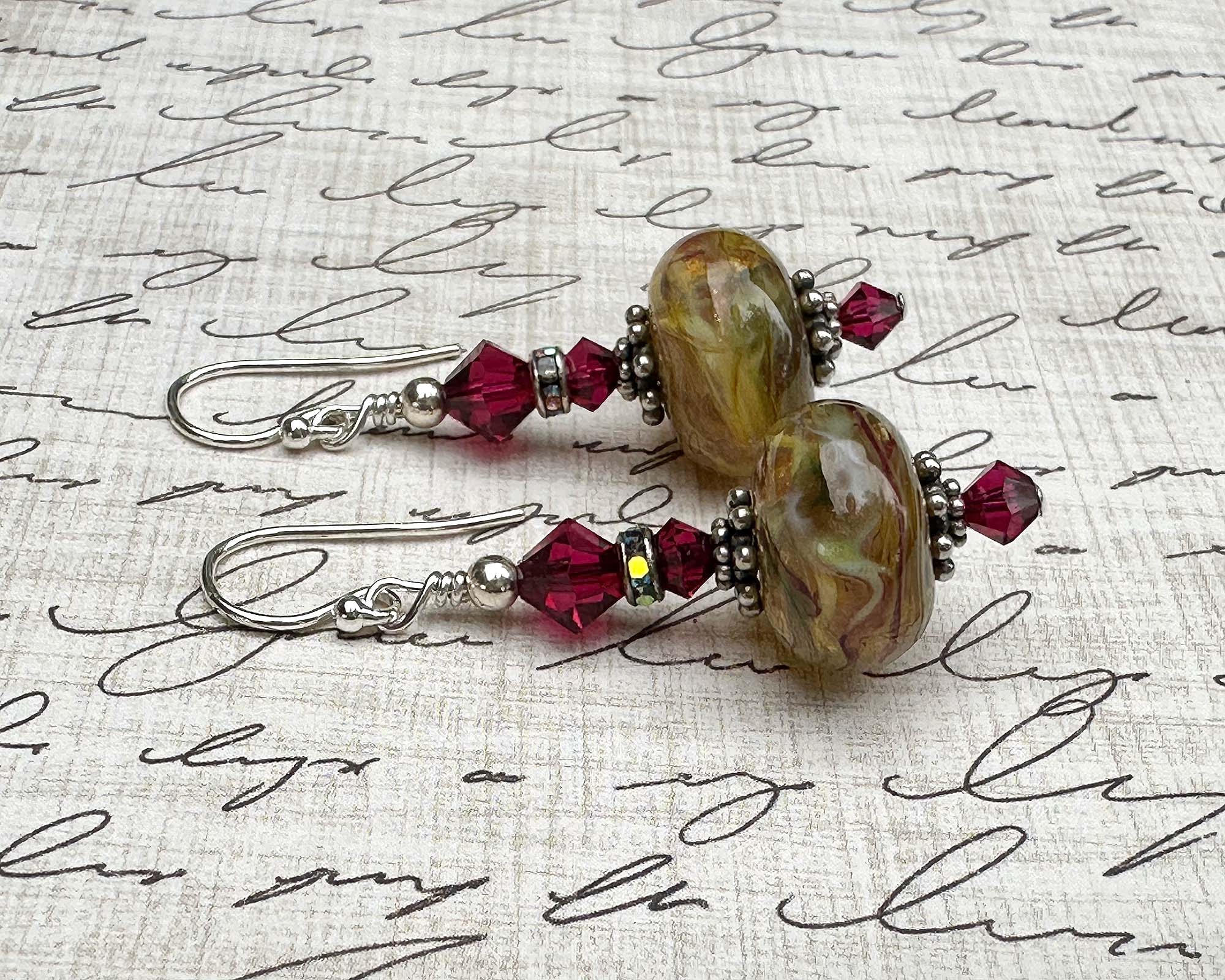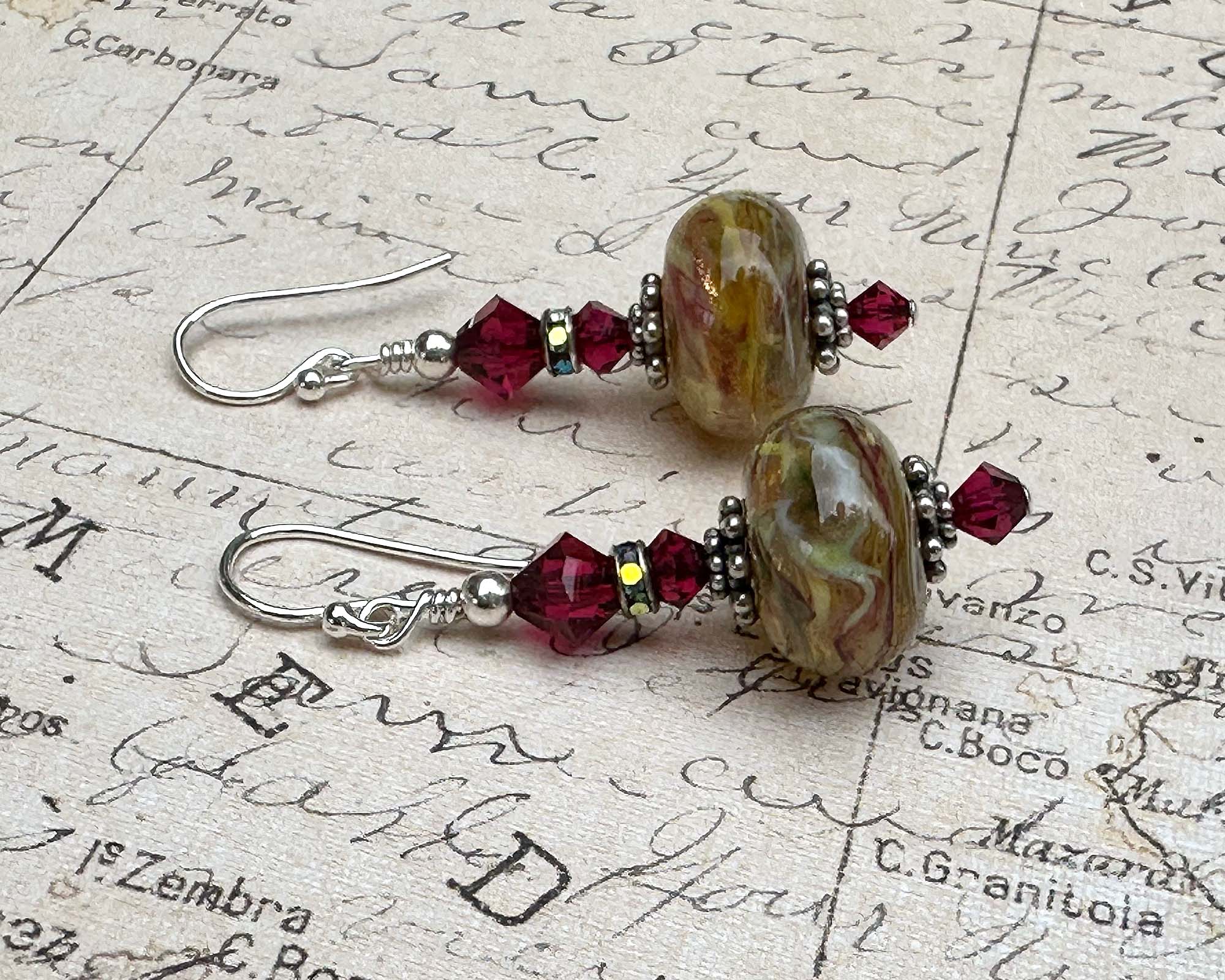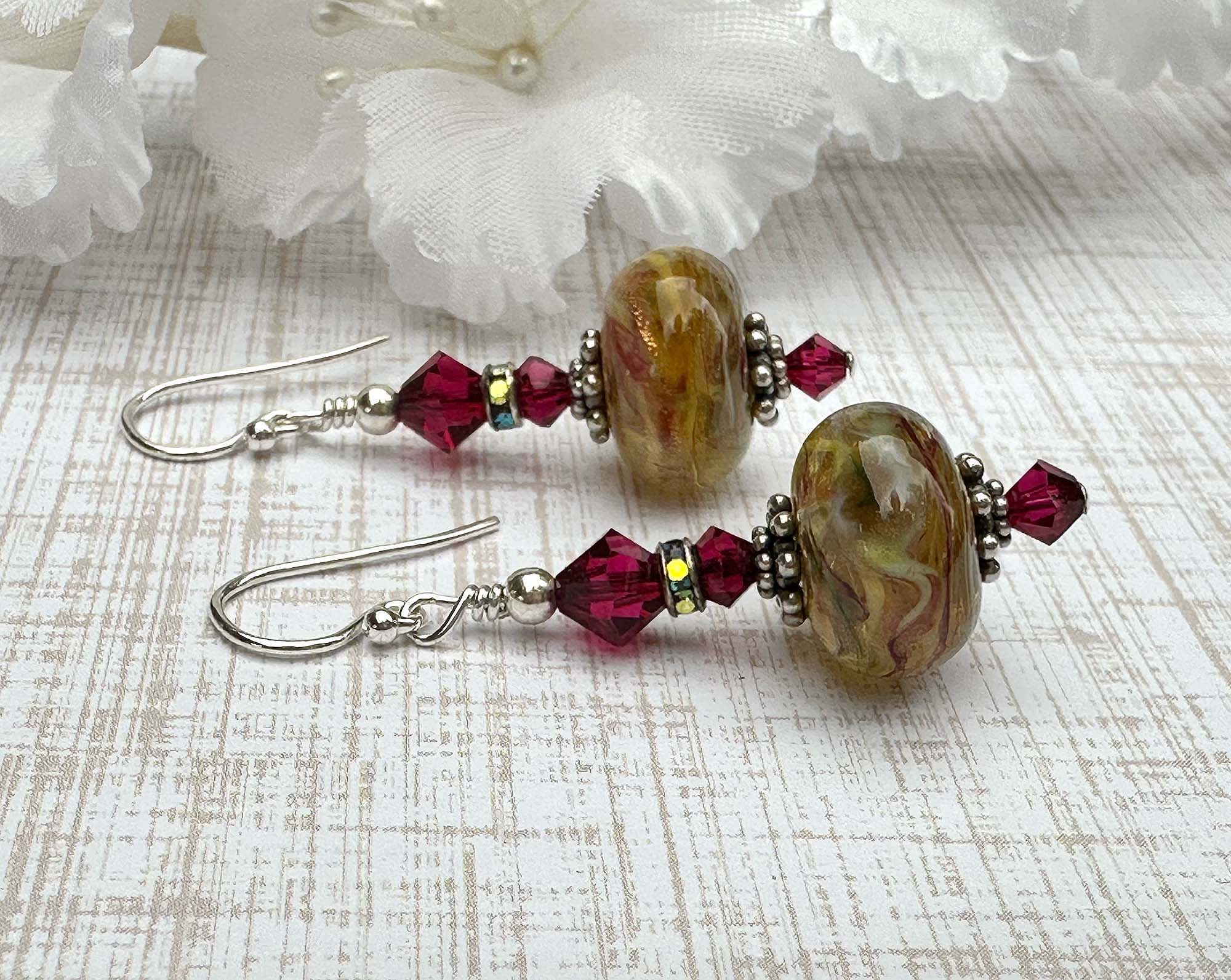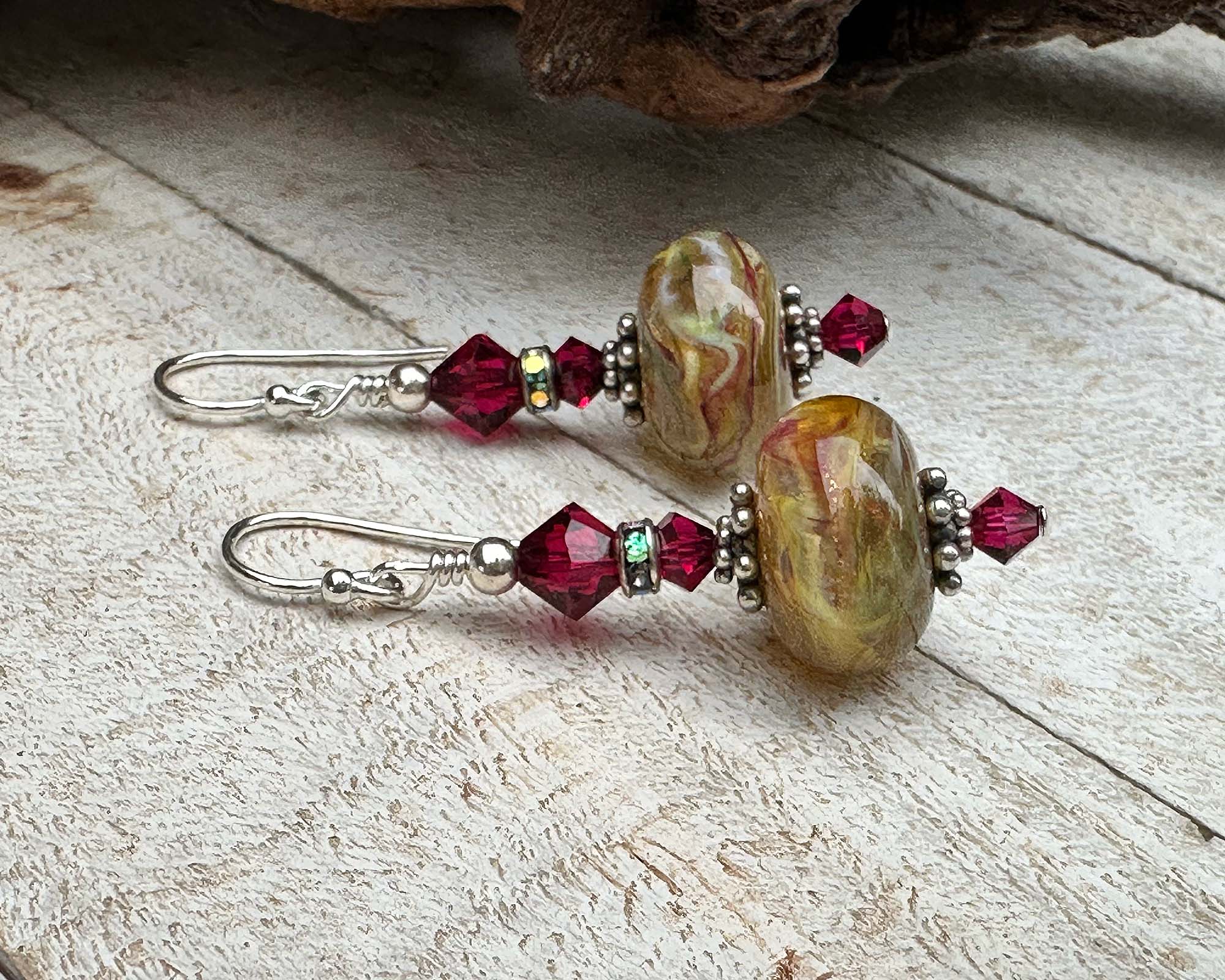Handcrafted with personality, these Golden Ruby Swirls Lampwork Earrings blend artisan flair with sparkle. Each pair showcases one-of-a-kind lampwork glass beads paired with fiery ruby Swarovski Austrian crystals and sterling silver accents from Bali. Watch them shimmer and dance in daylight—the intricate swirls and rich colors make these earrings impossible to ignore.