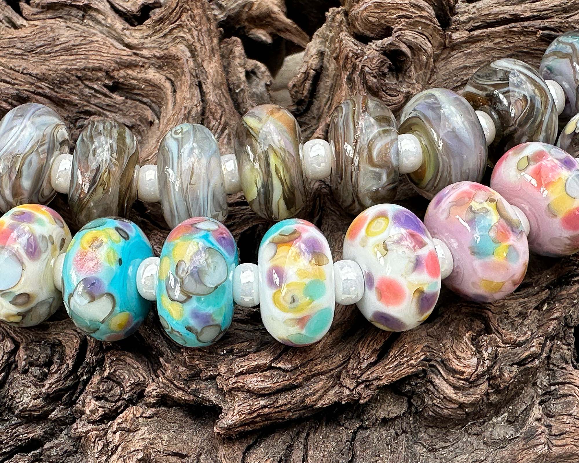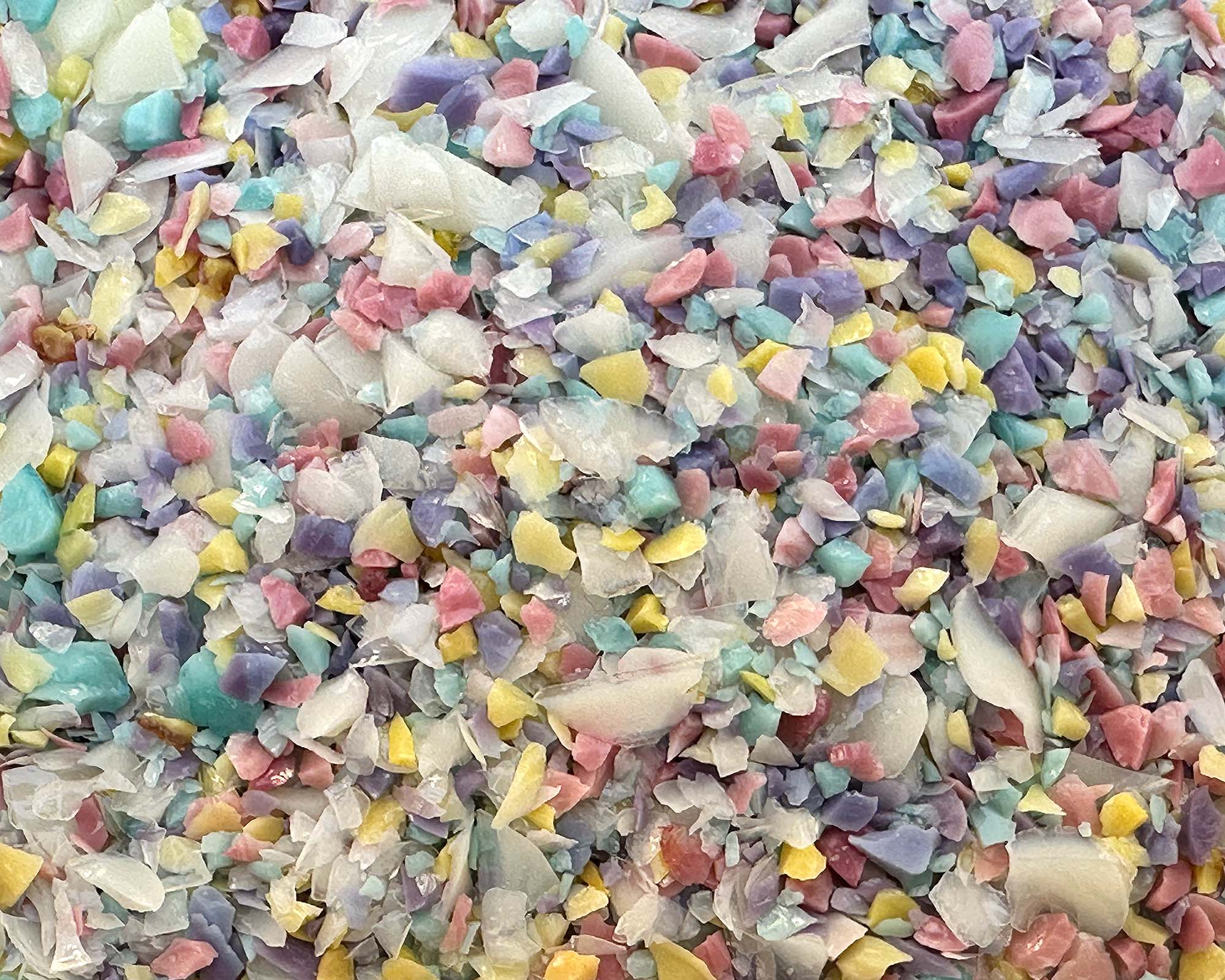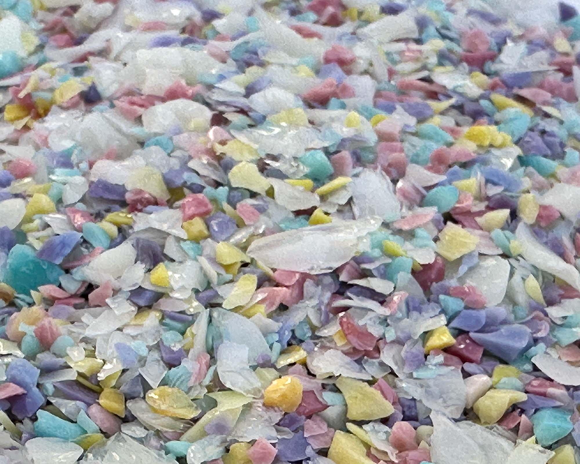 Elevate your glass artistry with our Painters Paradox Frit Blend, a vibrant mix of enchanting pink, yellow, turquoise, and cream colors that is slightly reactive on the surface and when commingled, it creates a stunning organic stone look.
