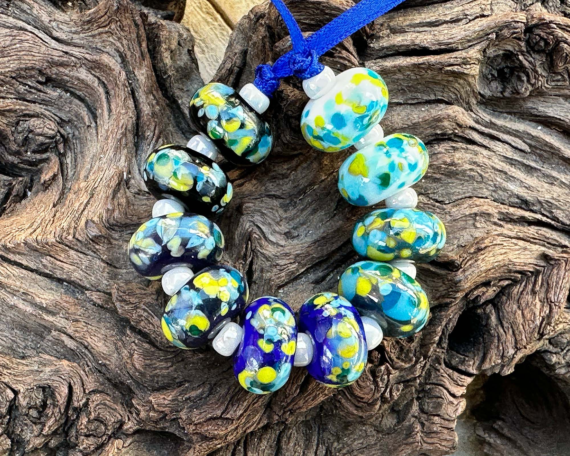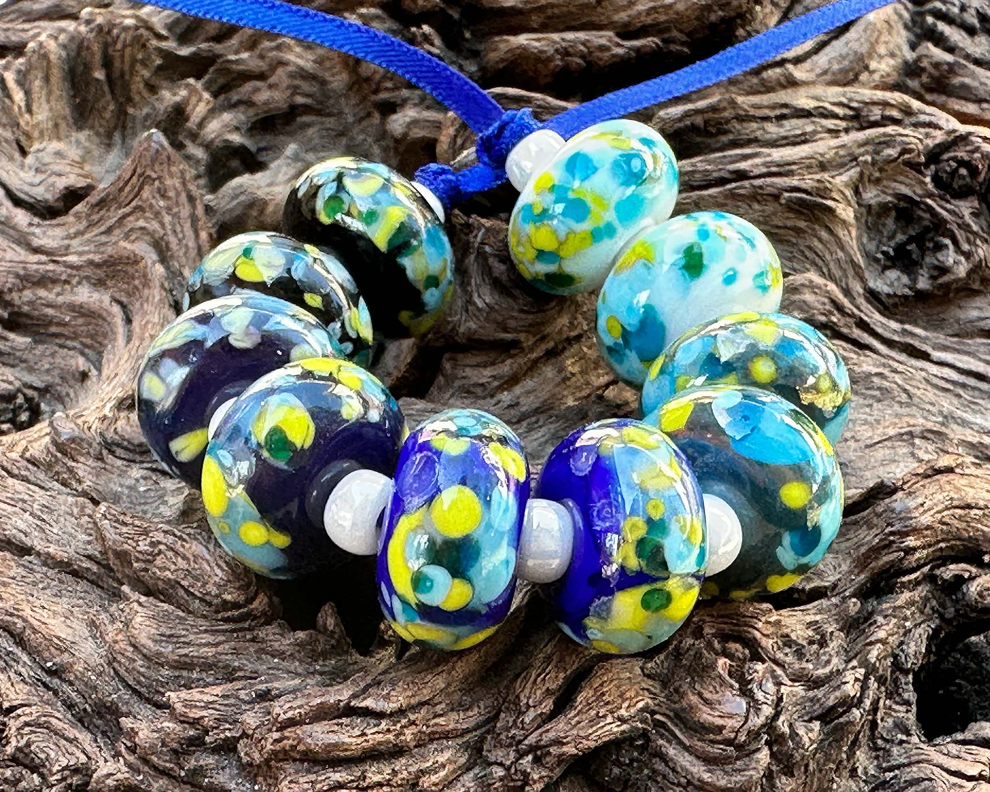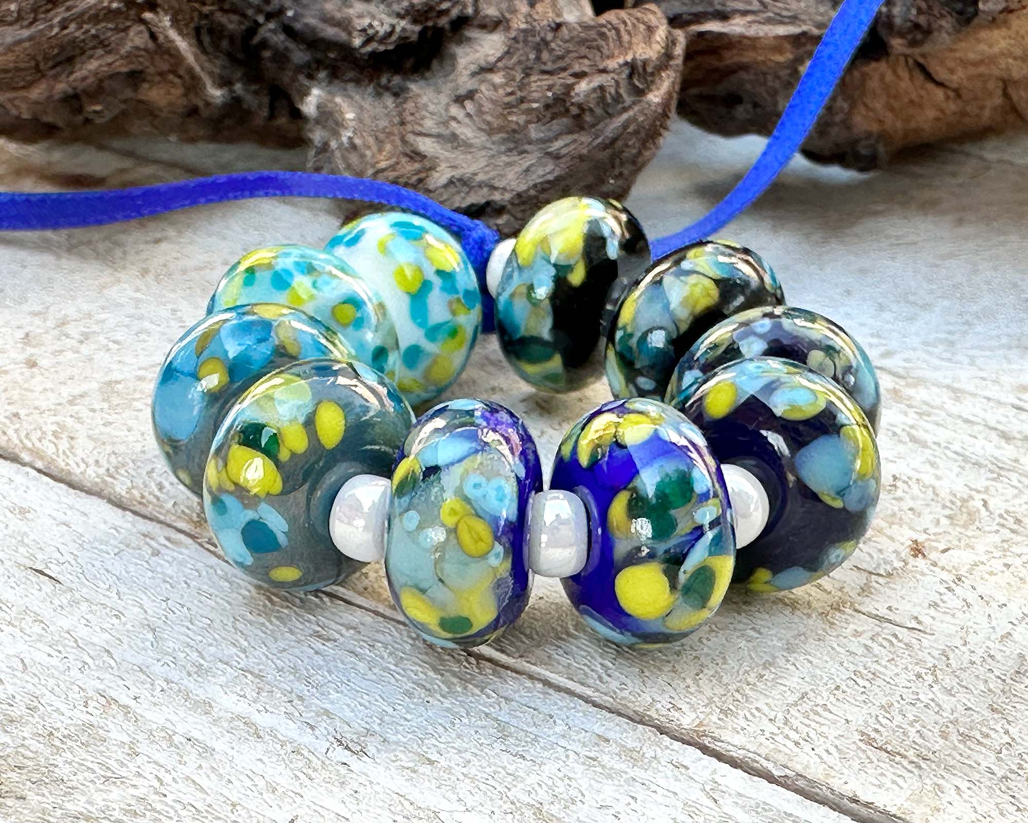 This handcrafted set features ten luminous Plankton Glow Mosaic beads, each one a tiny work of art with swirling turquoise, aqua, chartreuse, and deep ocean blues. The layered, mosaic-like pattern creates a glowing, almost bioluminescent effect that brings depth and movement to every design.