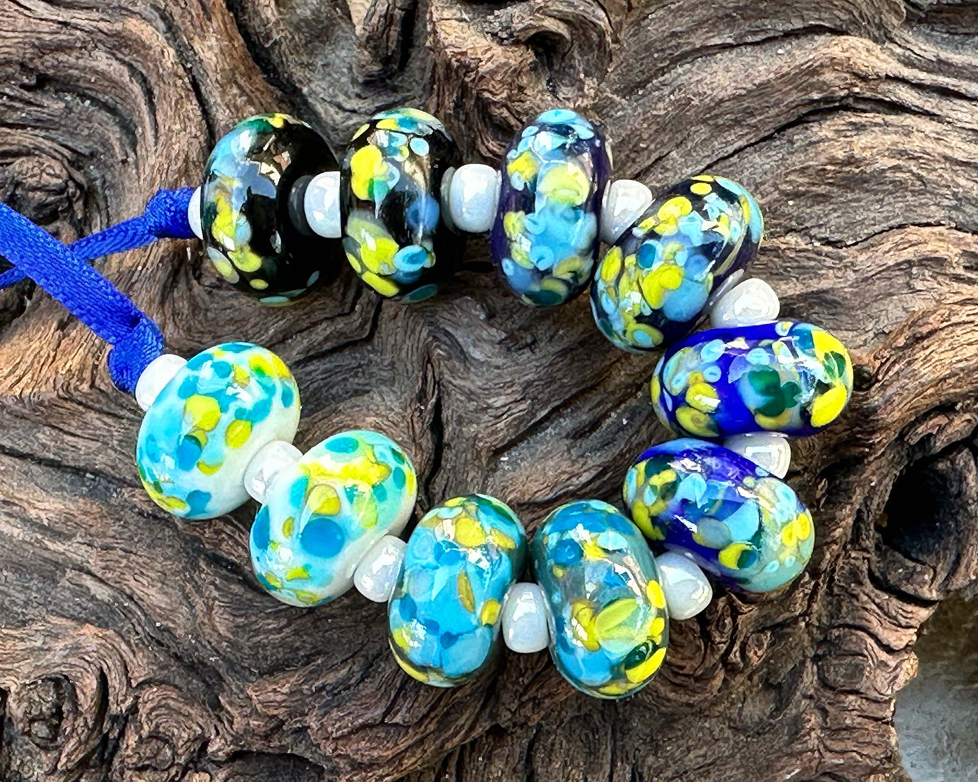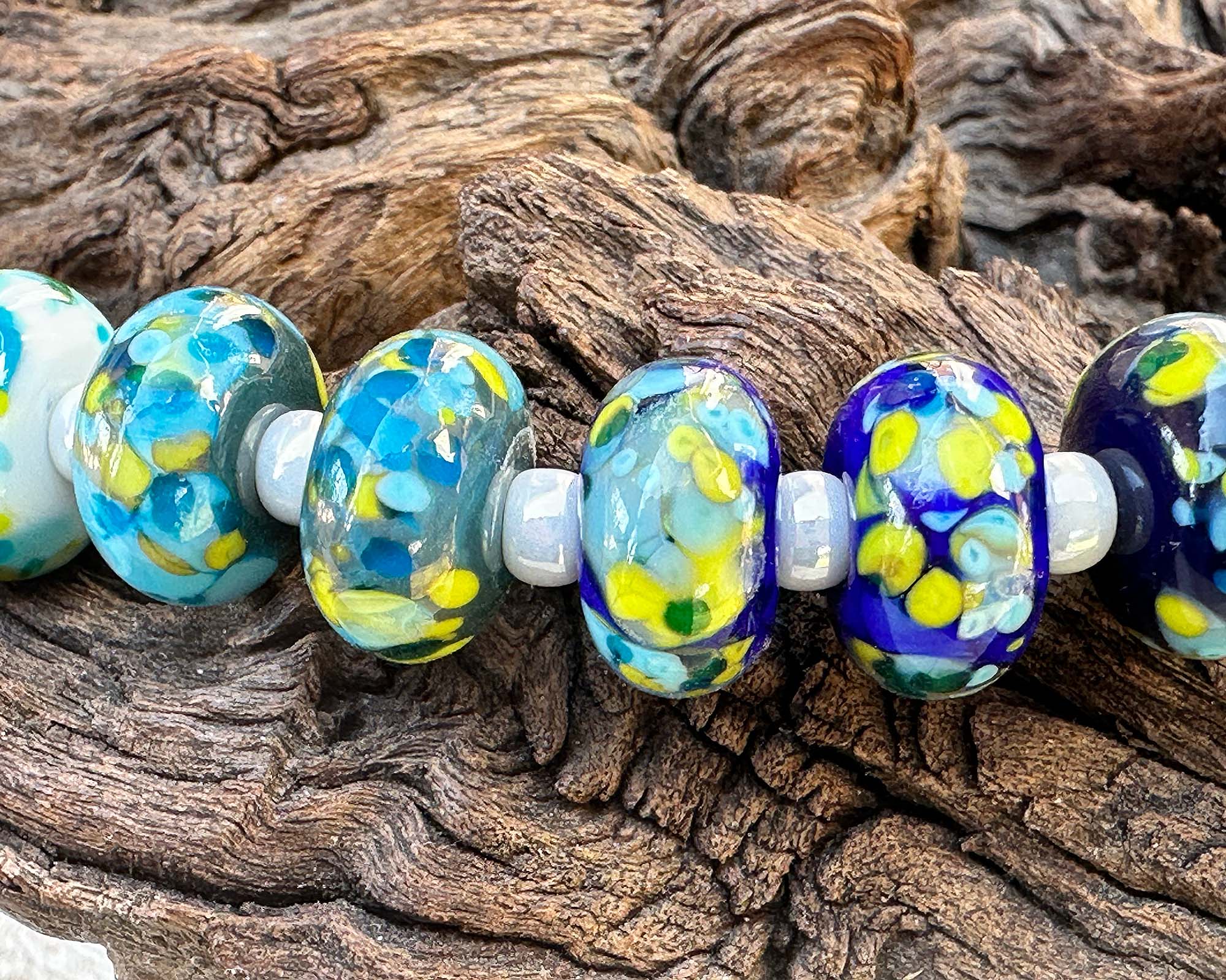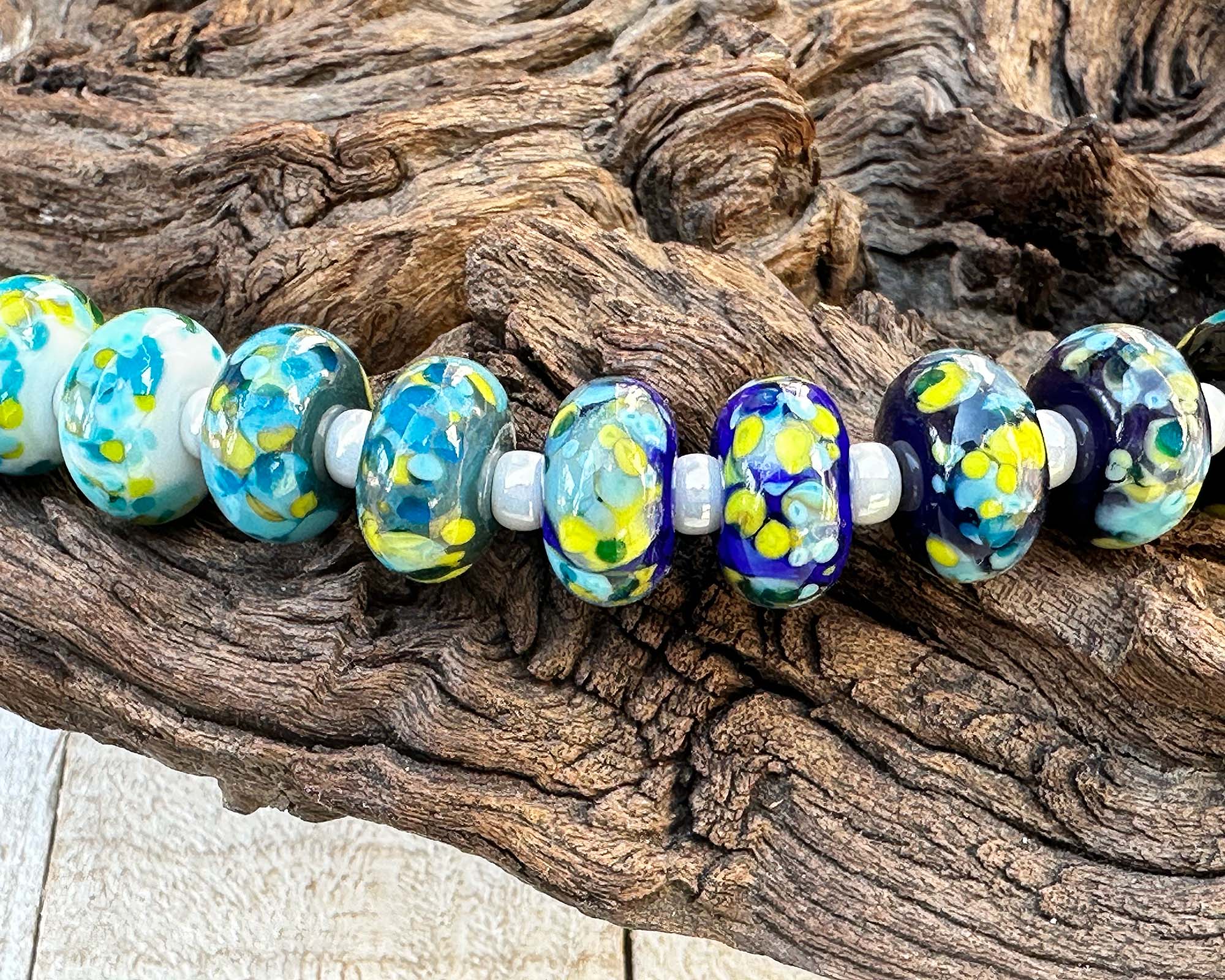 This handcrafted set features ten luminous Plankton Glow Mosaic beads, each one a tiny work of art with swirling turquoise, aqua, chartreuse, and deep ocean blues. The layered, mosaic-like pattern creates a glowing, almost bioluminescent effect that brings depth and movement to every design.