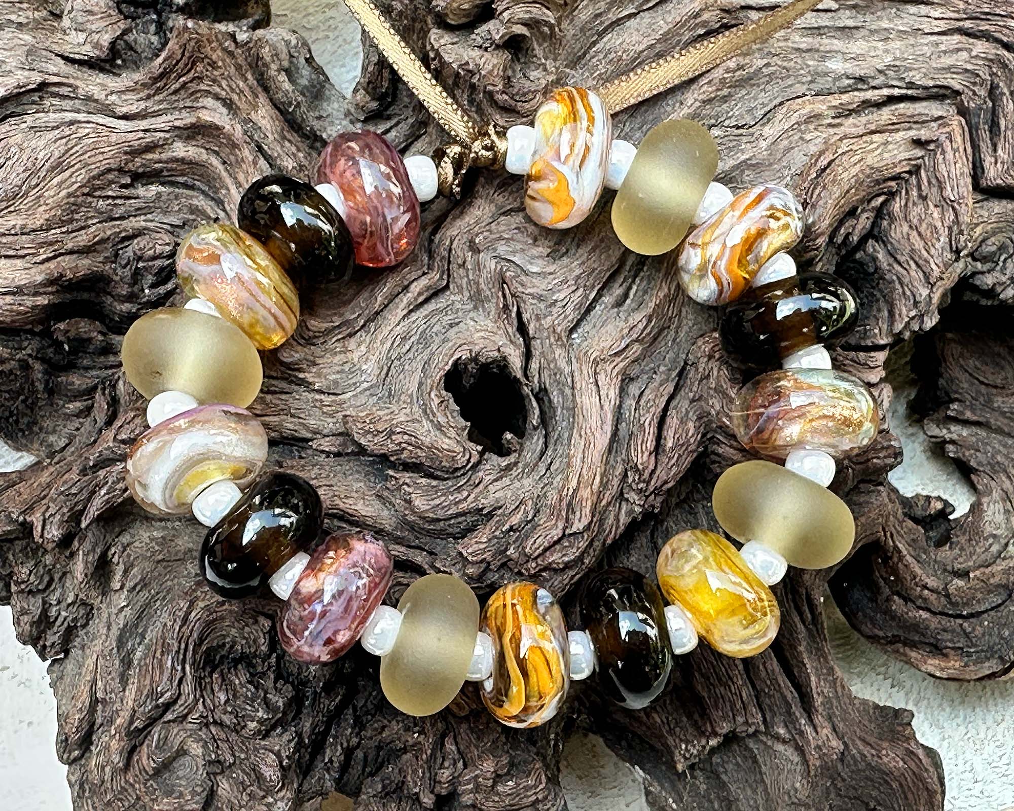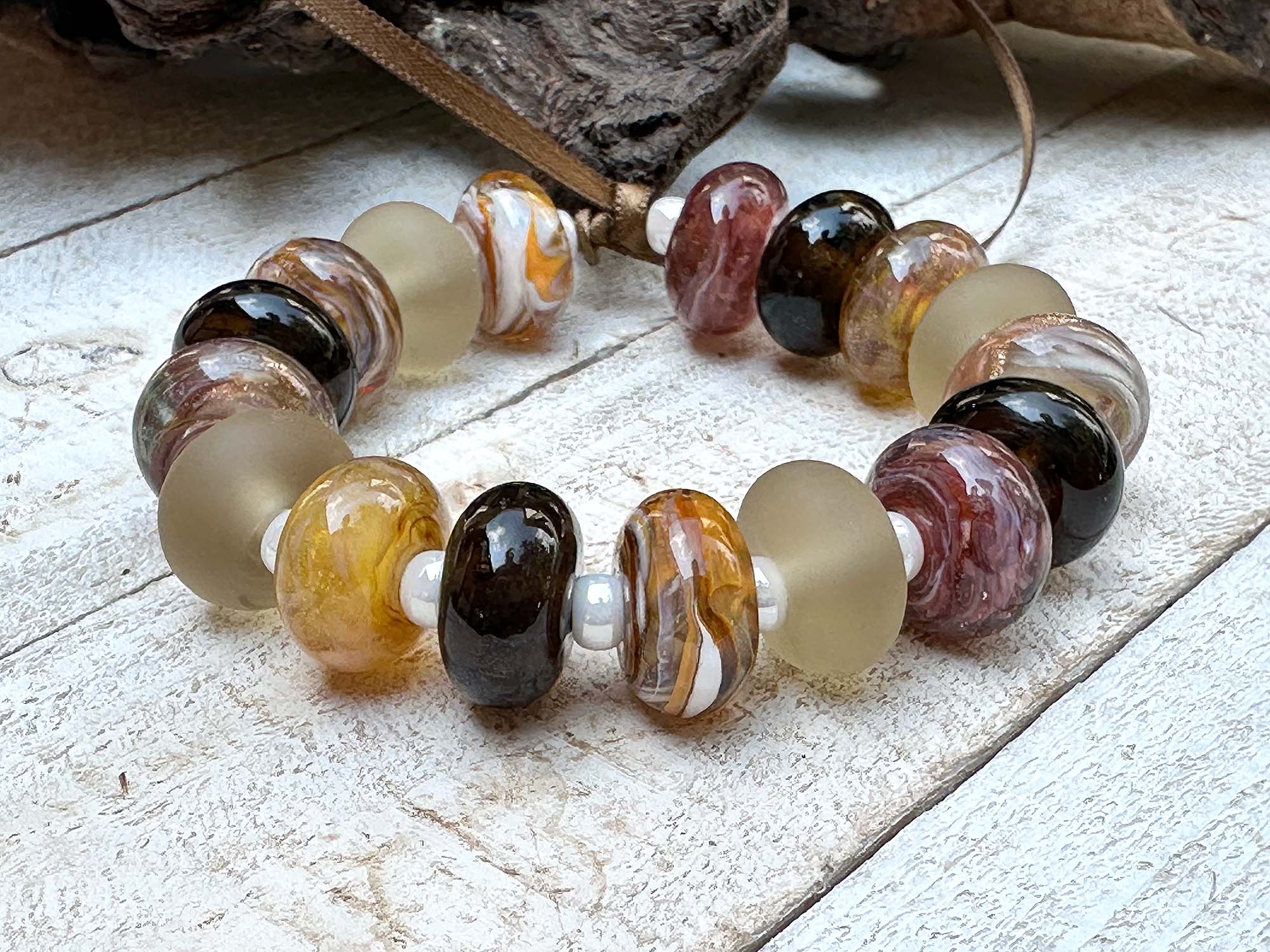 Unveil the charming Harvest Spice Brown Lampwork Bead Set, featuring 17 handcrafted beads in rich tones of brown, red, yellow, topaz, and lively splashes of orange. These beads display a mix of swirls, solid colors, and some with a trendy matte etched finish, ideal for crafting a playful necklace or bracelet.Made individually in our studio, each bead is digitally kiln annealed to boost its durability and strength. This delightful set is truly one of a kind, perfect for adding a pop of colorful fun to your jewelry creations!