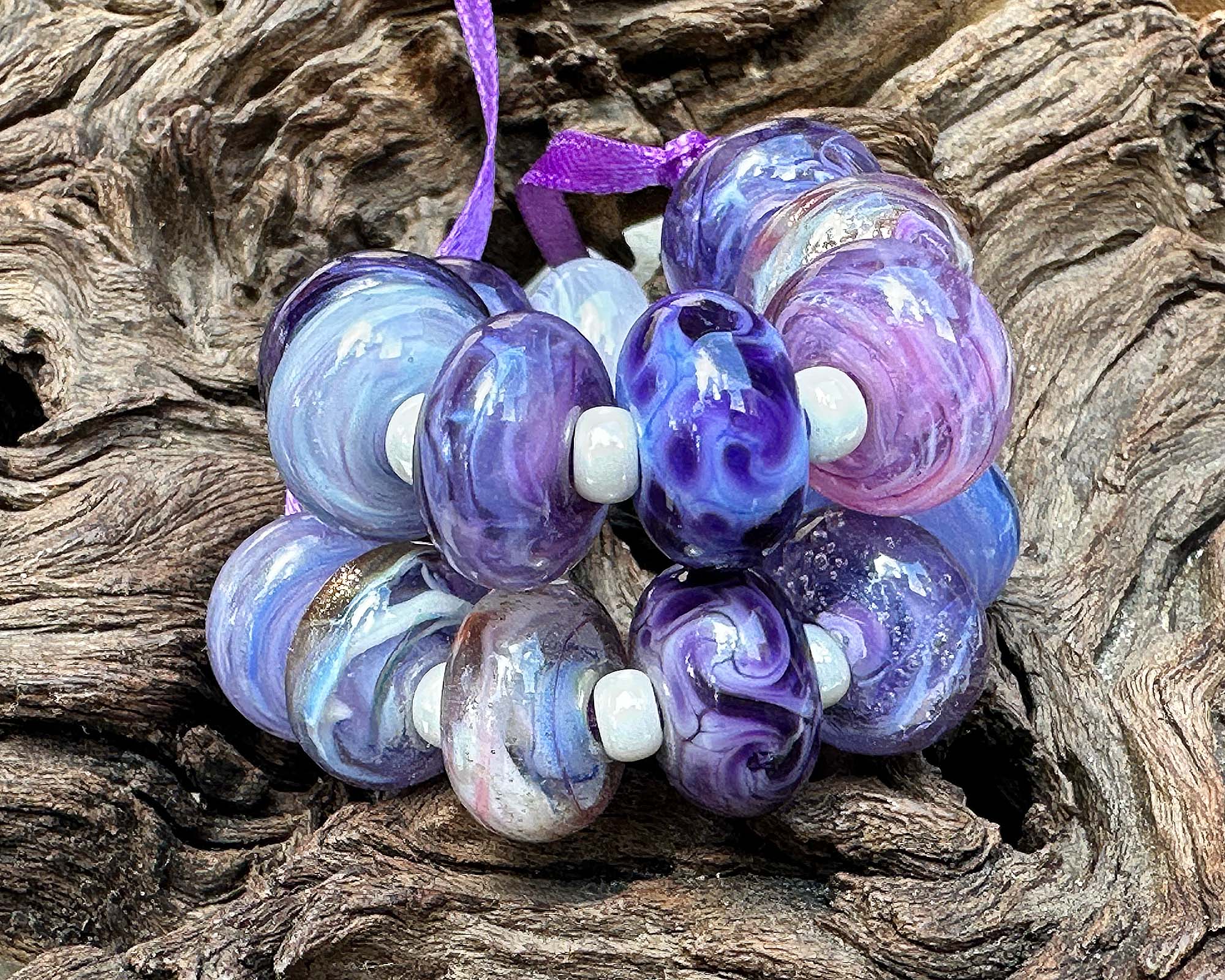 Discover a stunning collection of handcrafted purple lampwork beads, featuring a vibrant color palette that ranges from deep violet to soft lilac, with mesmerizing hints of blue, pink, and tanzanite. Each bead is a unique hand-crafted gemstone, showcasing semi-transparent and opaque finishes, perfect for creating eye-catching jewelry designs. Carefully made in our studio and digitally kiln annealed for exceptional durability and long-lasting beauty.