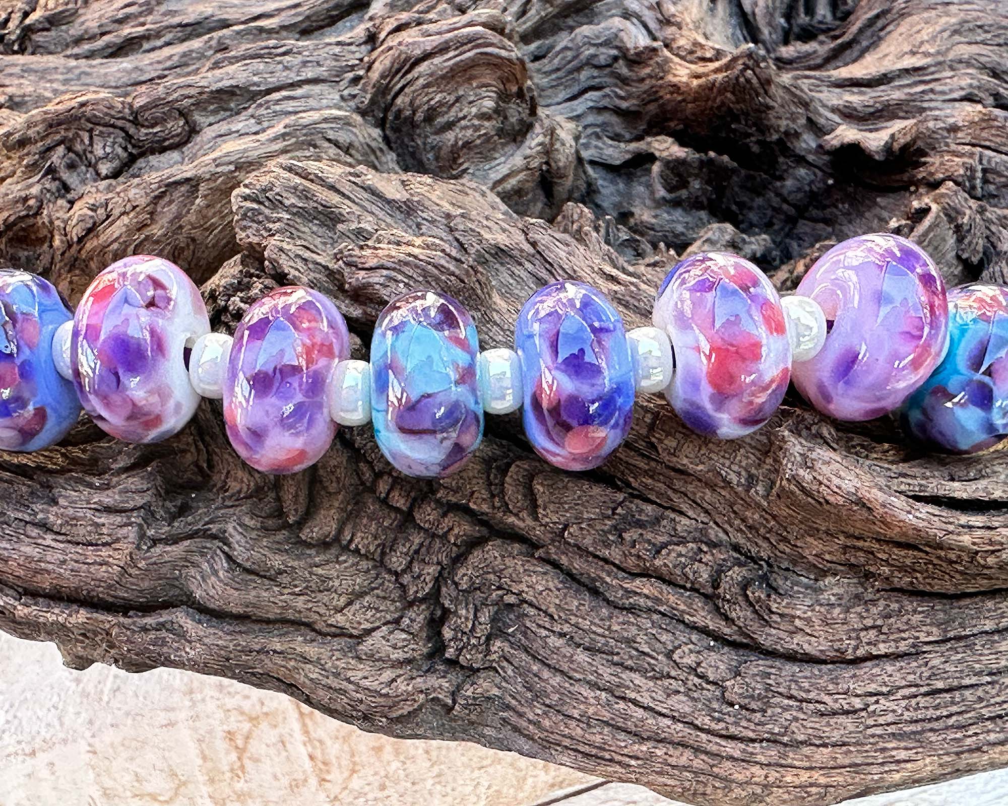 Get ready to make some serious jewelry magic with these Aura Violet Mosaic lampwork beads! Each handcrafted bead is bursting with personality—a delightful swirl of violet, purple, lavender, pink, and blue dancing together in intricate mosaic patterns that light up beautifully. Created from an in-house custom glass blend. Dream up show-stopping earrings, bold statement necklaces, or fun layered bracelets that'll have everyone asking where you got them. The matched pairs make creating balanced designs super easy, and thanks to professional annealing, your creations will stay stunning through all your adventures. These artisan beads are your secret weapon for crafting jewelry that's totally one-of-a-kind.