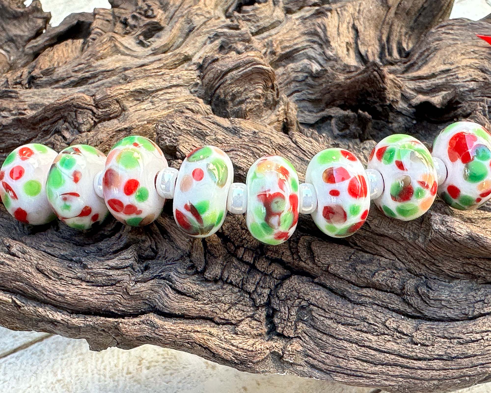 Add a festive touch to your jewelry designs with our striking 8-piece Christmas Candy Cane Dreams Lampwork Bead set, meticulously crafted in our studio. This exclusive set of 8 beads features bold, vibrant red, two shades of green, and a pink. These look similar to candy cane colors. All of the beads have a mosaic style design, each one a tiny masterpiece full of personality and depth.