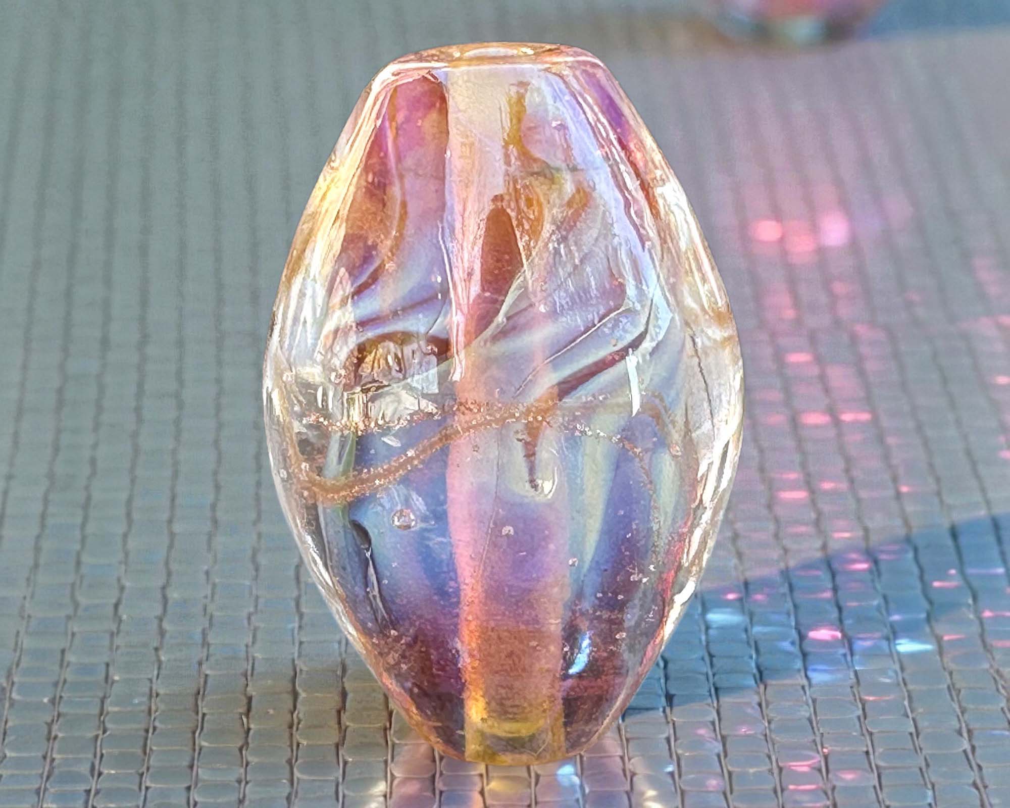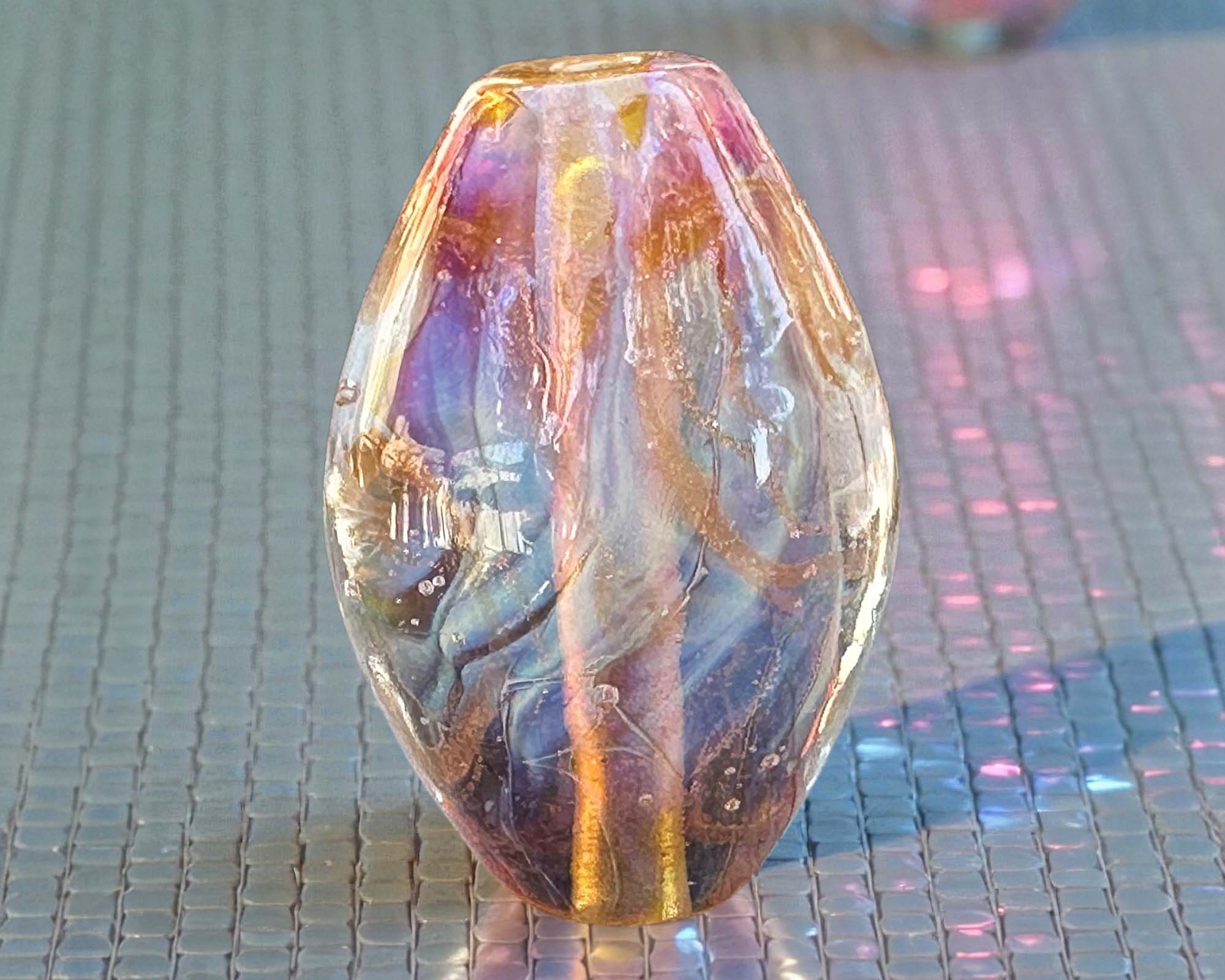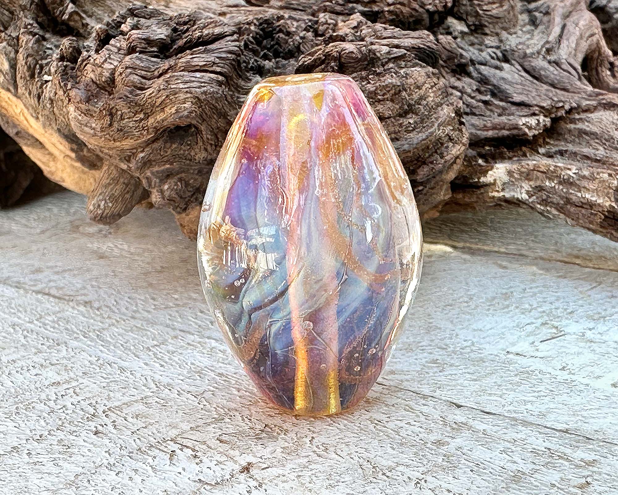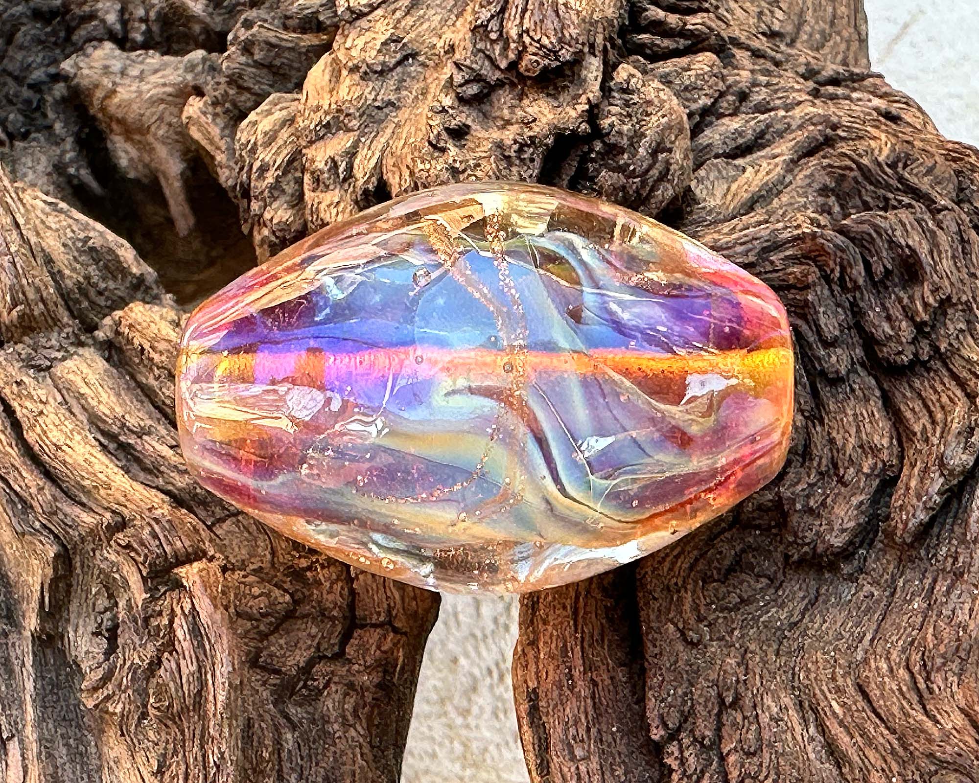This hand-crafted lampwork bead captures sunrise magic with its shimmering opalescent surface—think mother-of-pearl meets a golden hour sky. Swirls of pink, blue, yellow, and orange dance across the glass, while delicate silver-glass wisps create an enchanting depth that shifts with every movement. Gold-aventurine bands sparkle from every angle, making this one-of-a-kind focal bead impossible to ignore. Fully annealed for durability and finished with a polished hole, it's ready to become the showstopping centerpiece of your next jewelry creation.