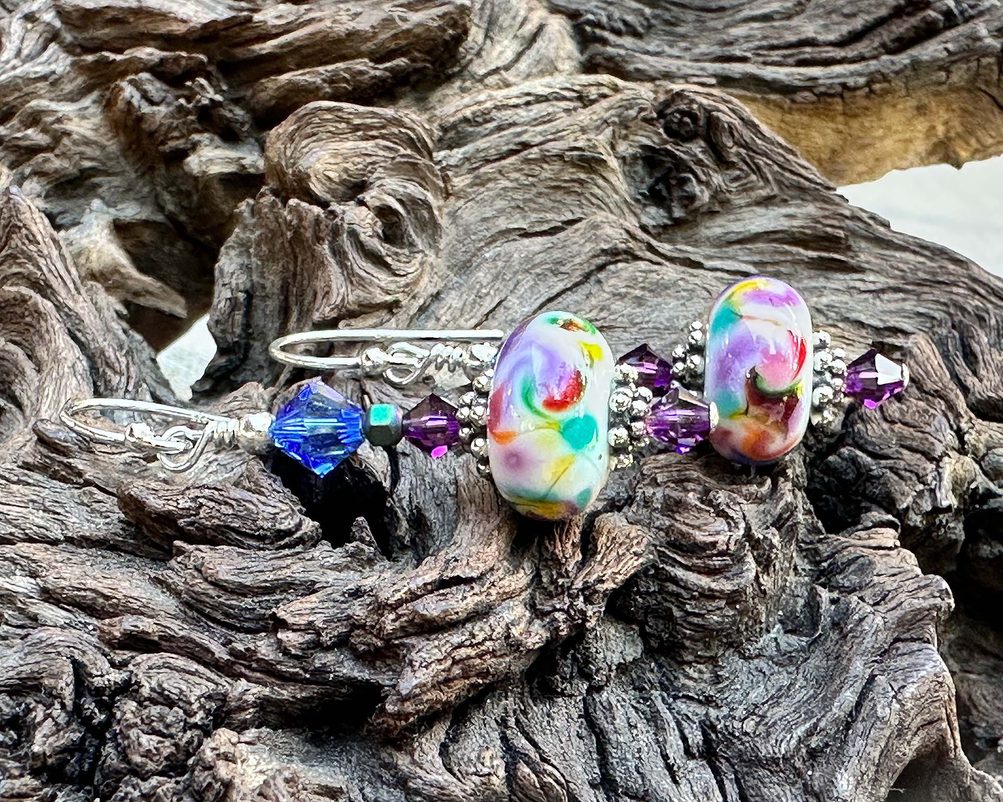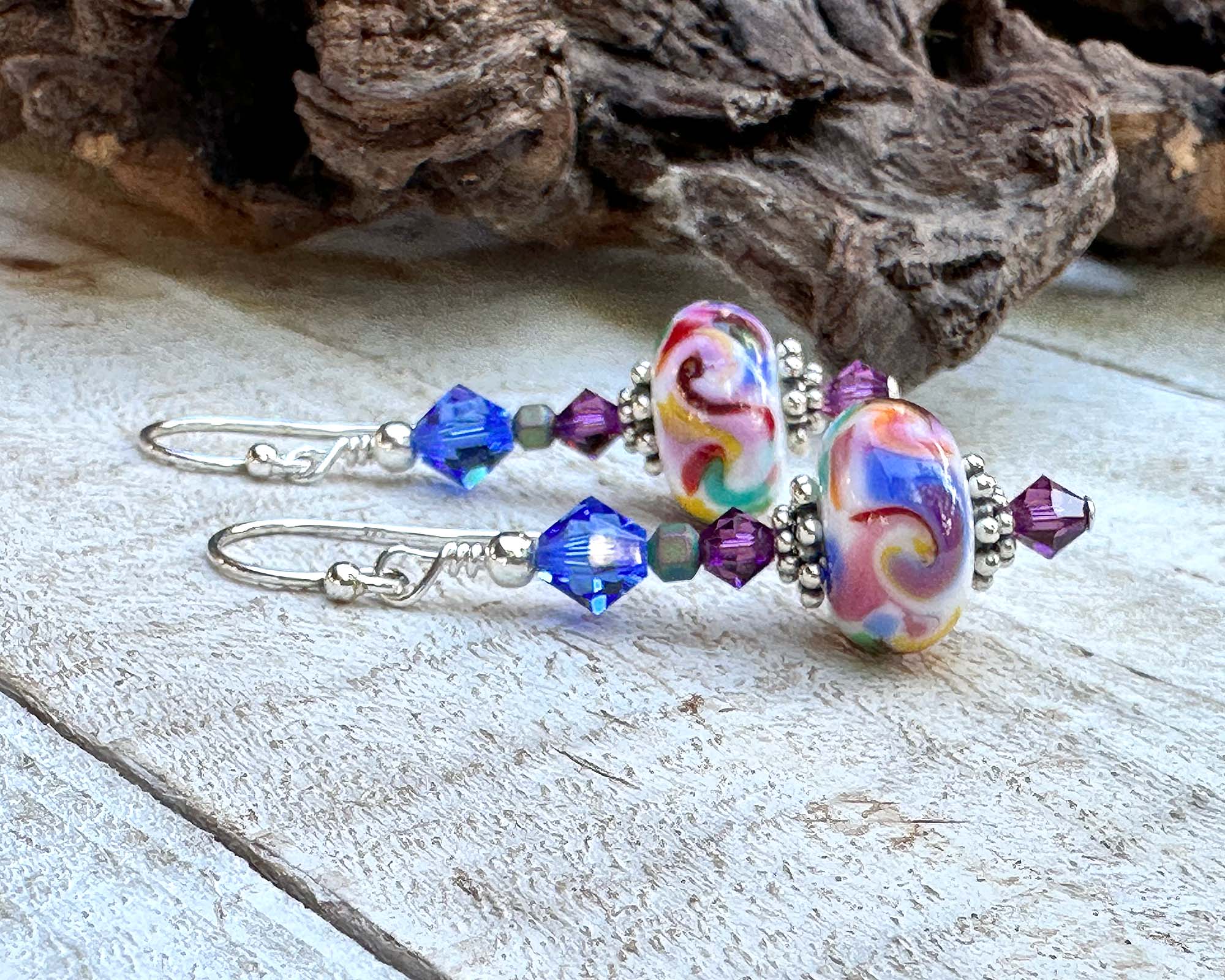 Purple Rainbow Lampwork Bead Earrings – Crafted by hand with sterling silver and sparkling faceted crystals for a vibrant touch.