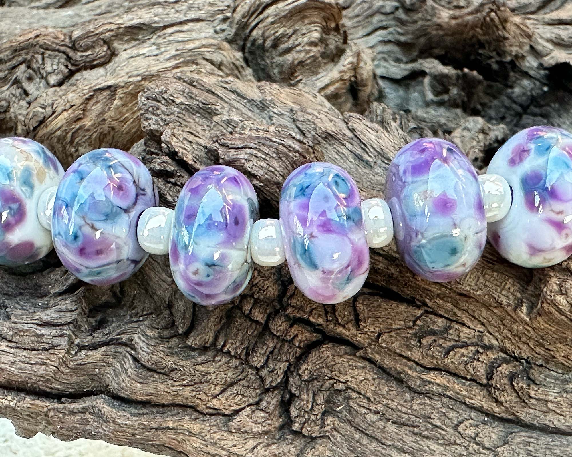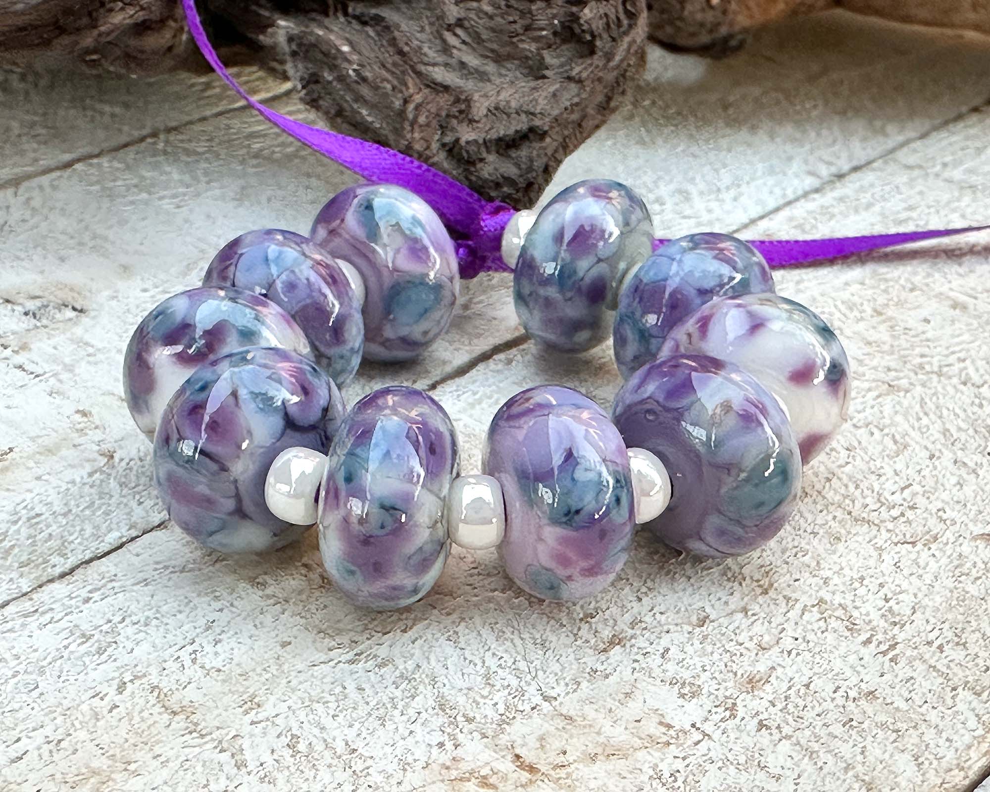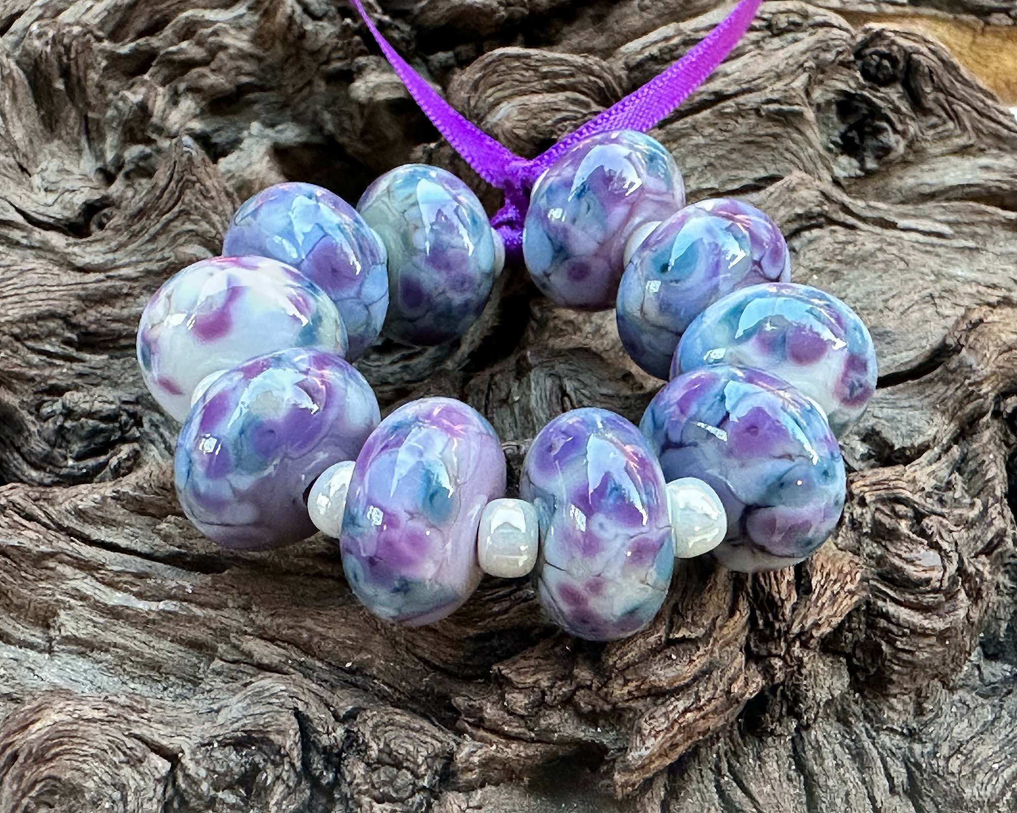 These 10 Fairy Wing Purple Mosaic lampwork beads are handcrafted artisan treasures, showcasing luminous violet, blue, lavender, and ivory hues woven into intricate mosaic designs. Created using our signature in-house frit blend, each bead develops its own personality through beautiful glass reactions—making every piece distinctly unique.