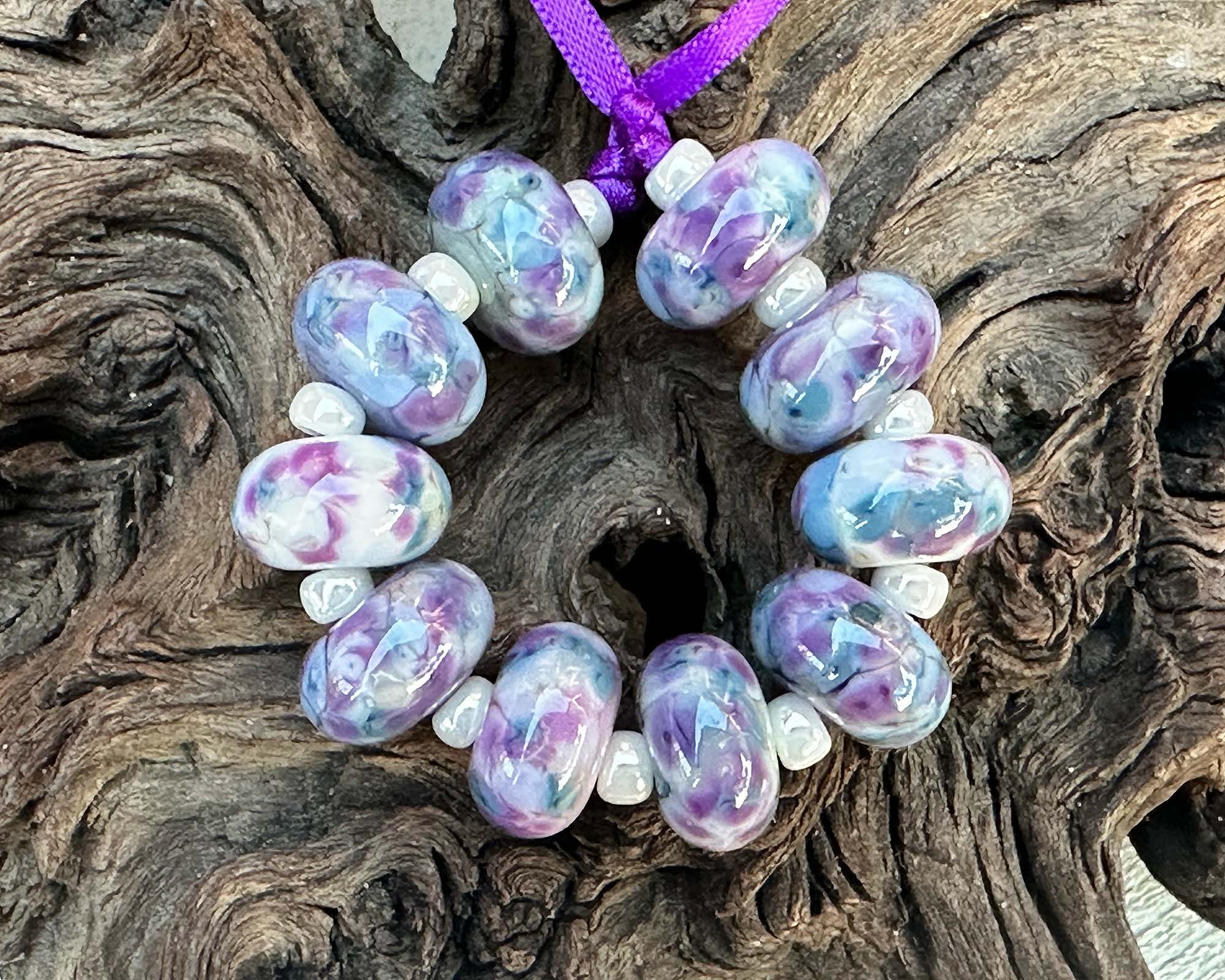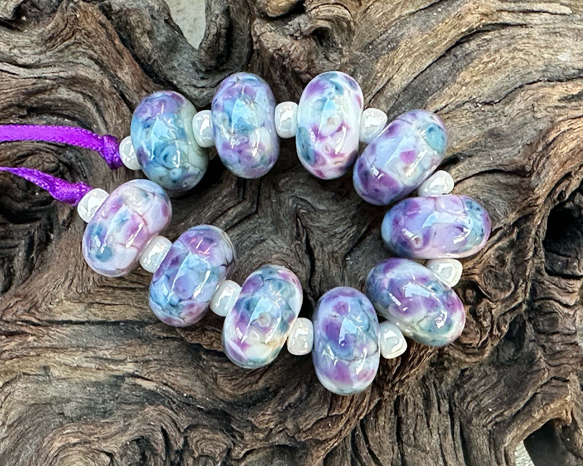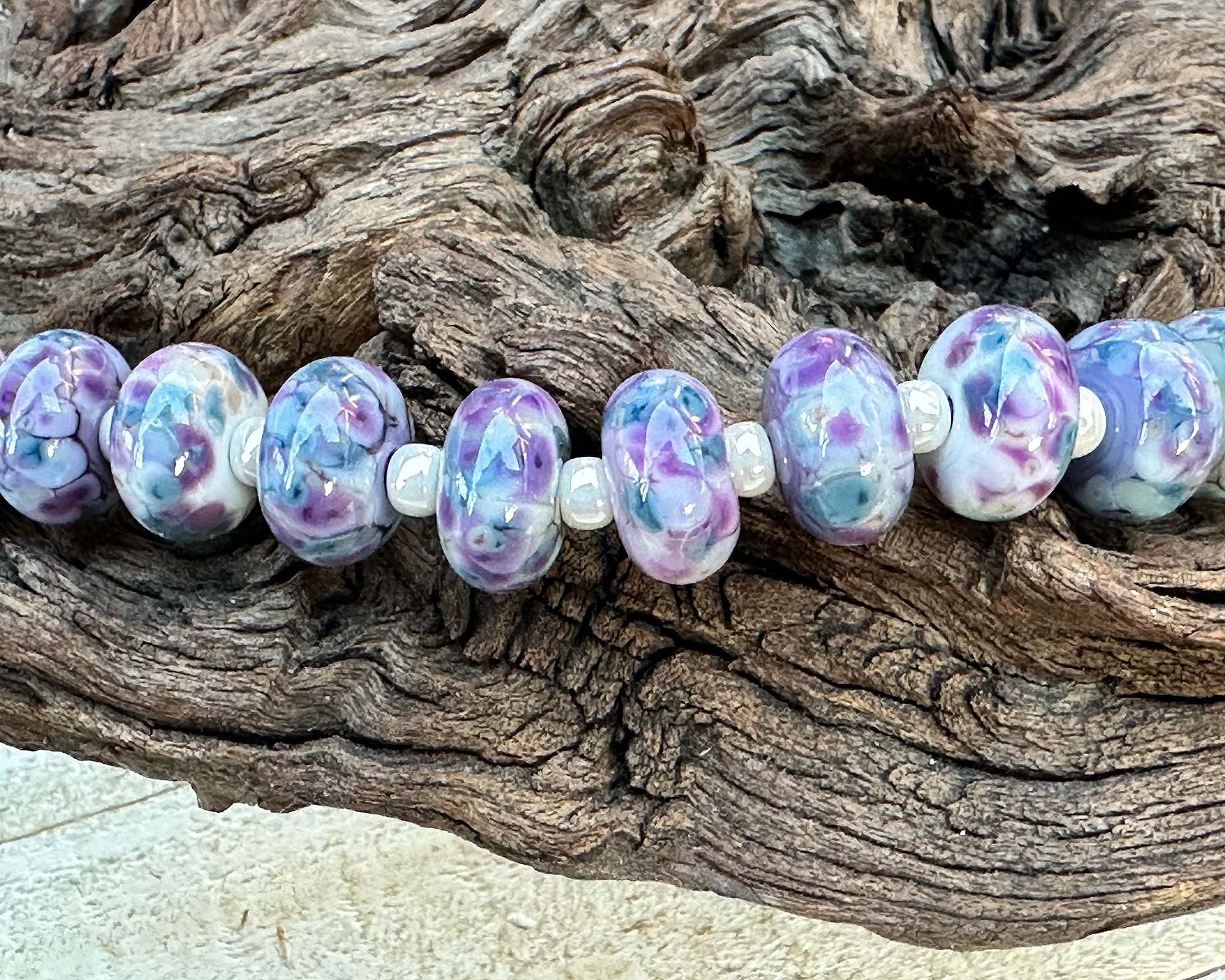 These 10 Fairy Wing Purple Mosaic lampwork beads are handcrafted artisan treasures, showcasing luminous violet, blue, lavender, and ivory hues woven into intricate mosaic designs. Created using our signature in-house frit blend, each bead develops its own personality through beautiful glass reactions—making every piece distinctly unique.