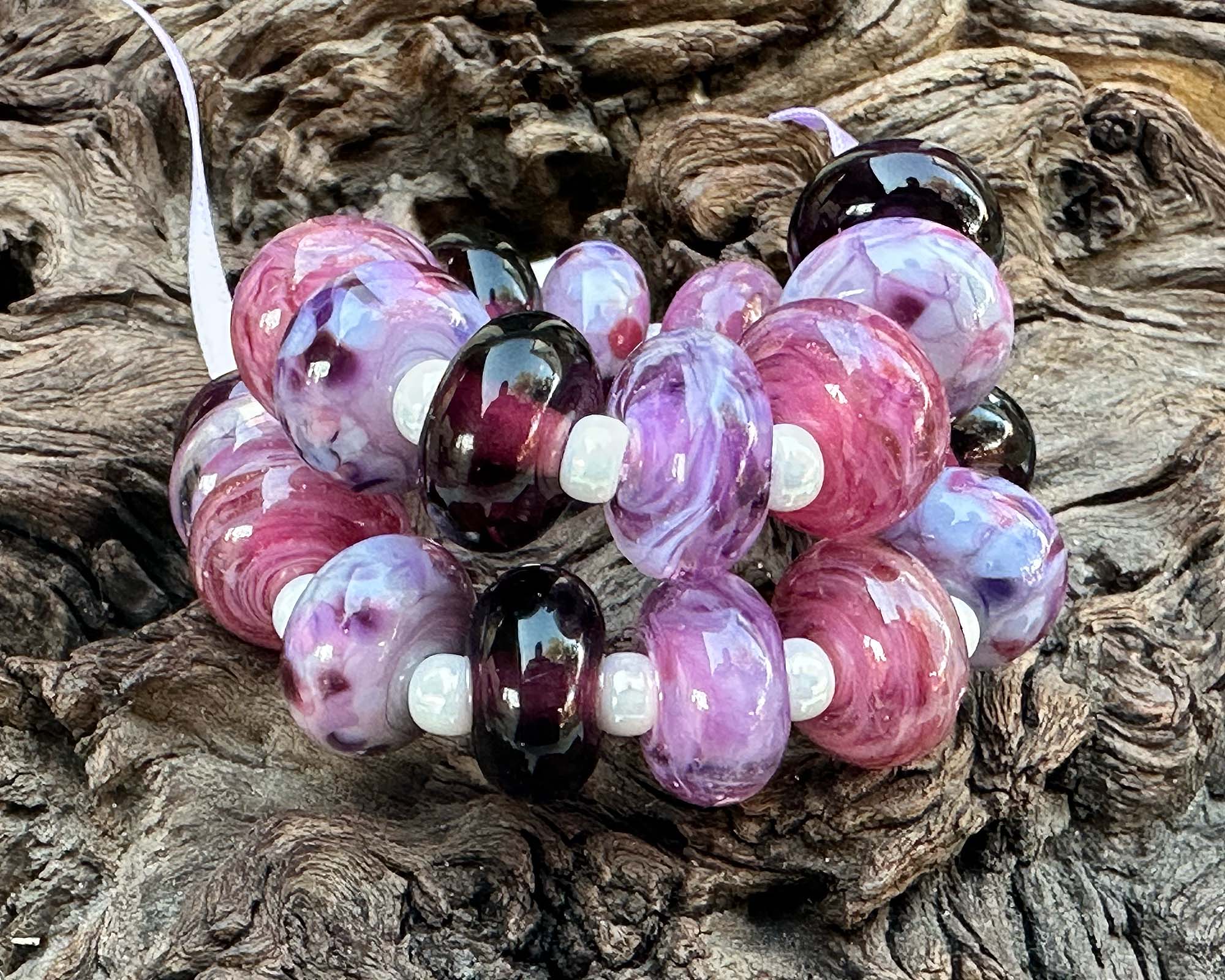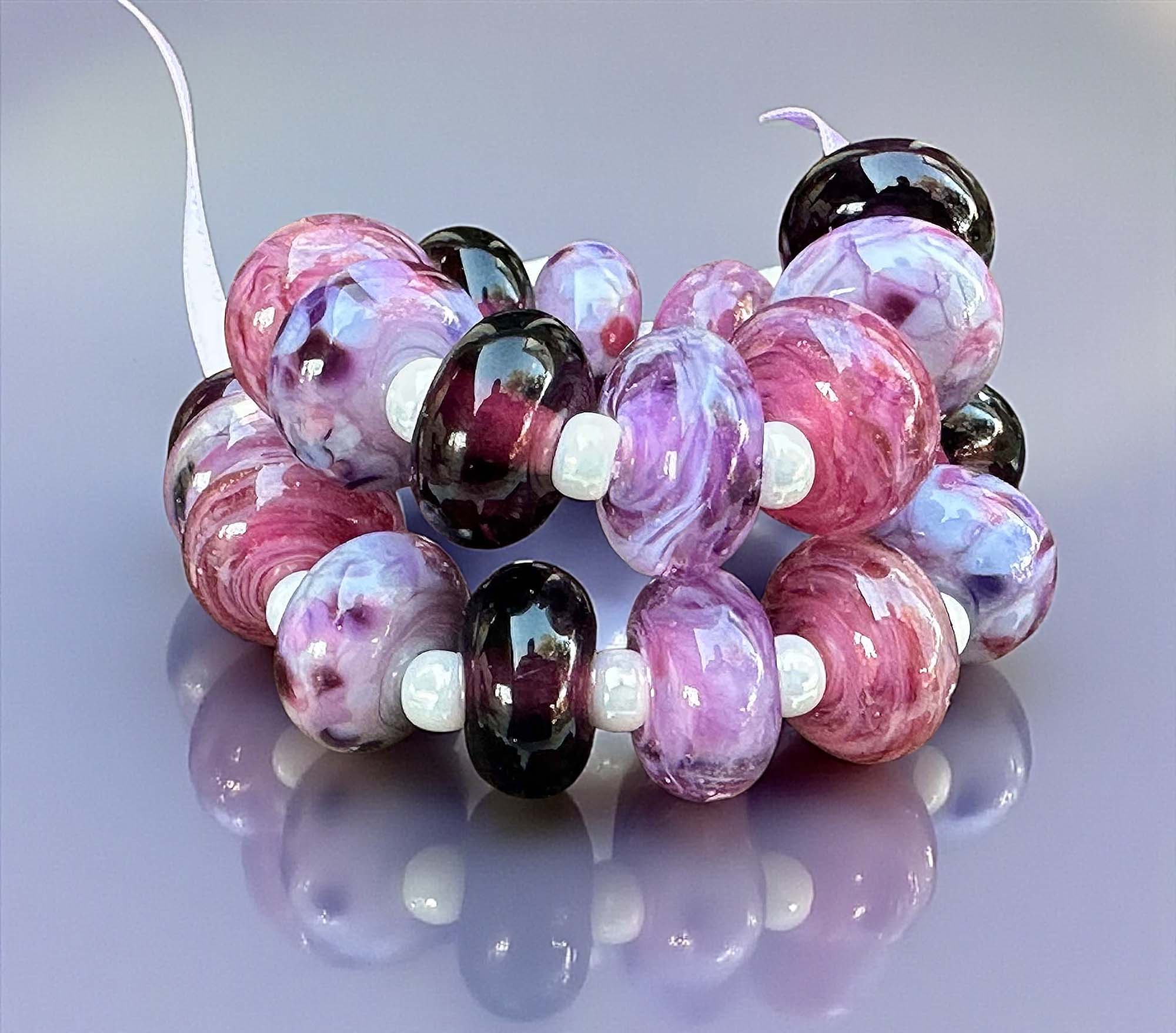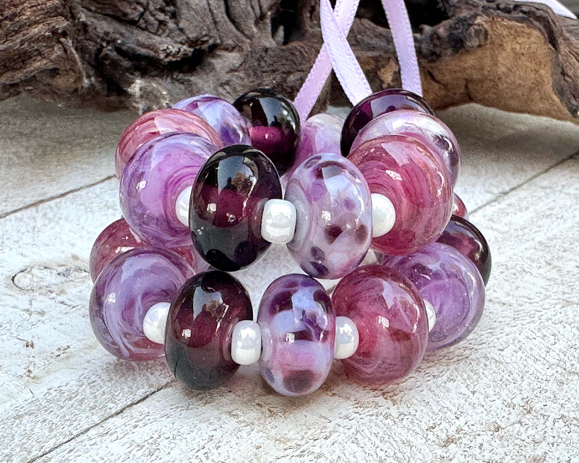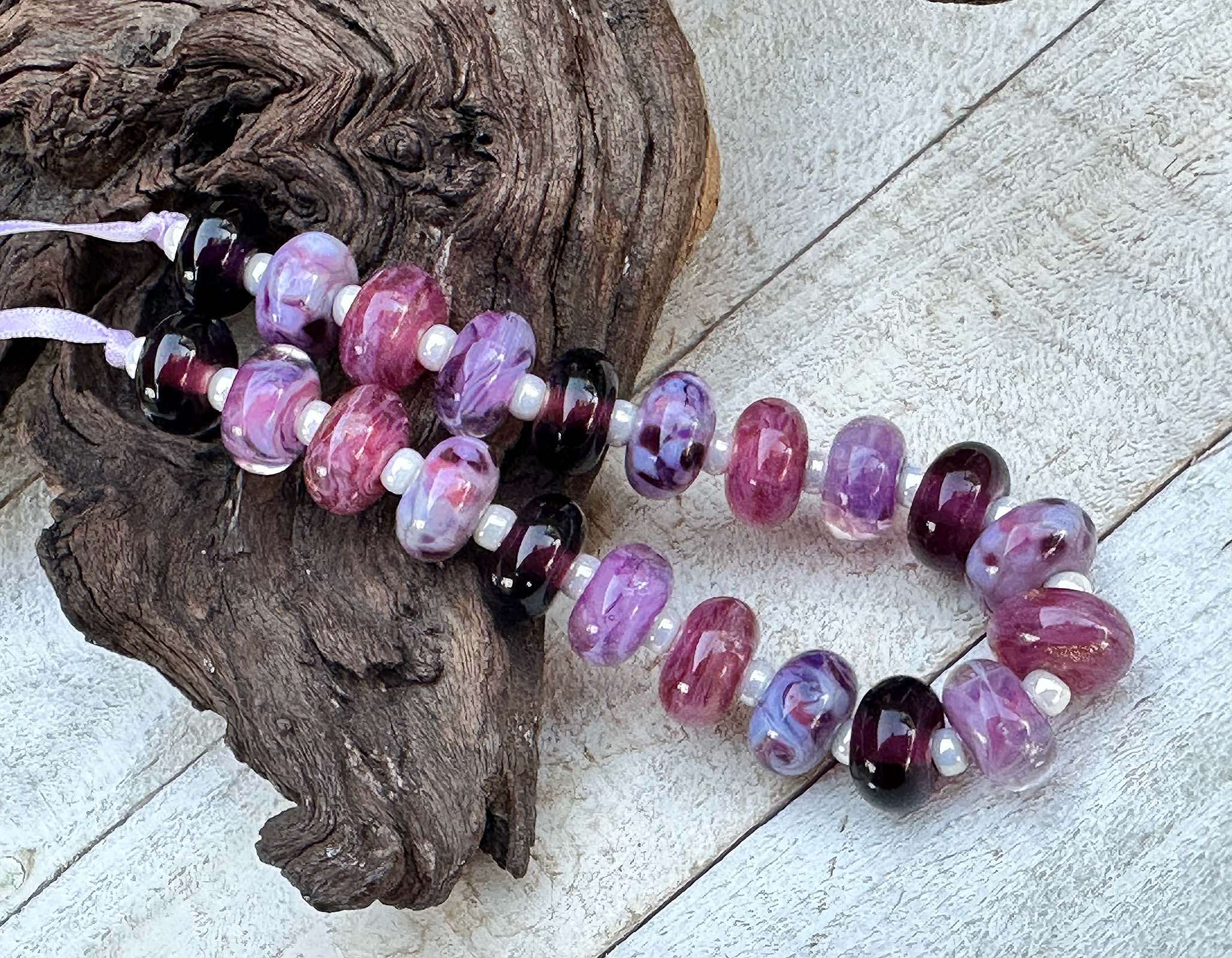 Introducing 21 handcrafted Rose Violet Aura Swirl lampwork beads — a vibrant collection where rose, violet, and plum hues blend into mesmerizing mosaic patterns. Each bead features a unique interplay of semi-transparent and opaque glass from my custom in-house blend, creating depth, luminosity, and visual intrigue.