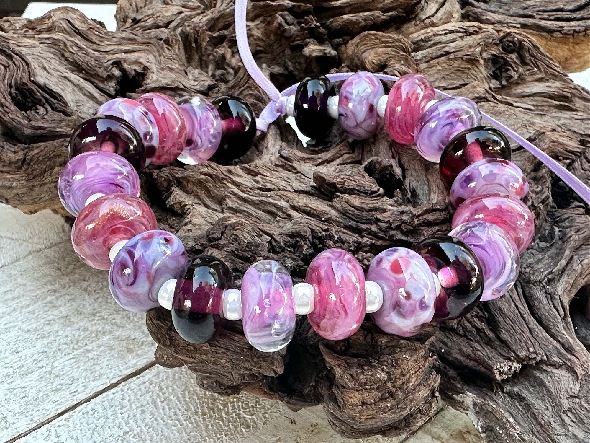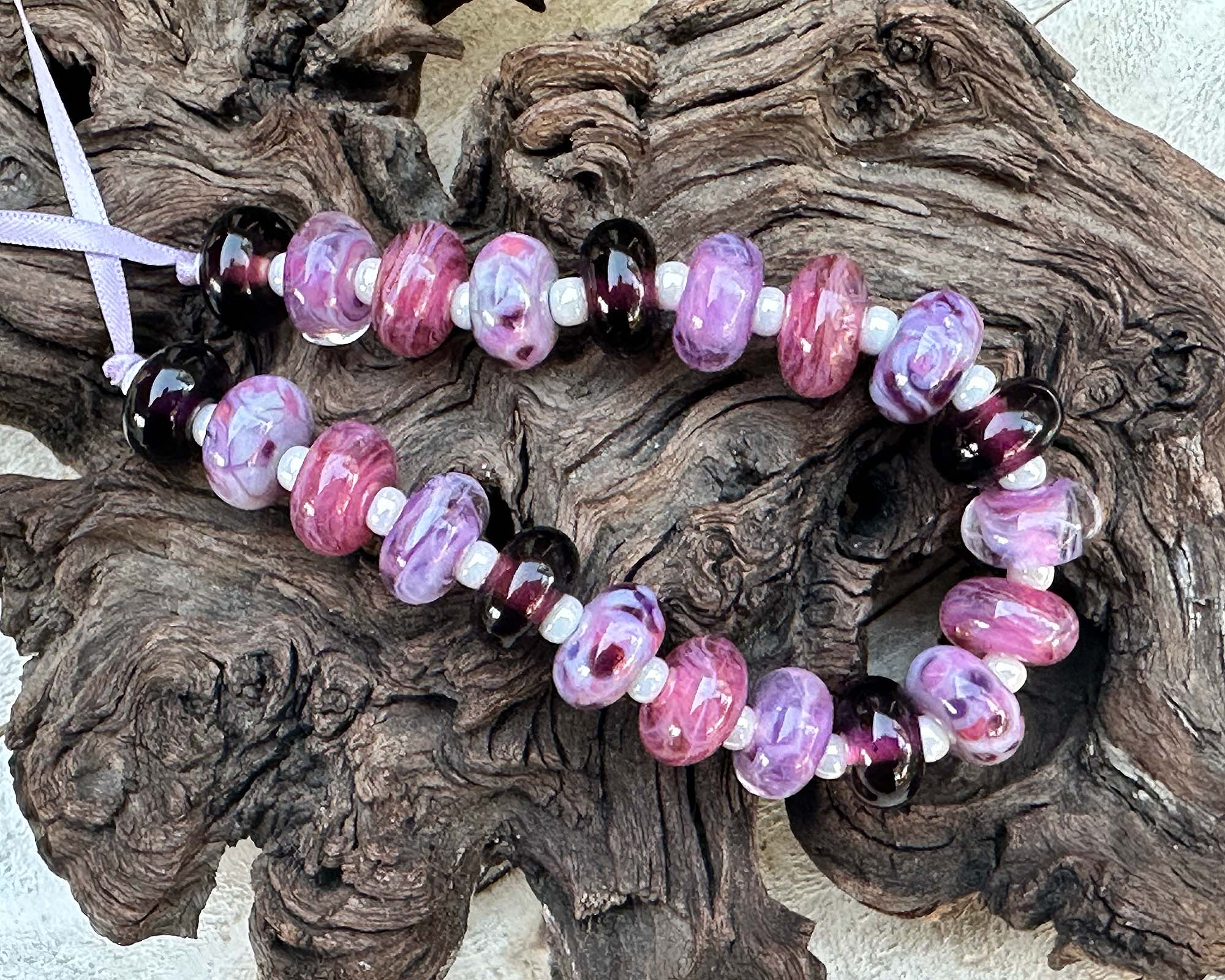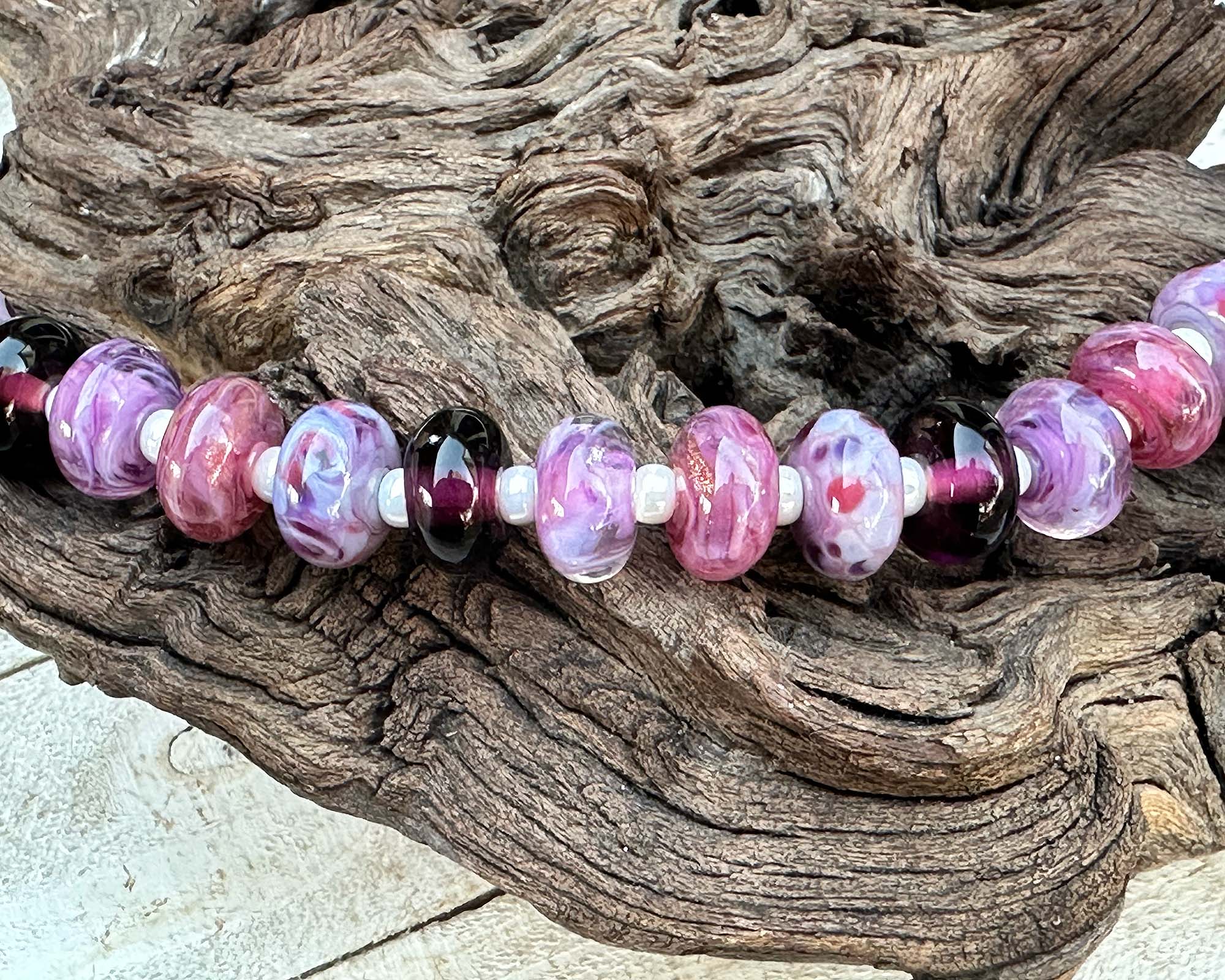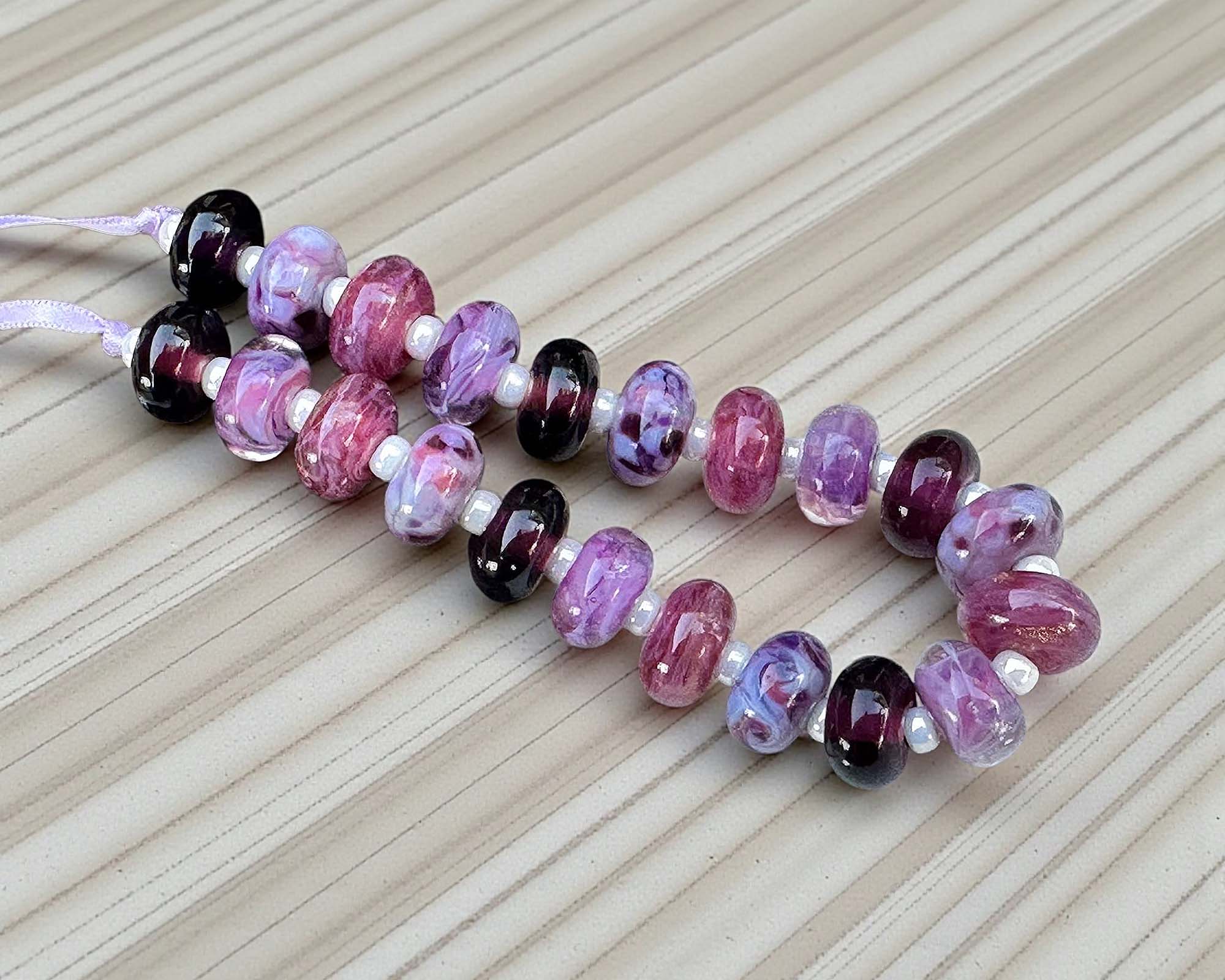 Introducing 21 handcrafted Rose Violet Aura Swirl lampwork beads — a vibrant collection where rose, violet, and plum hues blend into mesmerizing mosaic patterns. Each bead features a unique interplay of semi-transparent and opaque glass from my custom in-house blend, creating depth, luminosity, and visual intrigue.