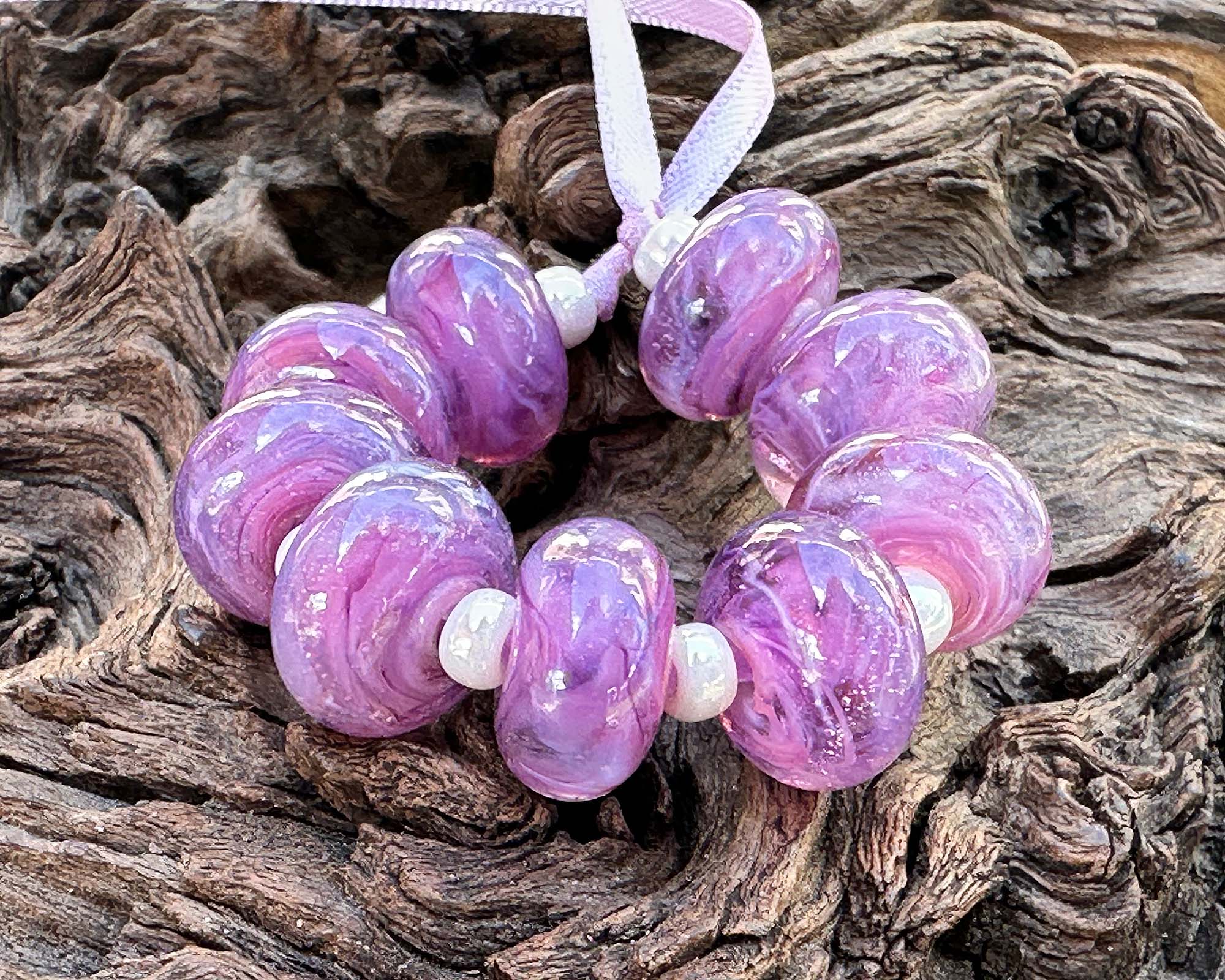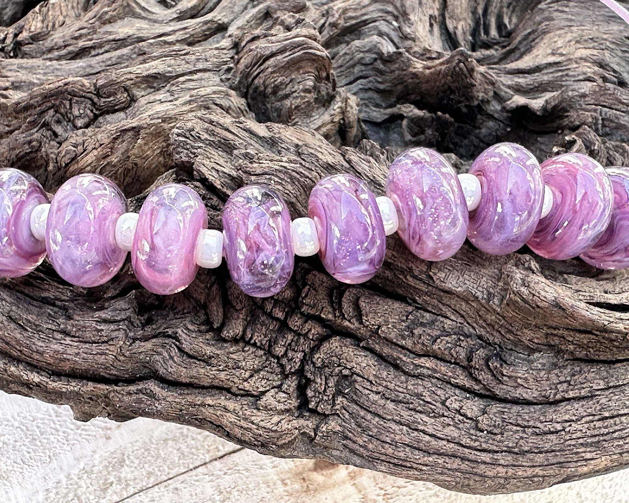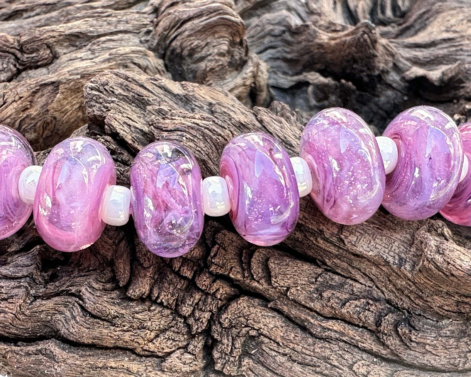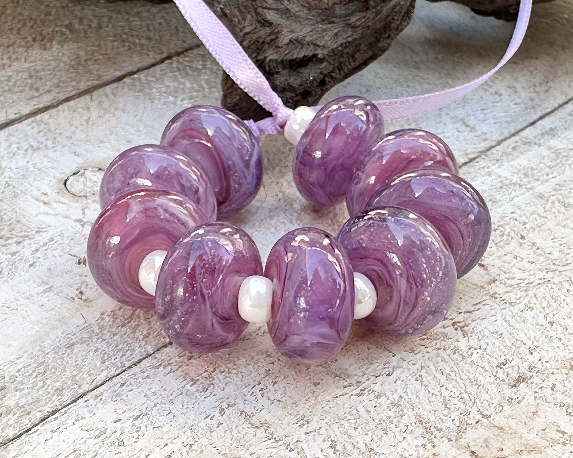 Discover the magic of handcrafted artistry with this delightful assortment of 9 Aura Purple Swirl lampwork beads! Every bead is a unique masterpiece, swirling with rich purples and whispers of pink throughout crystal-clear glass. Straight from our exclusive in-house Aura collection, these stunning components are ready to spark your next jewelry adventure—whether you're designing bold statement pieces or delicate, wearable art. Let your creativity shine with these one-of-a-kind glass treasures!