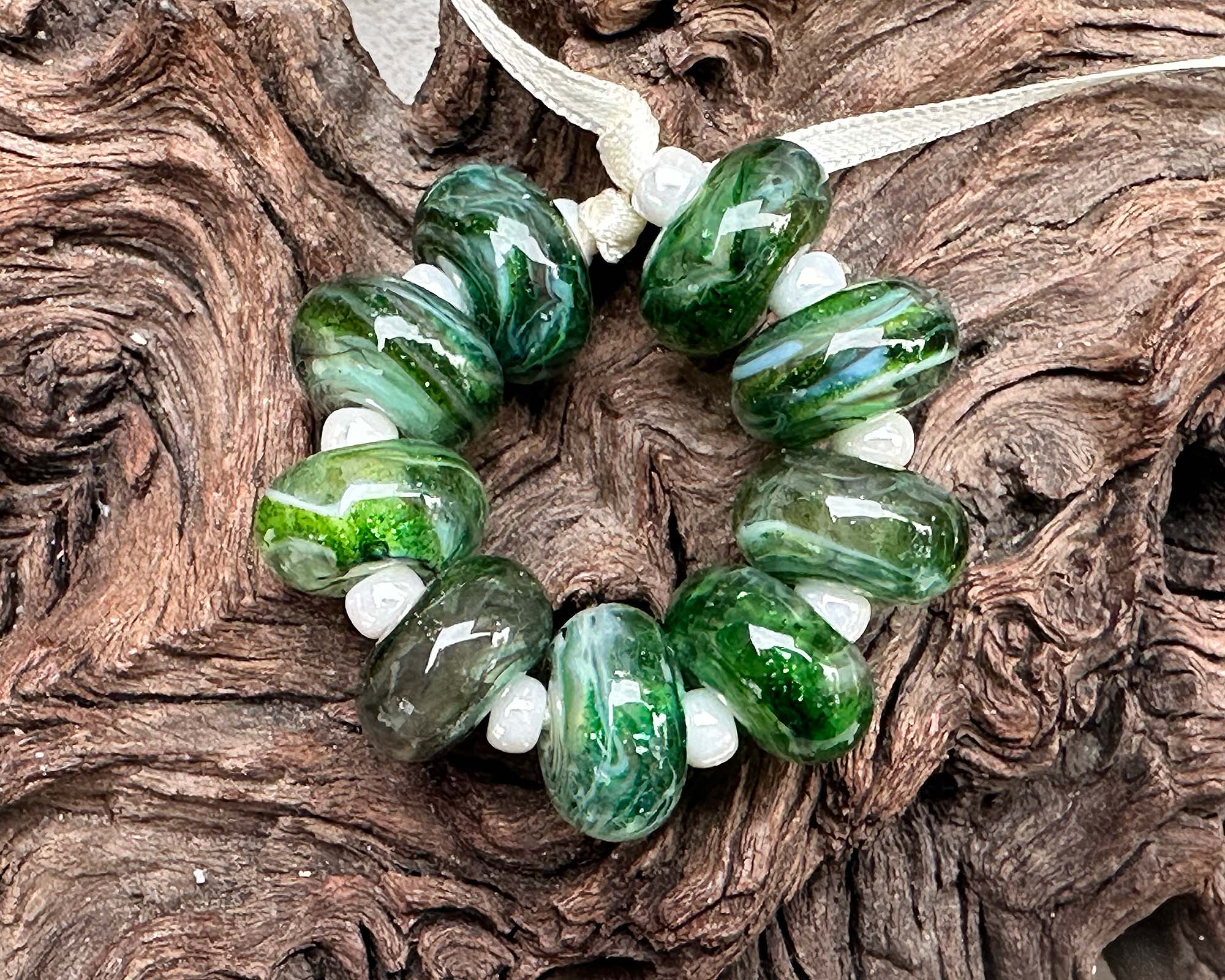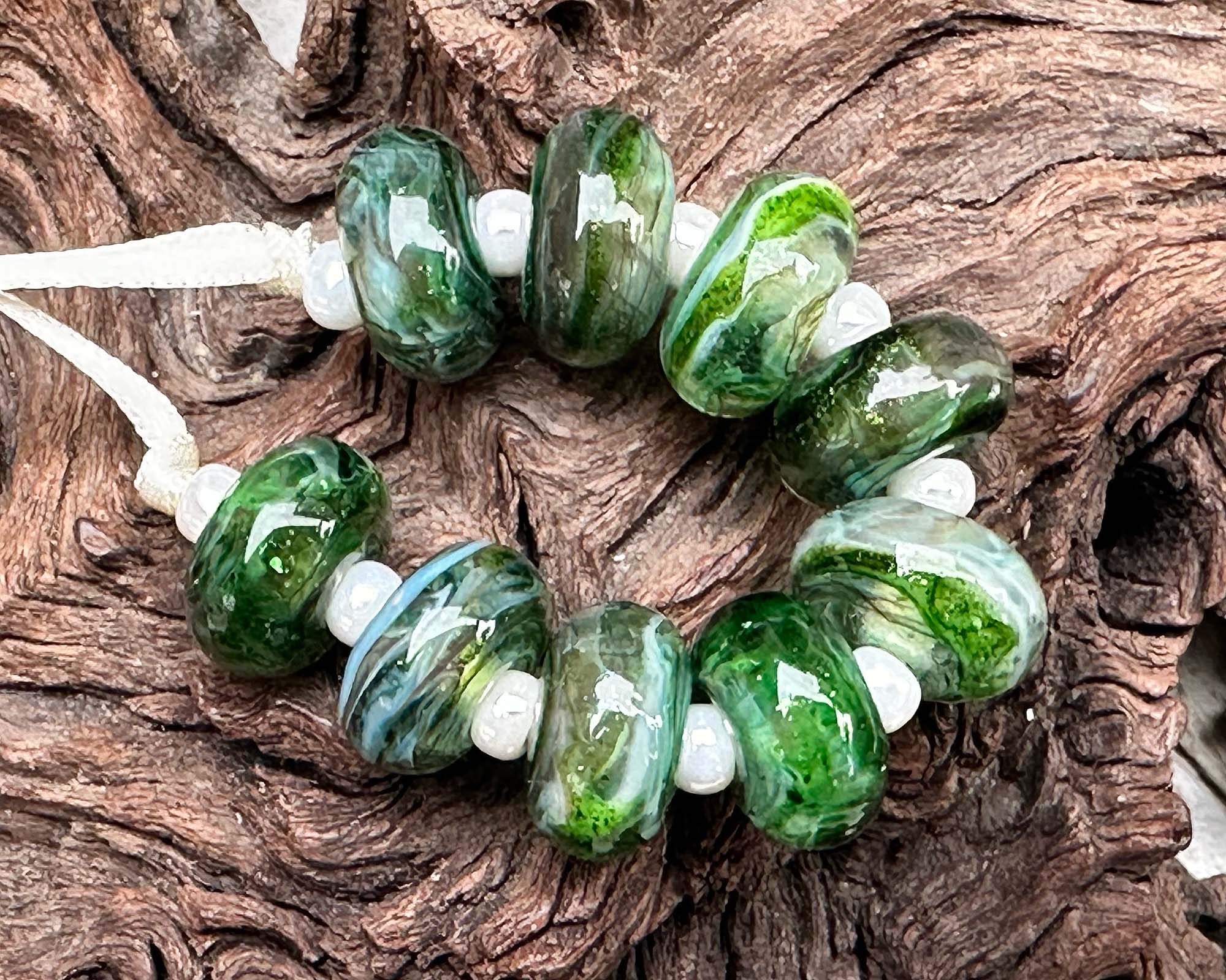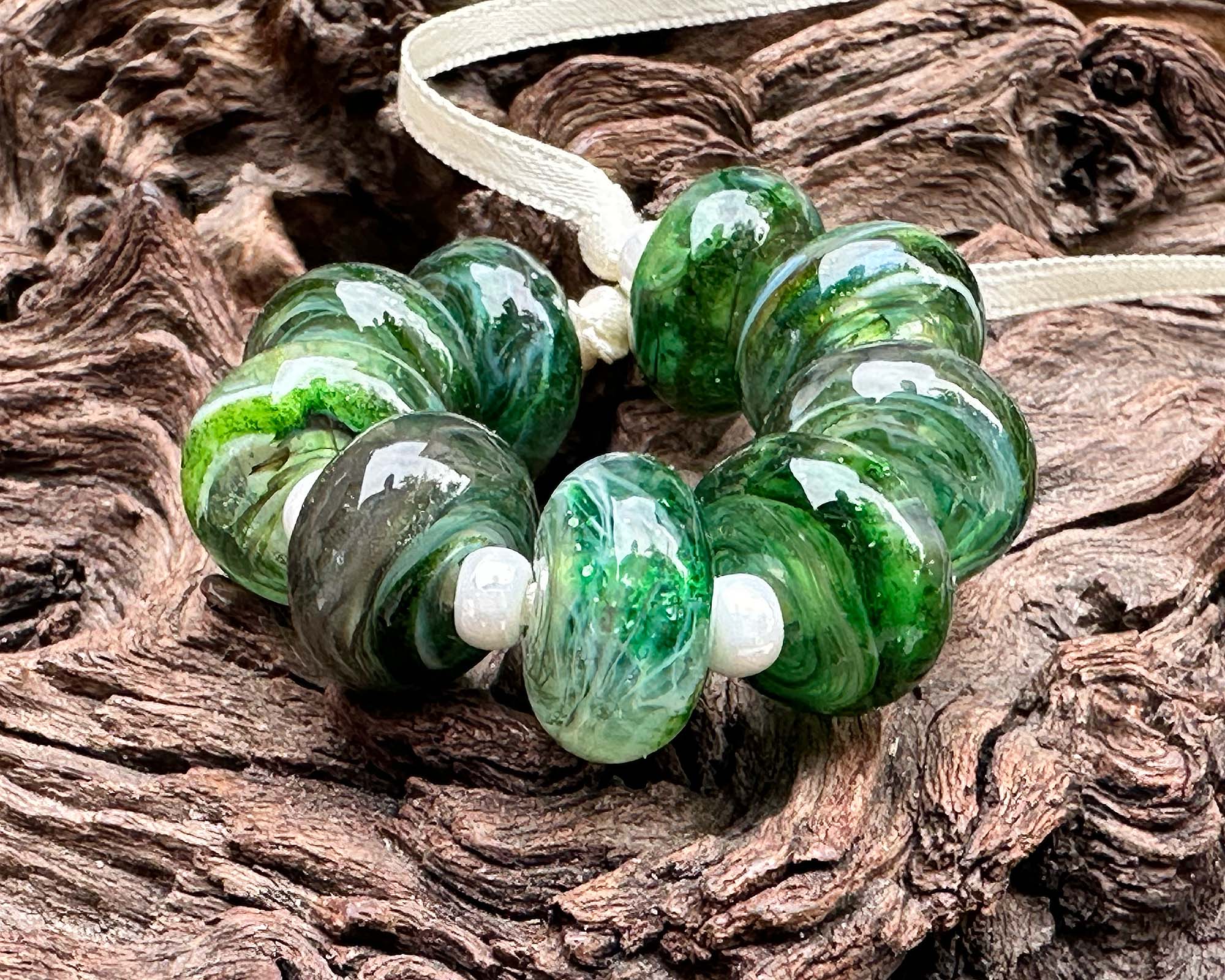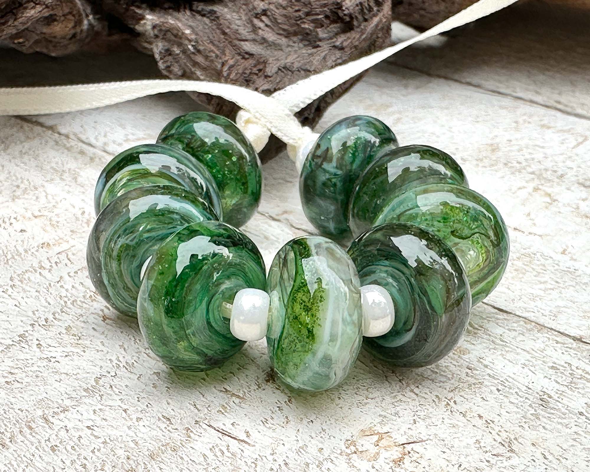 9 Emerald Shimmer Swirl Lampwork Beads Set SRA