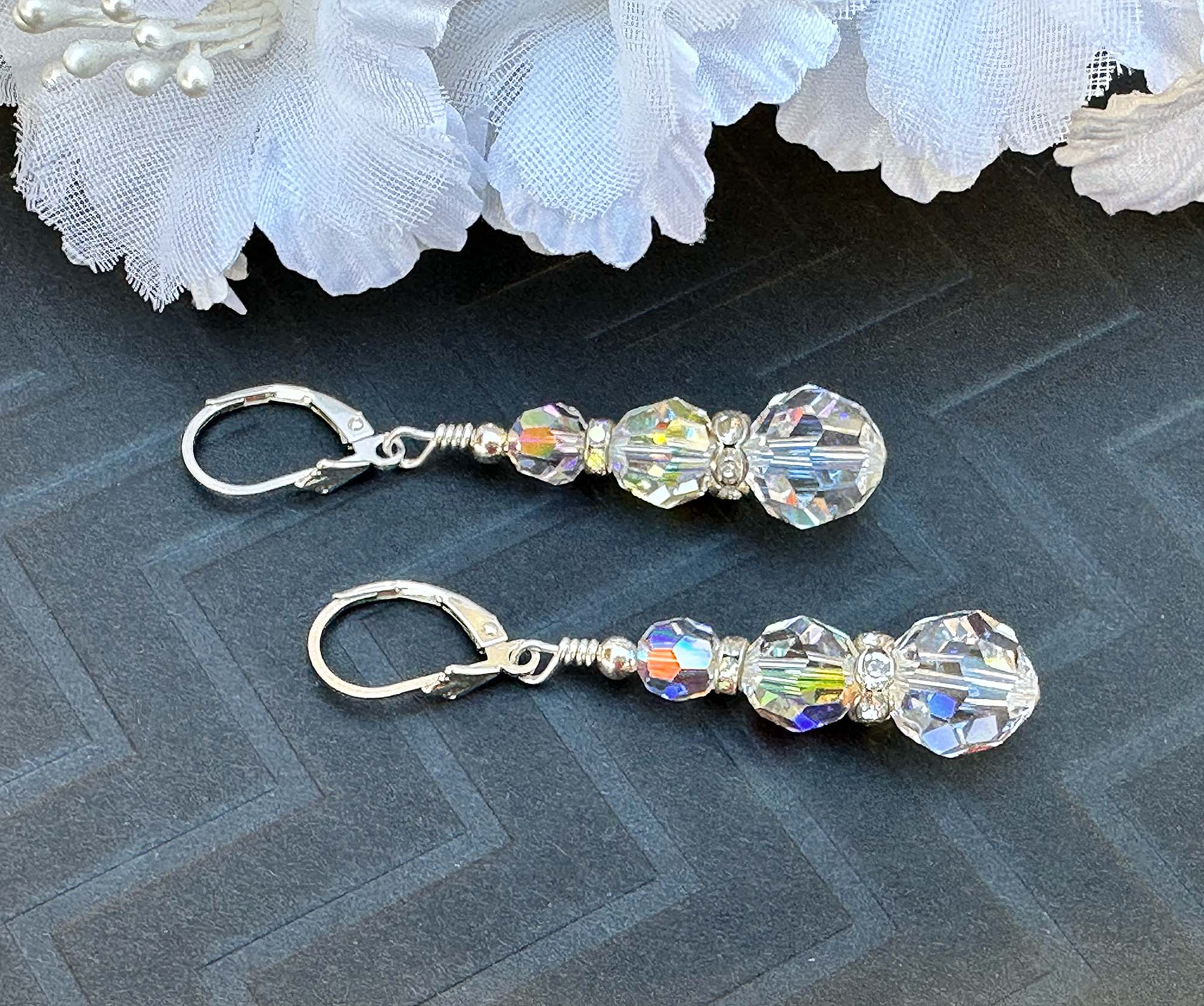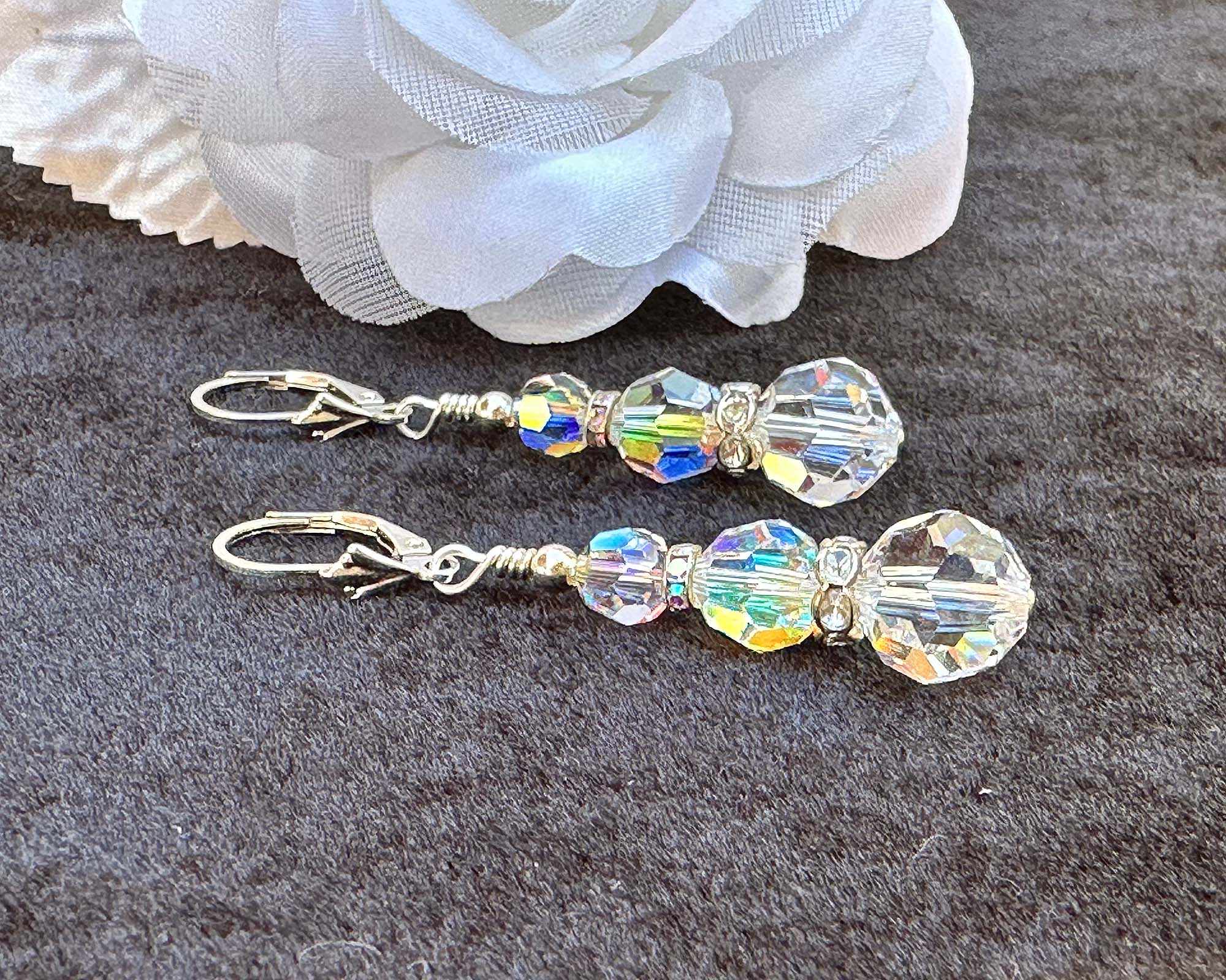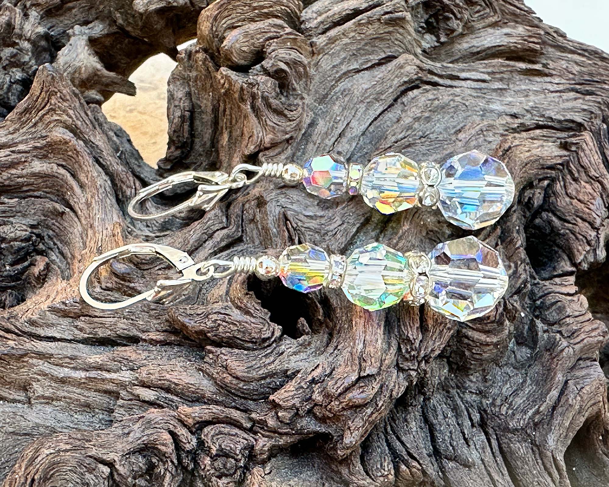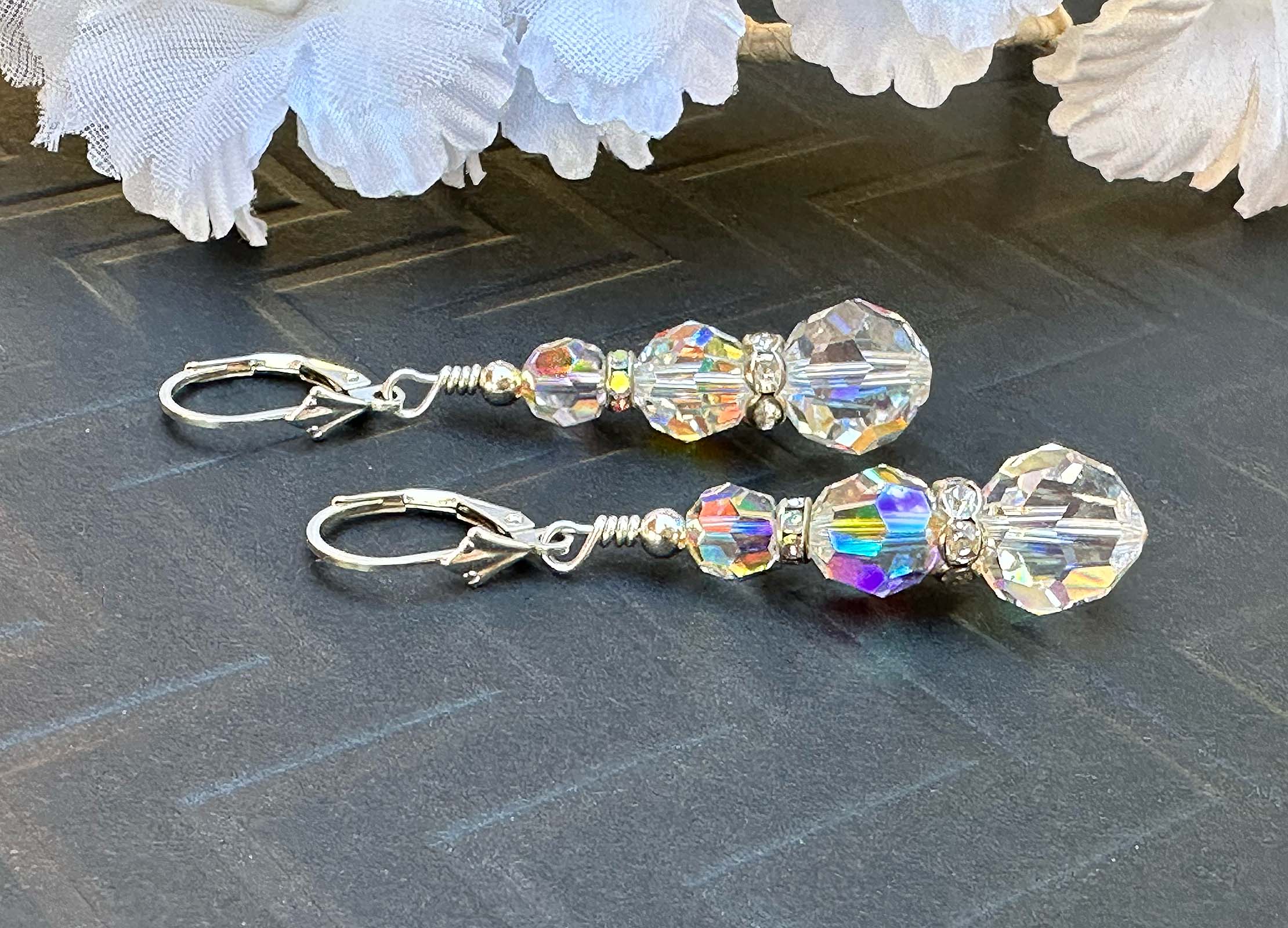 Get ready to sparkle with these whimsical 2-inch drop earrings that are pure magic! Handmade with care, they feature dazzling iridescent Swarovski Austrian crystals - no longer in product!. Combined with intricately faceted round beads and shimmering crystal silver-plated rondelles. Whether you're heading out for a night on the town or just want to add some pizzazz to your everyday look, these beauties deliver an irresistible glow that's sure to make you shine.