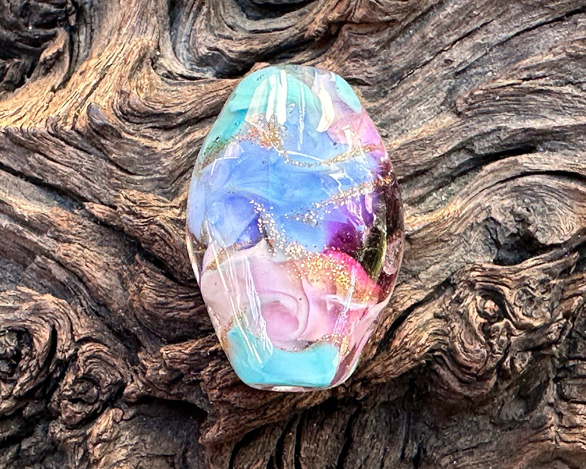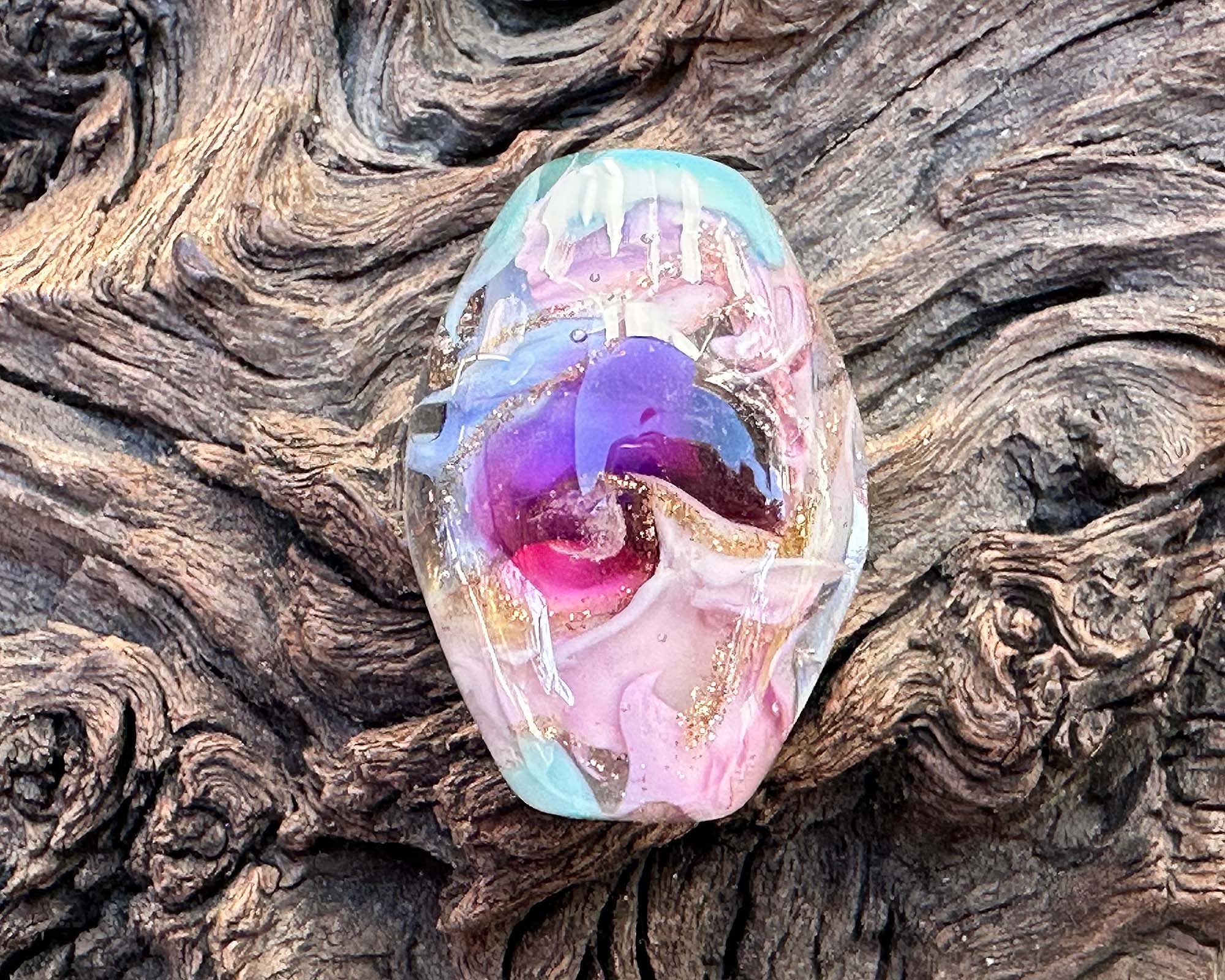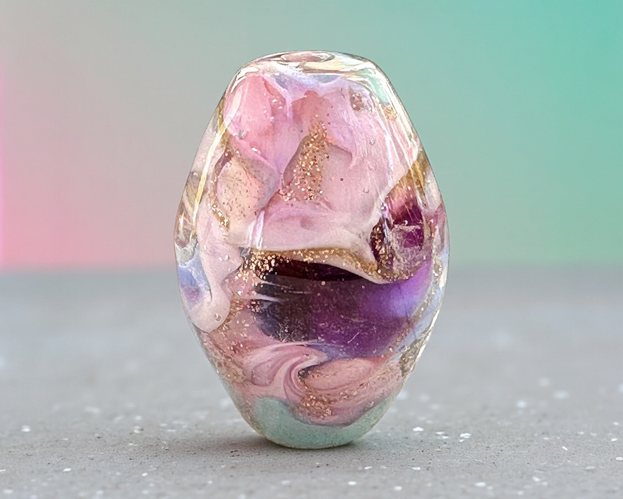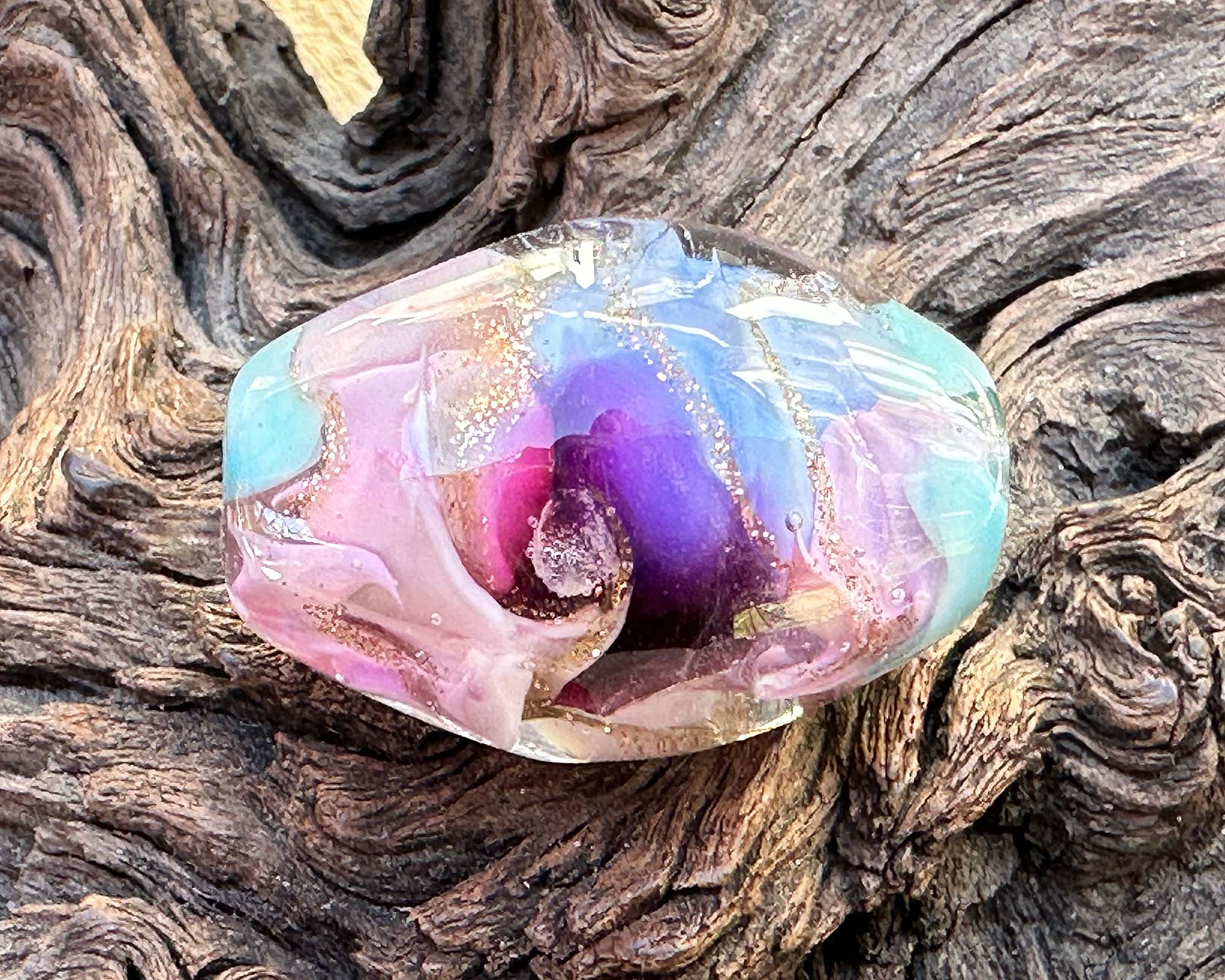 Imagine a tiny glass masterpiece bursting with color! This handcrafted focal bead features dreamy swirls of pink, periwinkle, fuchsia, and turquoise dancing through the glass, all adorned with glimmering gold aventurine details. Each layer tells a story of artisan craftsmanship, making it the perfect eye-catching centerpiece for your next jewelry creation. Kiln-fired for lasting beauty, this SRA bead is built to sparkle through every wear and adventure.