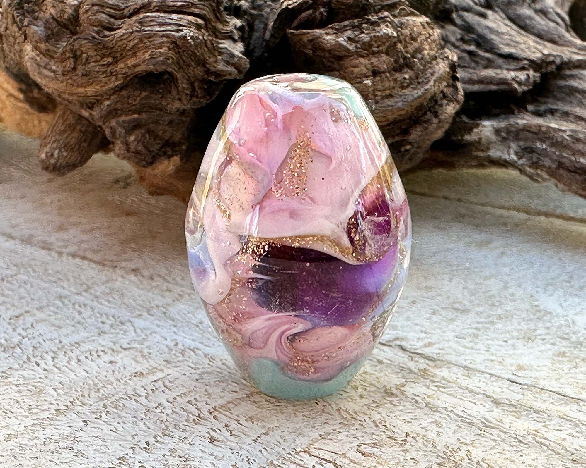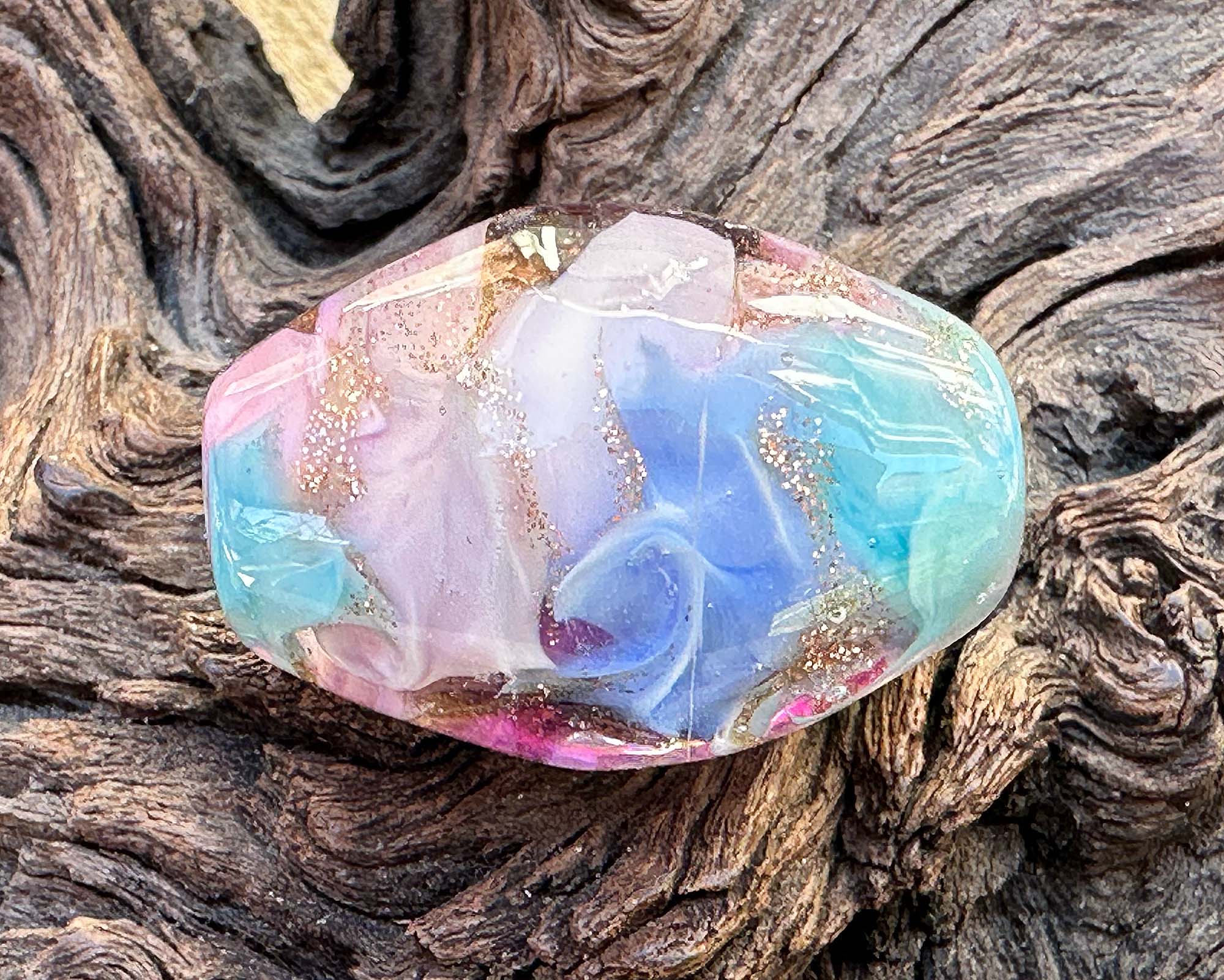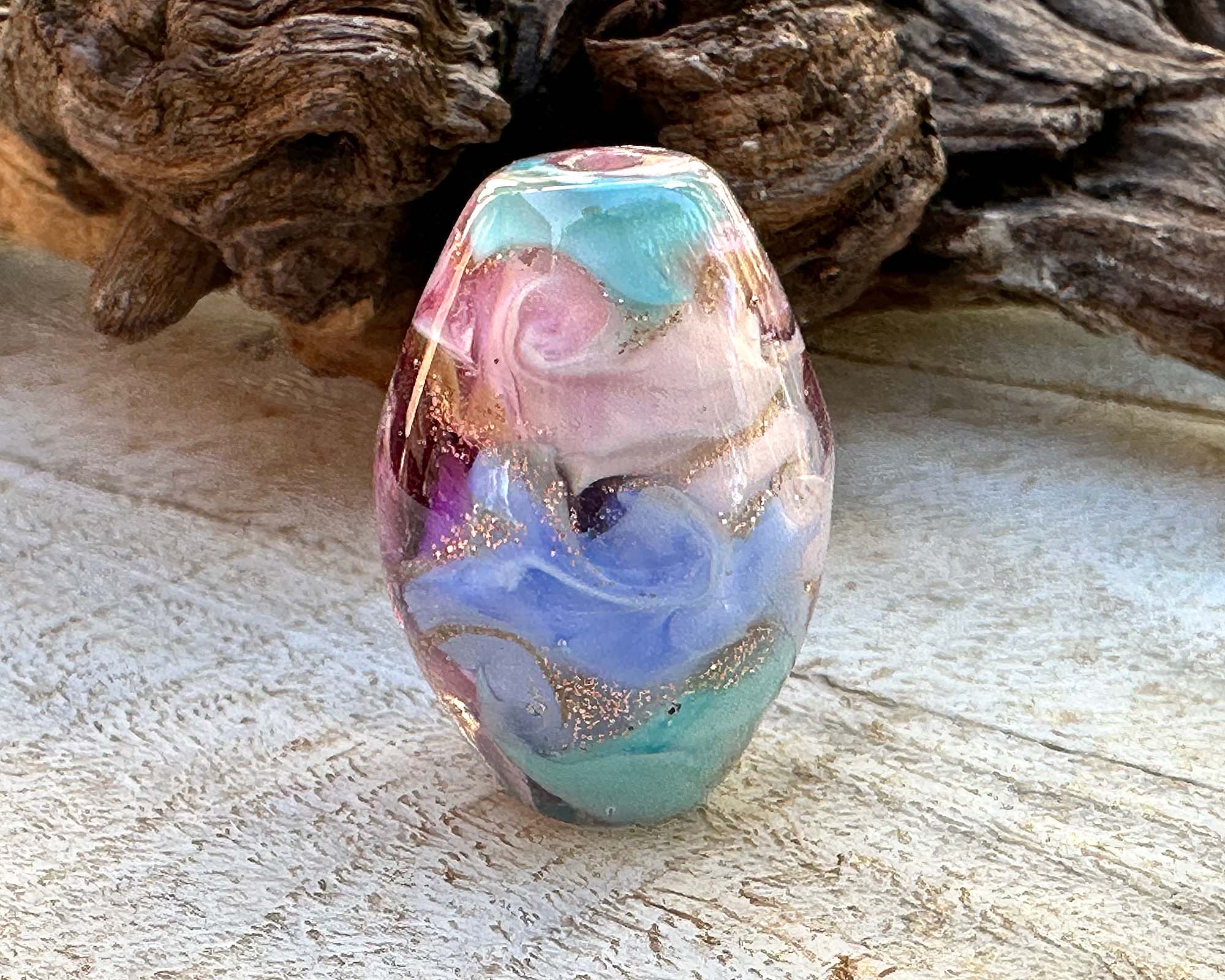 Fall in love with the Pastel Shimmer Swirls Lampwork Focal Bead, a playful mix of pink, periwinkle, fuchsia, turquoise, and shimmering gold aventurine accents. It’s a sparkling splash of joy for your jewelry projects!