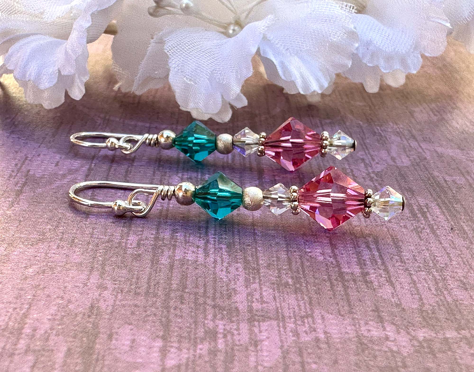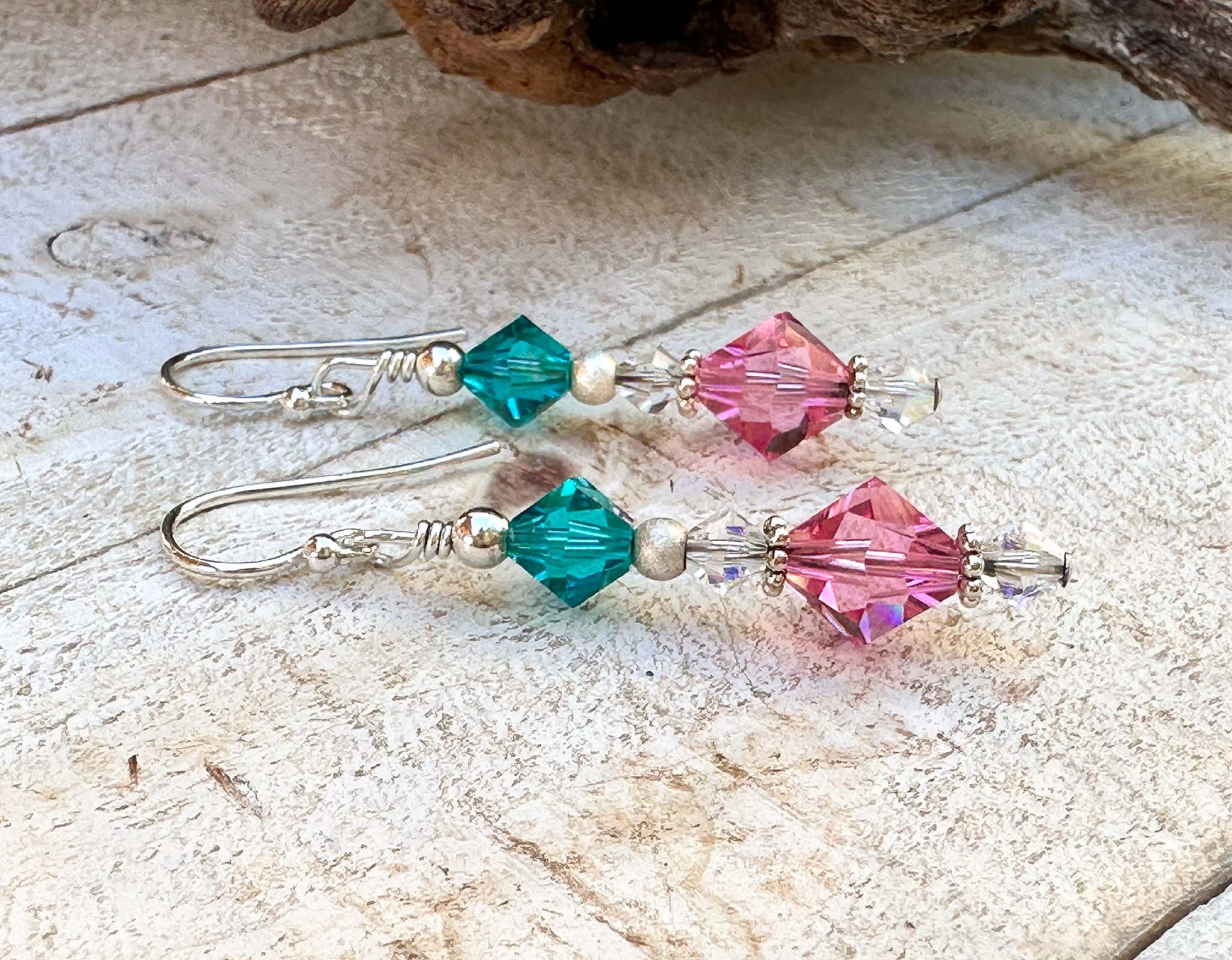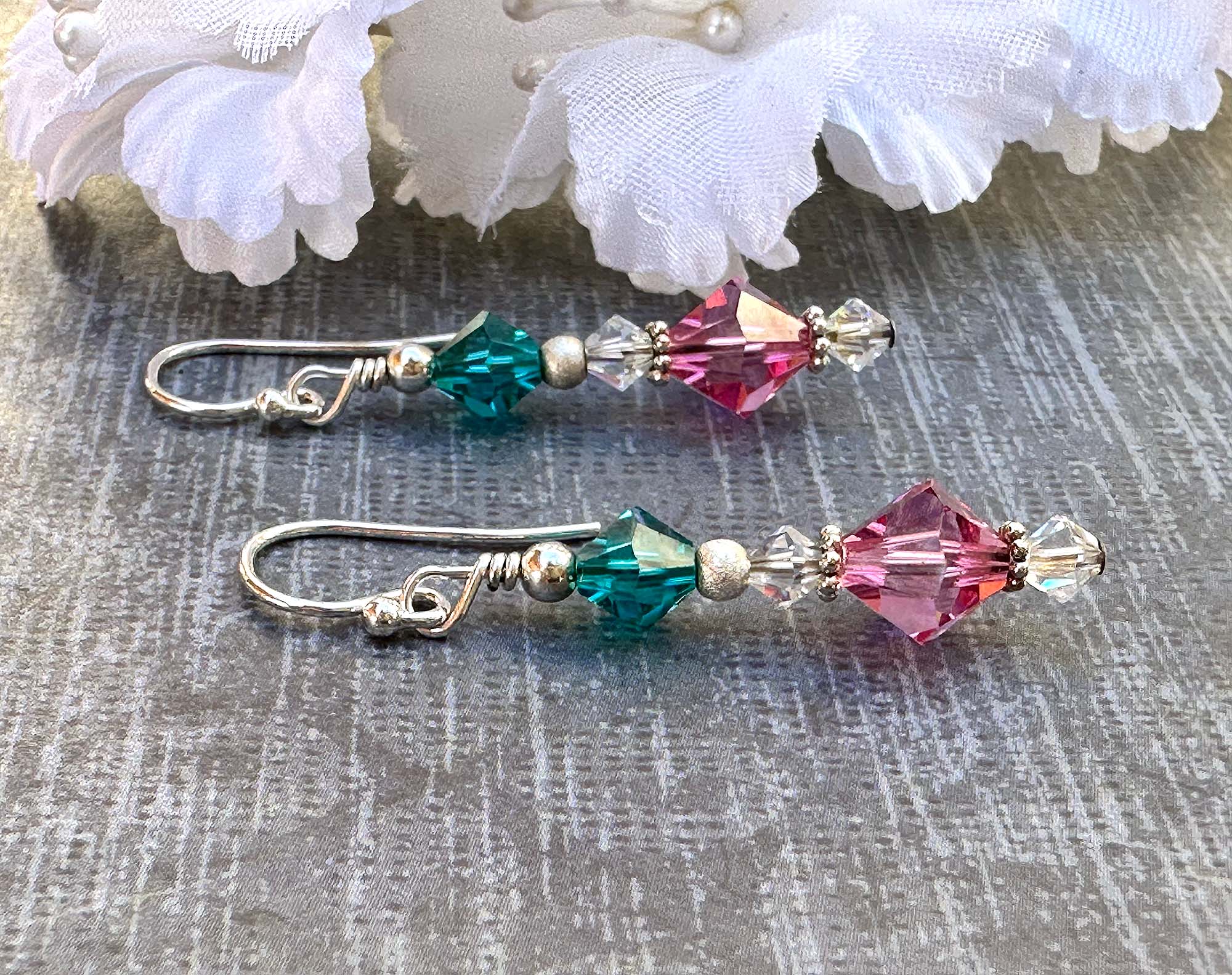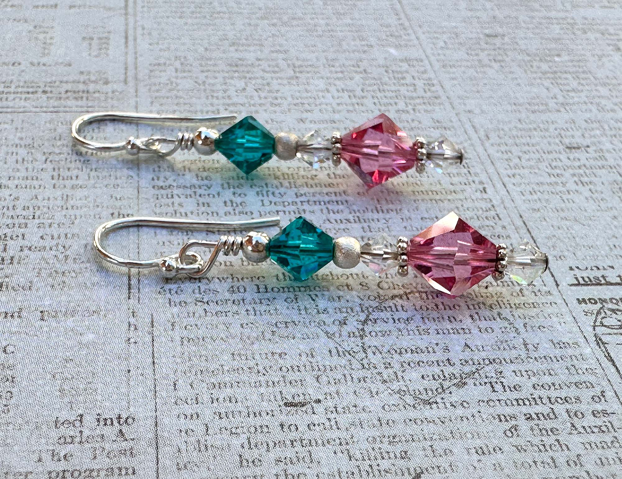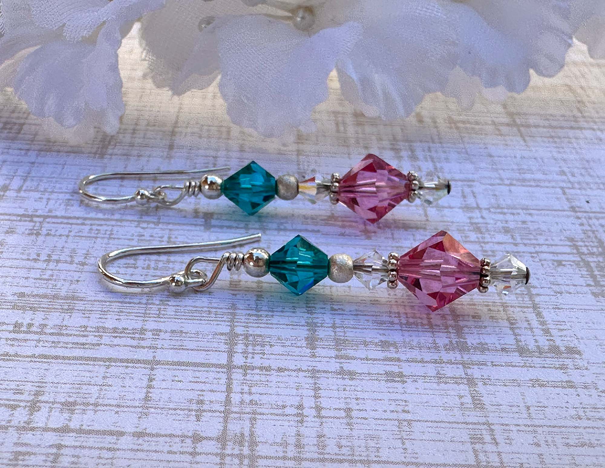 Handcrafted 2-Inch Teal and Rose Pink Crystal Beaded Earrings