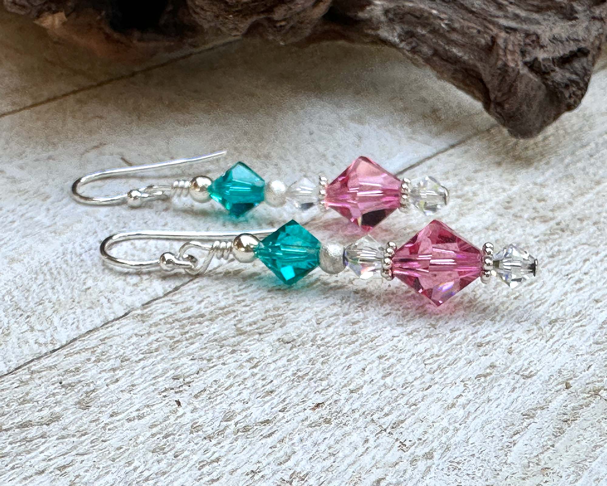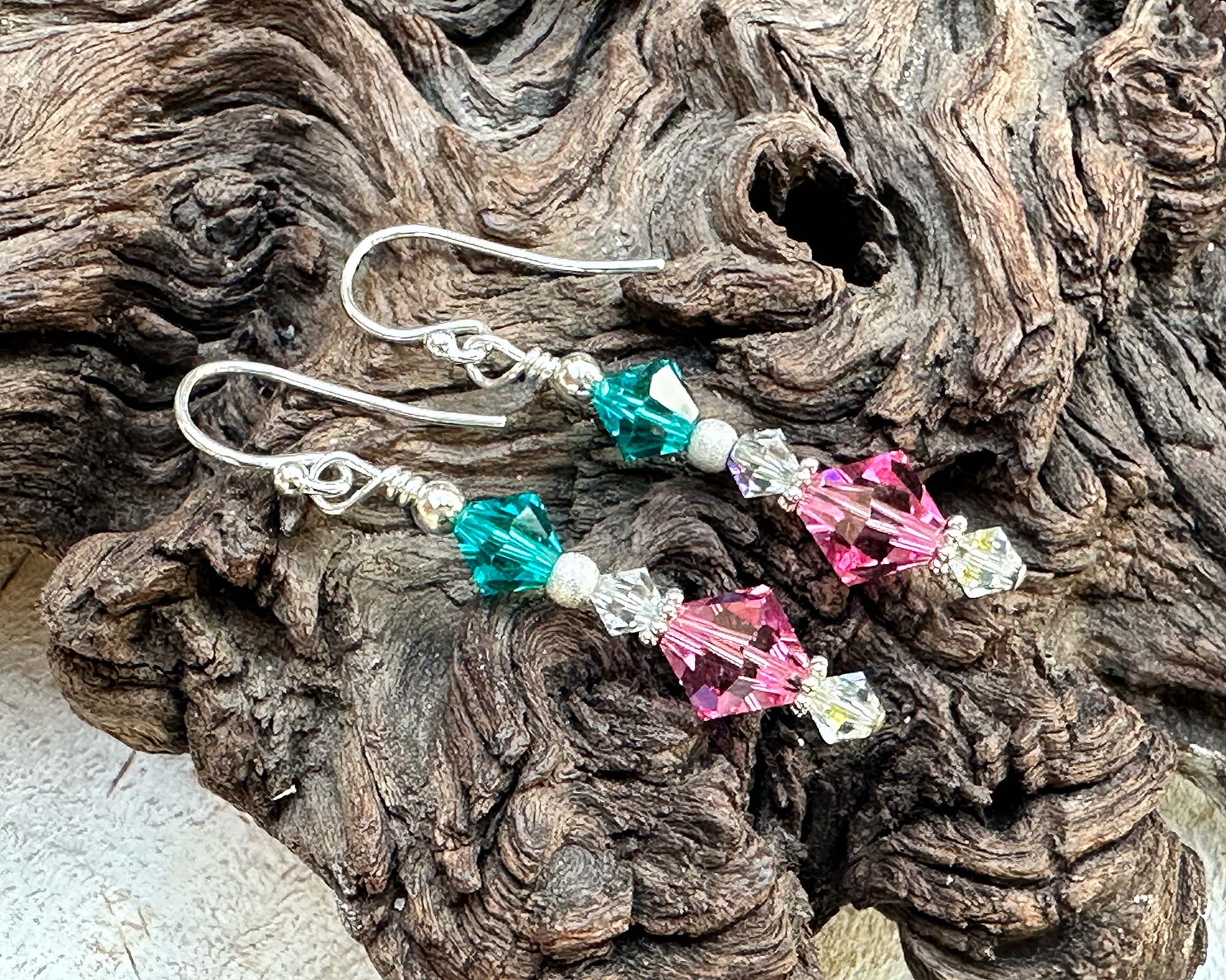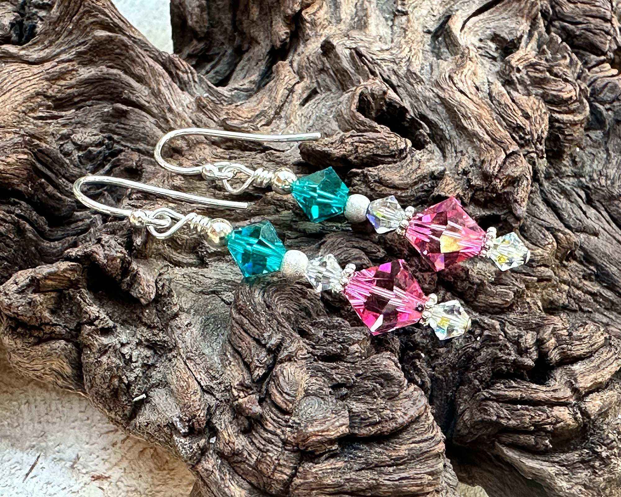 Discover the allure of these handcrafted 2-inch teal and rose pink crystal beaded earrings, meticulously created with sparkling Swarovski Austrian crystals in crystal AB, rose, and teal hues. Each earring features light satin brushed sterling silver, complemented by bright Bali .925 silver accents and silver earwires, ensuring both elegance and comfort.