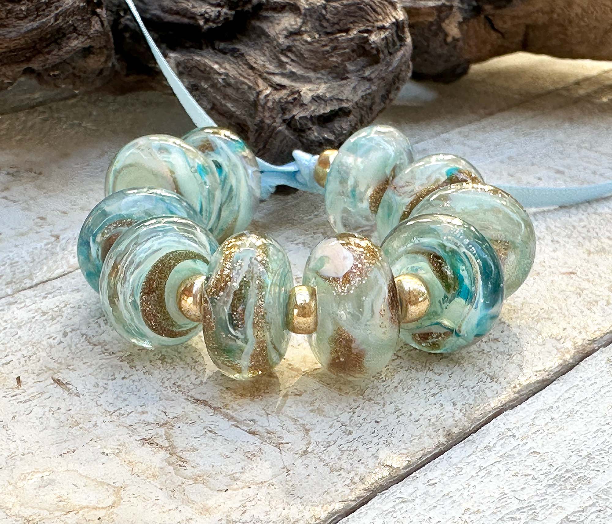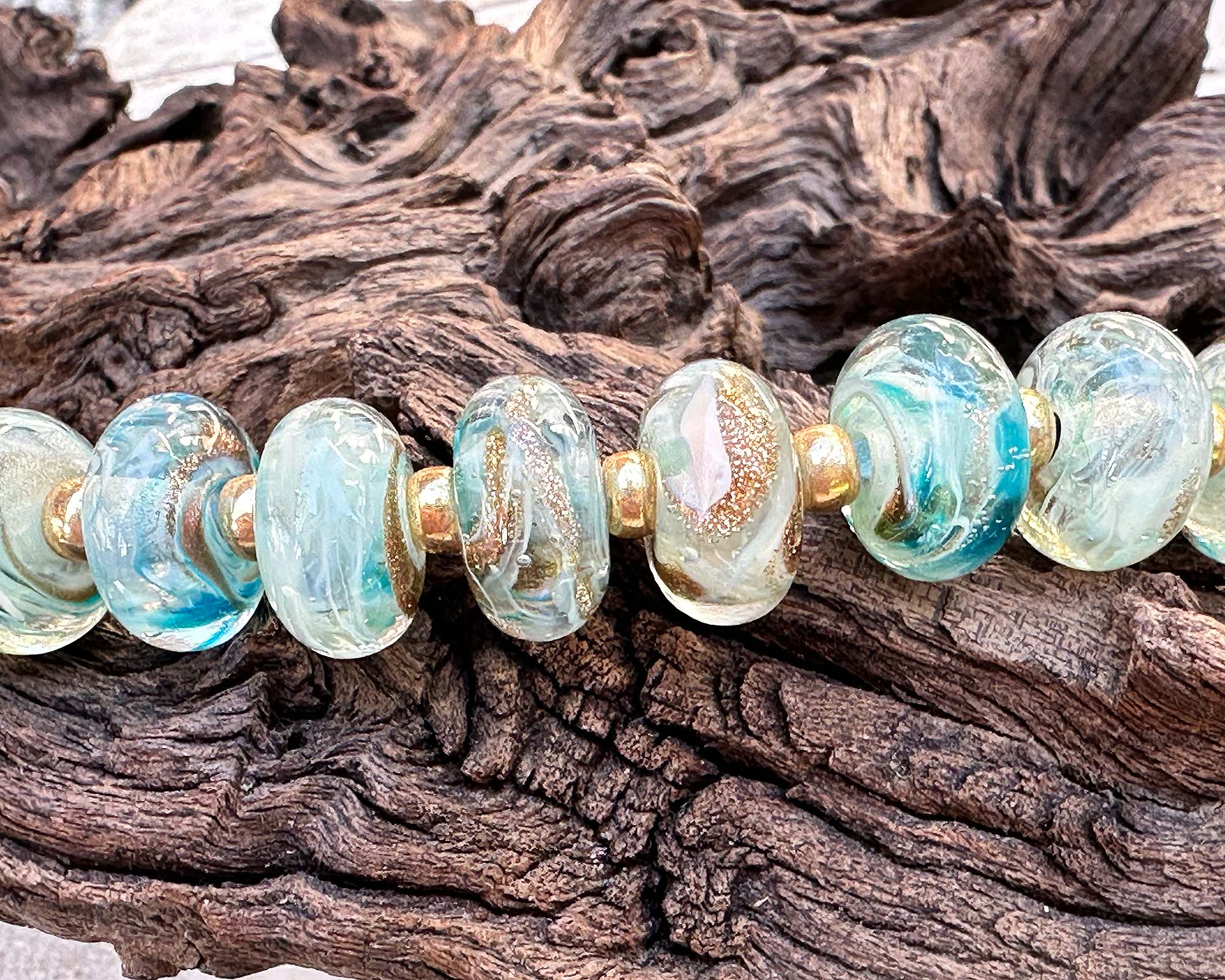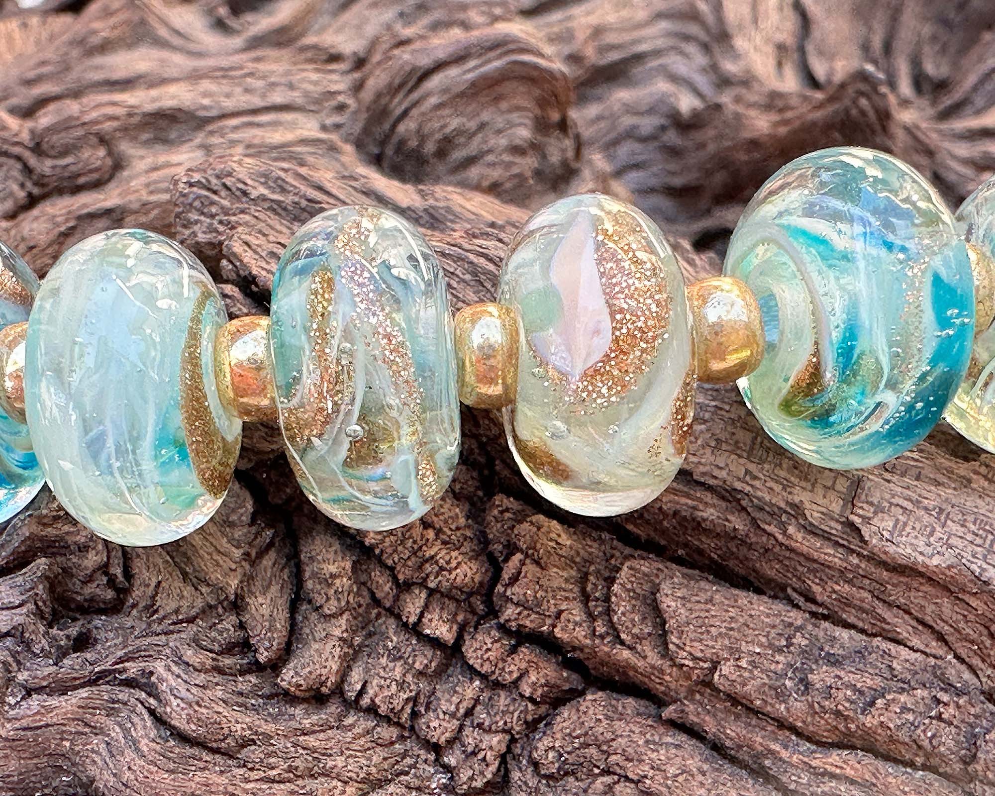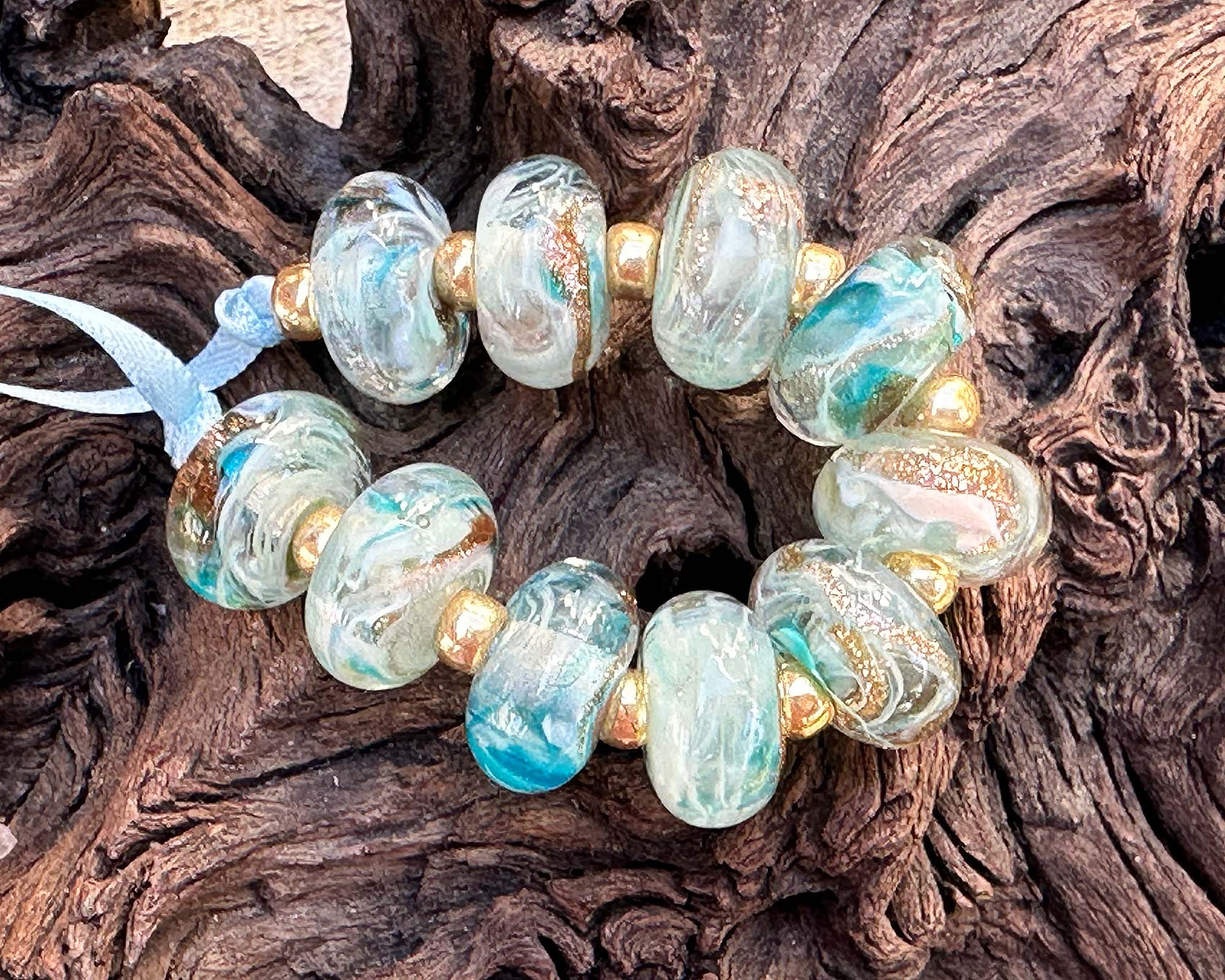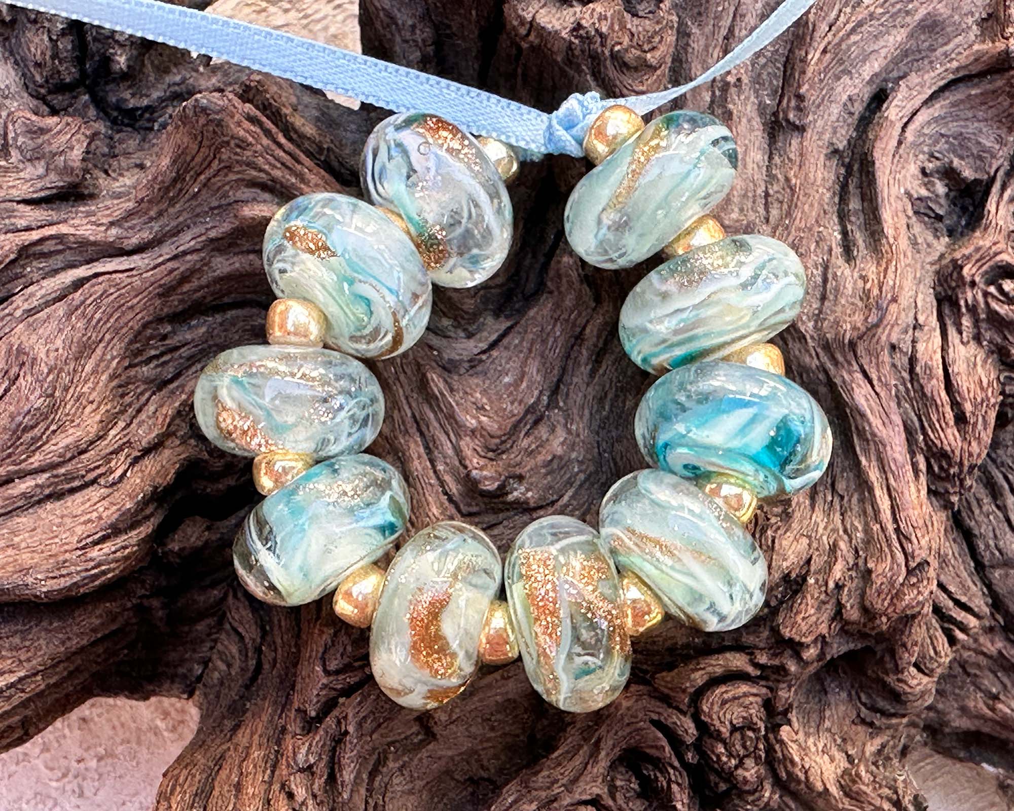 Get ready to sparkle with this playful set of 10 artisan lampwork beads bursting with personality! Each bead is a tiny treasure featuring swirling aqua, teal, ivory, and shimmering gold aventurine that catches the light beautifully. Perfect for creating five pairs of statement earrings or mixing into your signature bracelets and necklaces. These gems are kiln-annealed for serious staying power, so your creations will dazzle for years to come. Let your beading adventures begin!