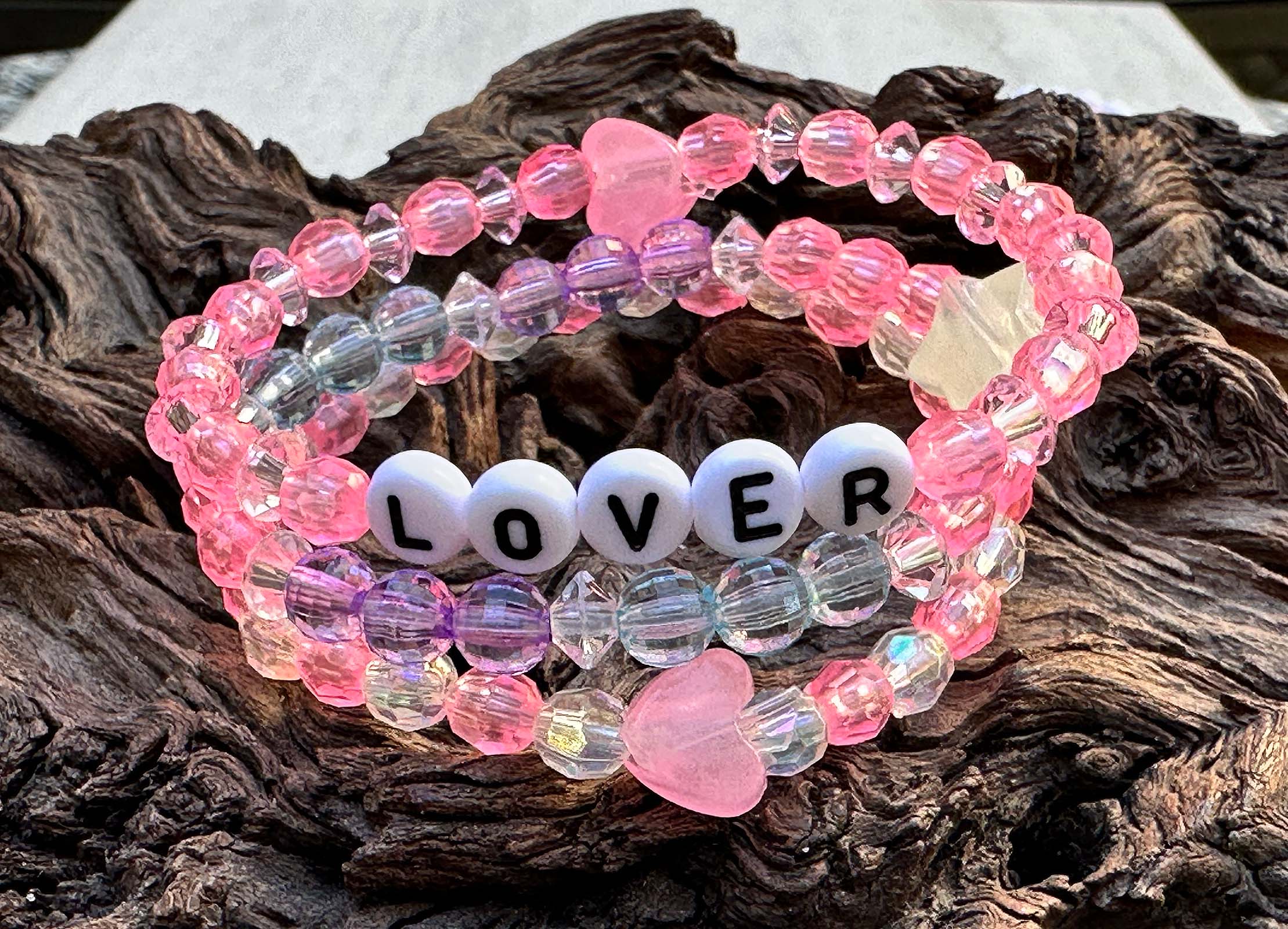 "Lover" Artisan Bracelet Set — A trio of whimsical stretch bracelets designed for young dreamers! Each set features enchanting pink beads and hearts, with "lover" spelled out across one bracelet while the others showcase complementary accent colors. Sized perfectly for smaller wrists (5-5½ inches), these handcrafted pieces mix magic with style. Stack them together or wear them solo—either way, they're bursting with charm and personality.