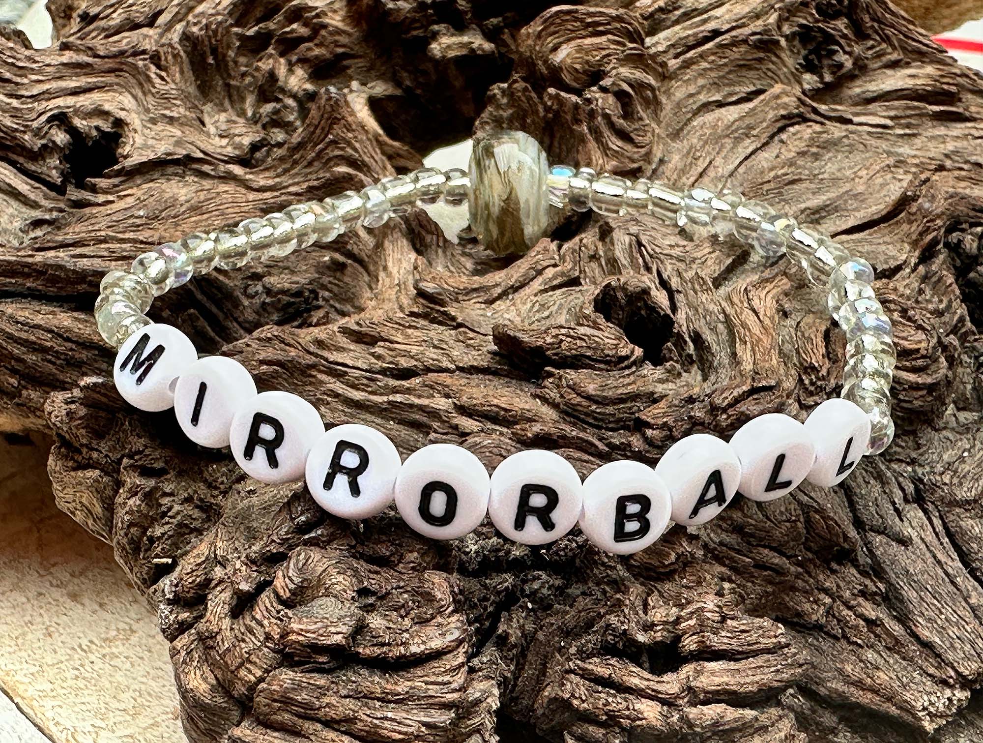 "Mirrorball" Artisan Bracelet — This delightful stretch bracelet brings together handcrafted charm with playful personality. Adorable white letter beads mingle with shimmering silver-lined Czech seed beads, all anchored by a gorgeous beige lampwork focal bead that's as unique as you are. Perfect for smaller wrists at 6 1/2 inches, it's the kind of piece that sparks joy and conversation. Slip it on to add a pop of artistic character to your everyday style.