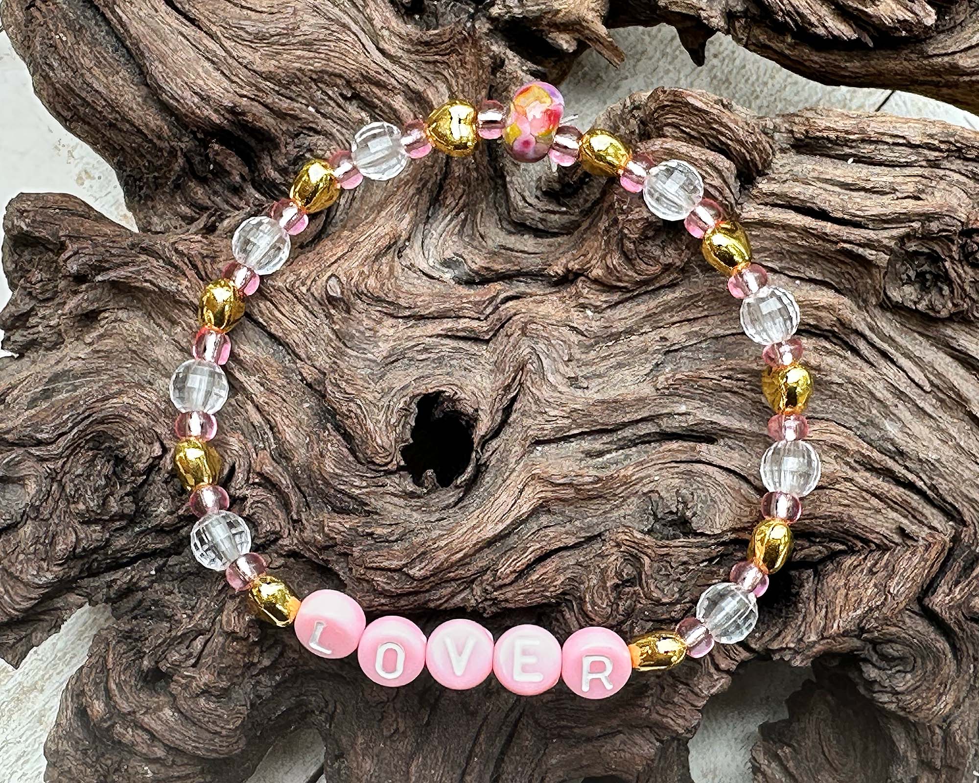 "Lovers" Artisan Bracelet — a romantic, charming piece featuring tiny pink crystals, gold beads, and a pink lampwork bead. Carefully made, this stretch bracelet fits smaller wrists (7 inches) and adds joyful color and artistic flair to any outfit.