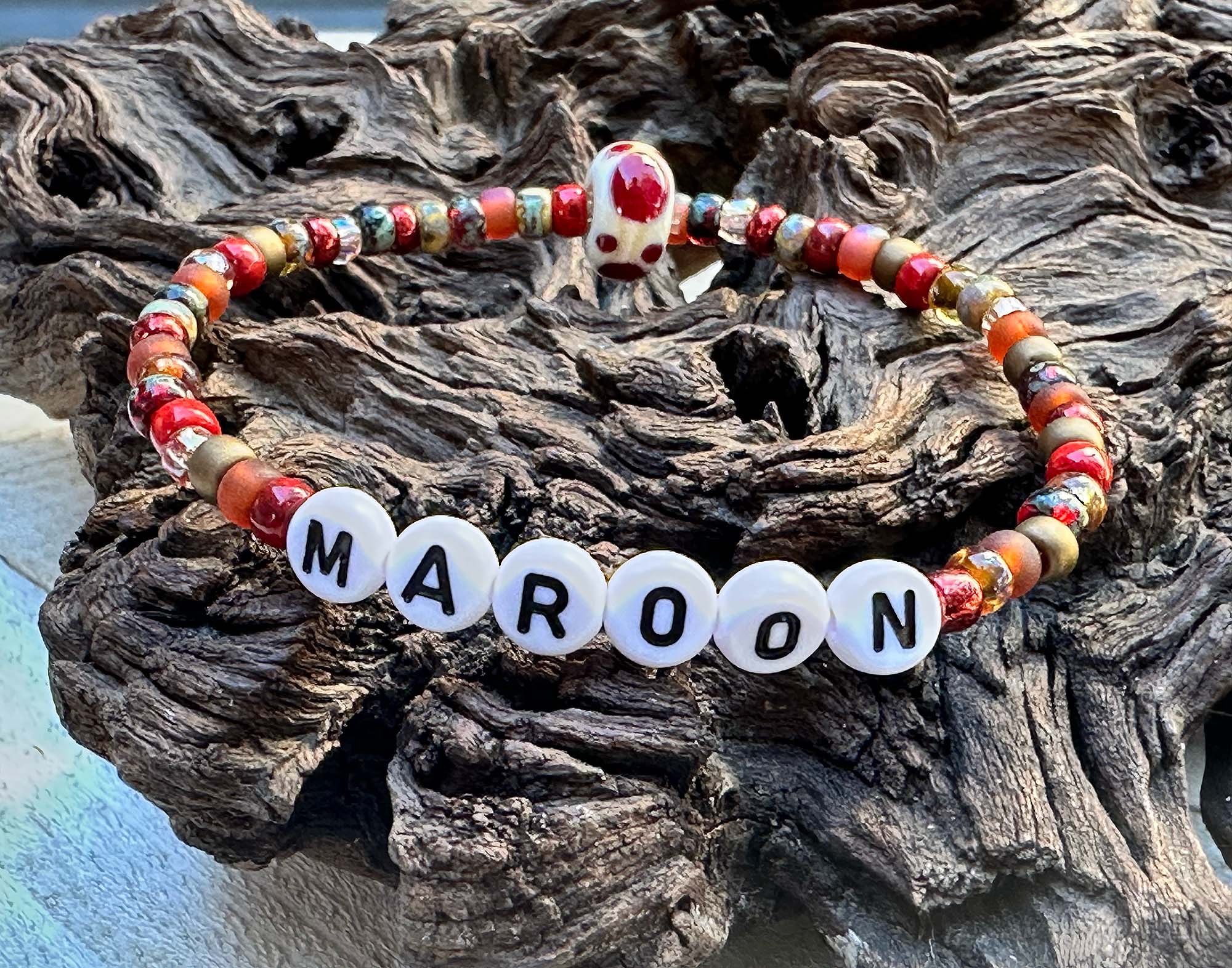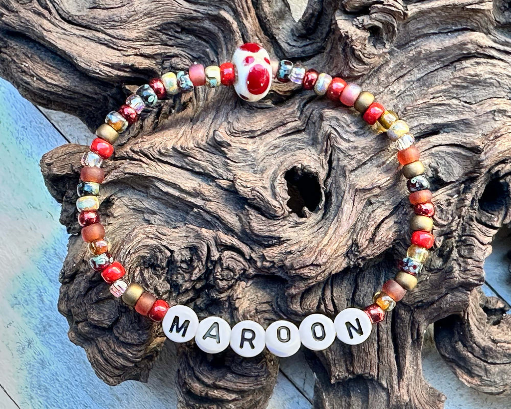"Maroon" Artisan Bracelet — Slip on this delightful 7-inch bracelet and let your personality shine! Featuring a one-of-a-kind red lampwork bead as the star, it's paired with white letter beads that spell out your mood, plus a matte blend of reds, maroons, golds, and brown, all in the old world style. Each handcrafted piece brings its own character and charm. The stretchy design fits comfortably and effortlessly complements any outfit, making it the perfect everyday accessory that'll have you grinning at your wrist.