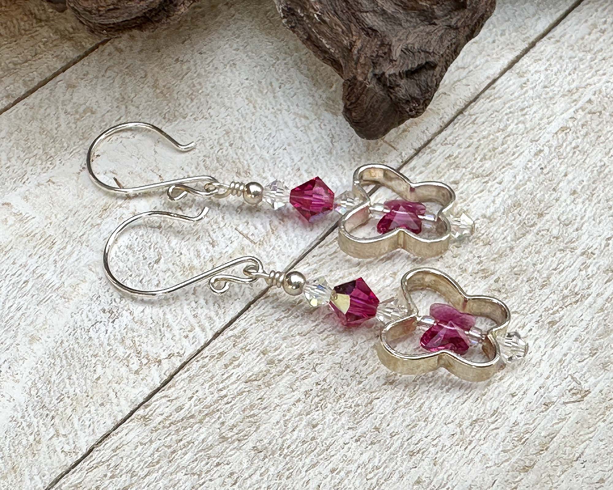 Discover the exquisite beauty of these handcrafted amethyst butterfly earrings, a perfect fusion of elegance and style. Each pair is meticulously crafted with 2-inch fuchsia and crystal AB crystals, fuchsia Swarovski Austrian butterfly crystals, and adorned with sterling silver butterfly.