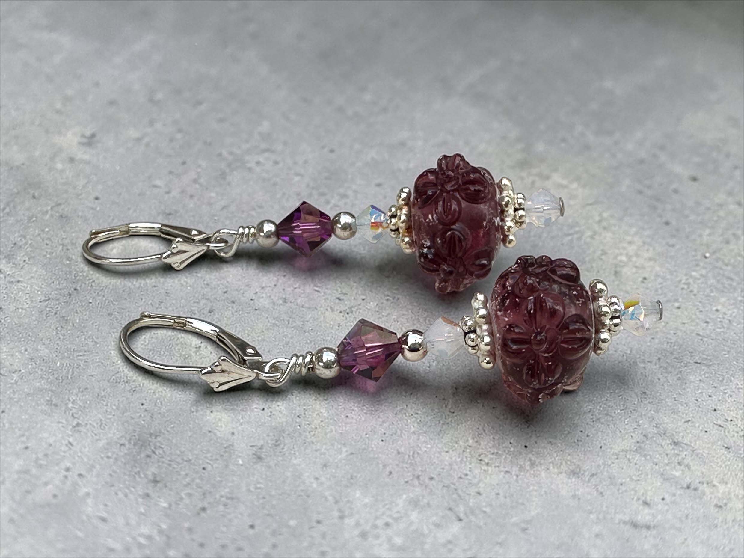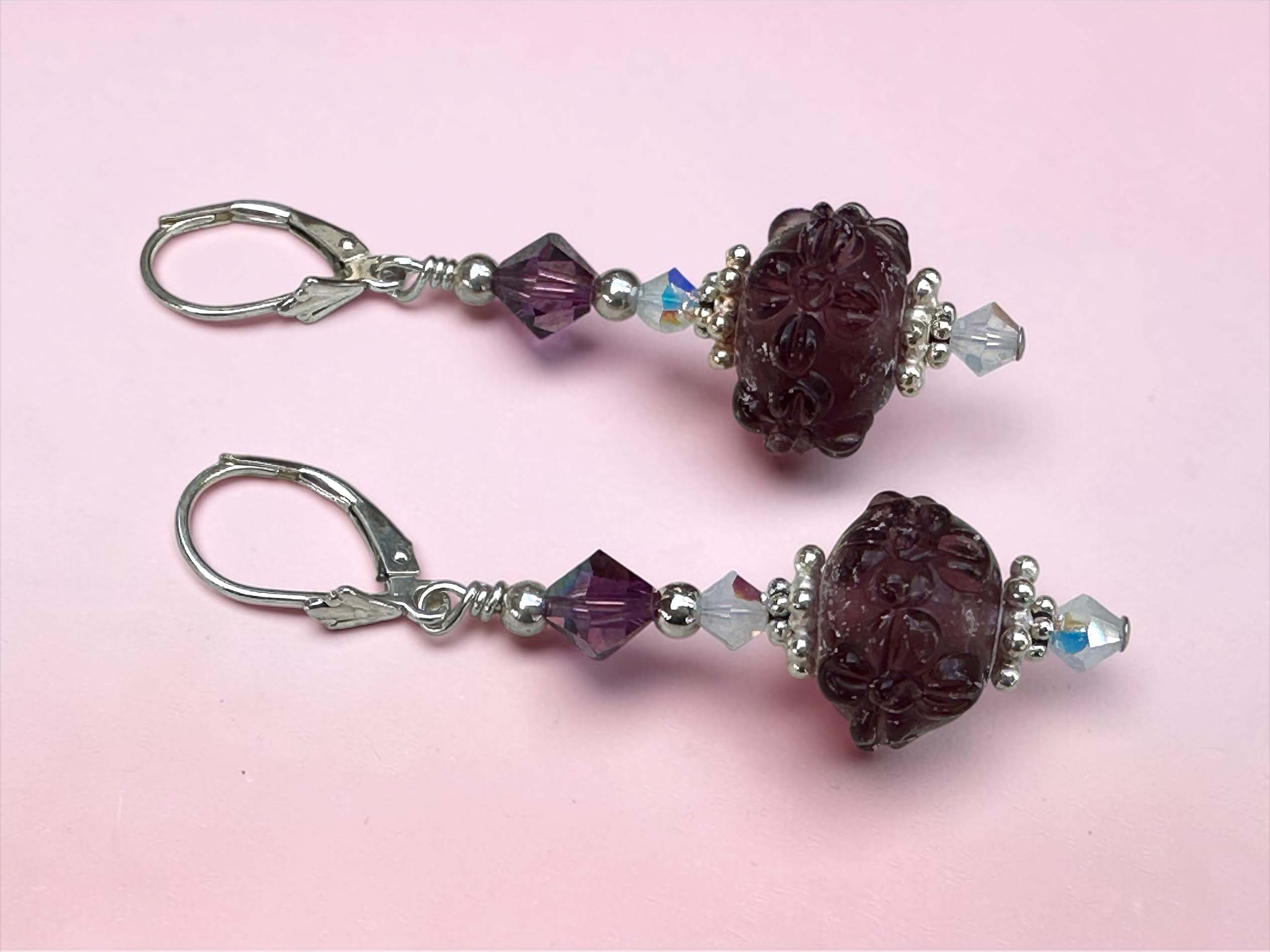 These elegant handcrafted amethyst lampwork earrings feature beautifully detailed floral glass beads in deep, rich purple tones. The imported lampwork beads display delicate raised floral patterns that add texture and dimension, creating a striking centerpiece with artistic depth.