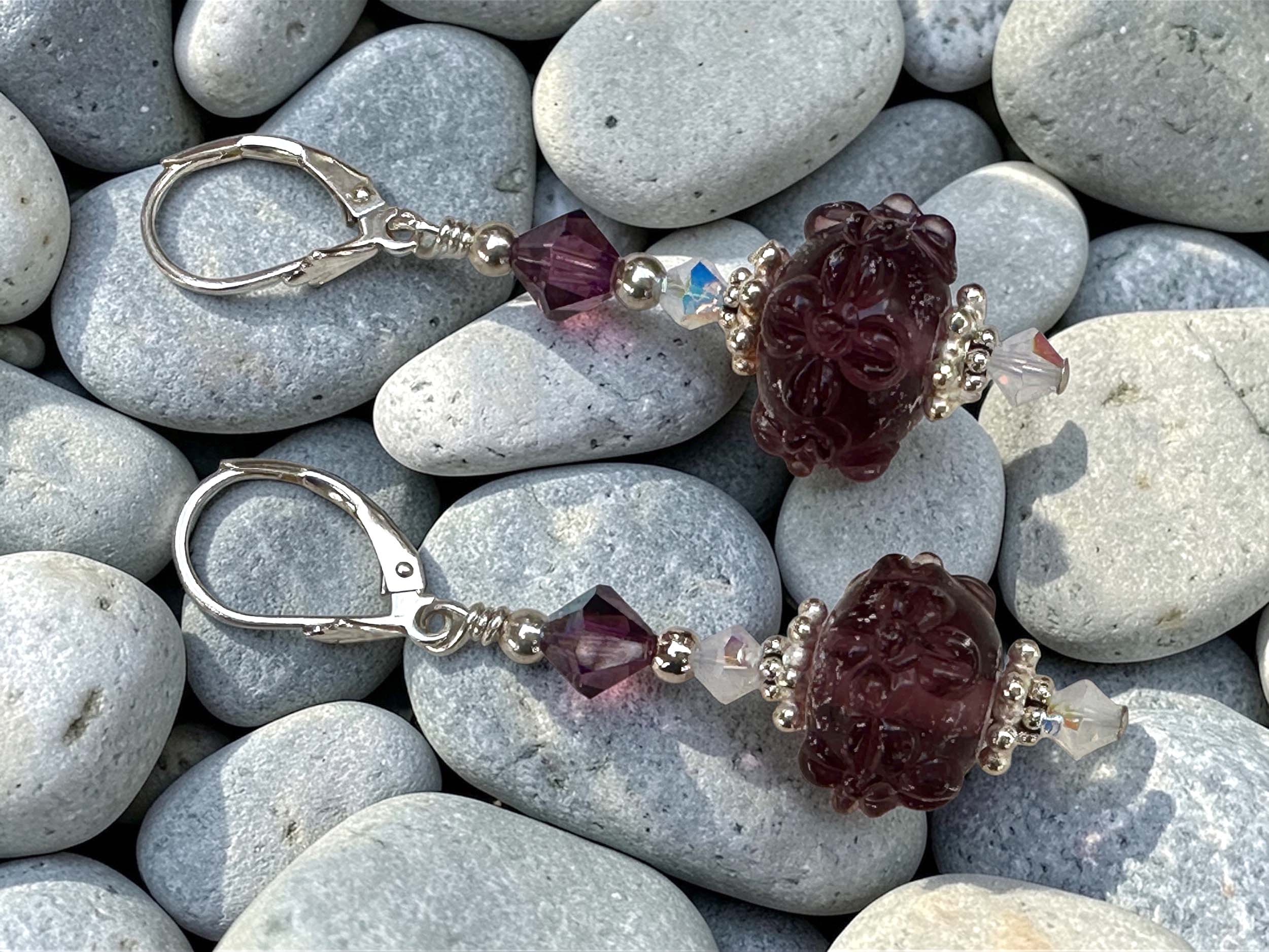 Sparkling amethyst crystals and luminous opal Swarovski Austrian crystals provide a soft iridescent shimmer that enhances the rich purple glass. Intricate silver accents frame the beads while sterling silver leverback closures ensure both secure and comfortable wear.