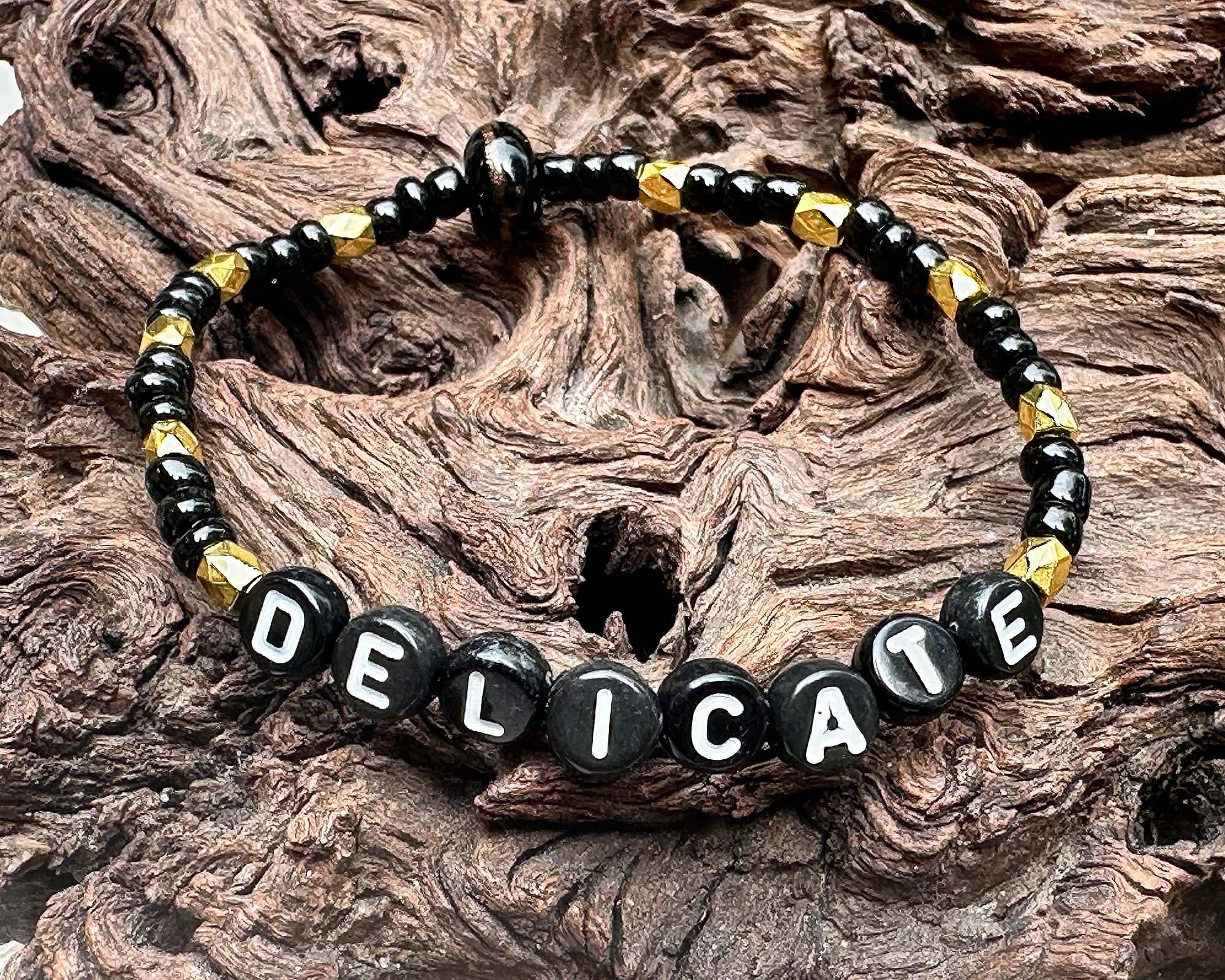 Discover the elegance of the "Delicate" Bracelet, a beautifully crafted piece featuring striking black, gold beads accented by a handcrafted lampwork bead. Each bracelet is carefully handmade, showcasing intricate craftsmanship and artistic detail that makes it truly one-of-a-kind. Designed with a gentle stretch, it offers a comfortable fit for smaller wrists (6 1/2 – 7 inches), making it a effortlessly chic accessory for any occasion.