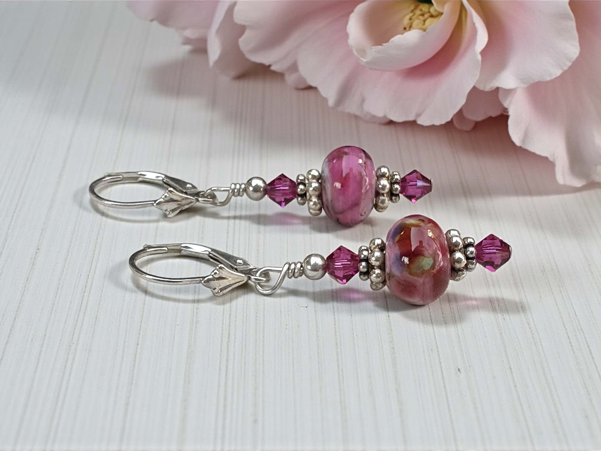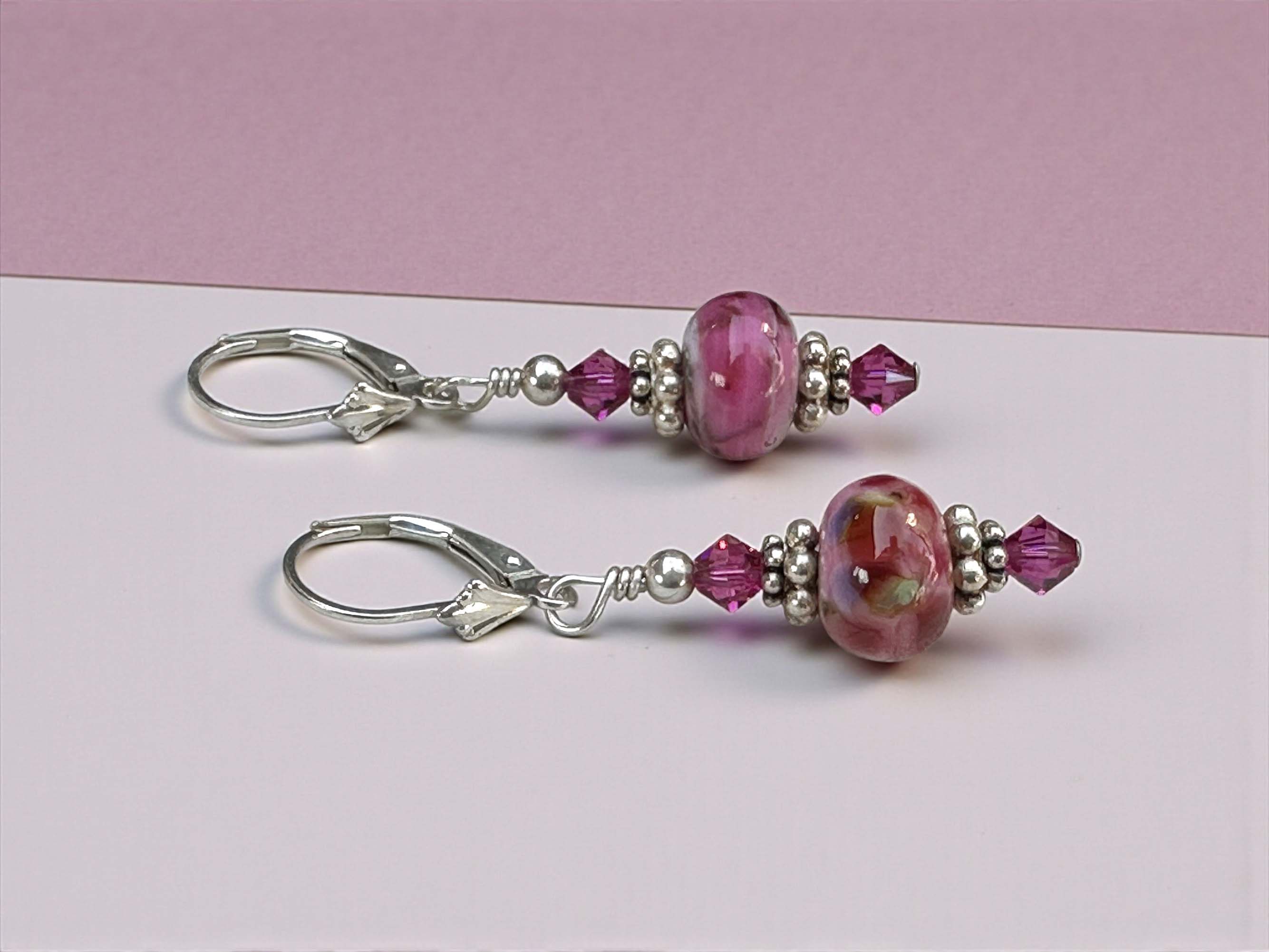 Framing the lampwork beads are sparkling fuchsia Swarovski Austrian crystals, adding vibrant brilliance and enhancing the richness of the pink tones. Intricate Bali .925 sterling silver spacers provide artisan detail and timeless elegance, while sterling silver leverback earwires ensure secure, comfortable wear and lasting durability.