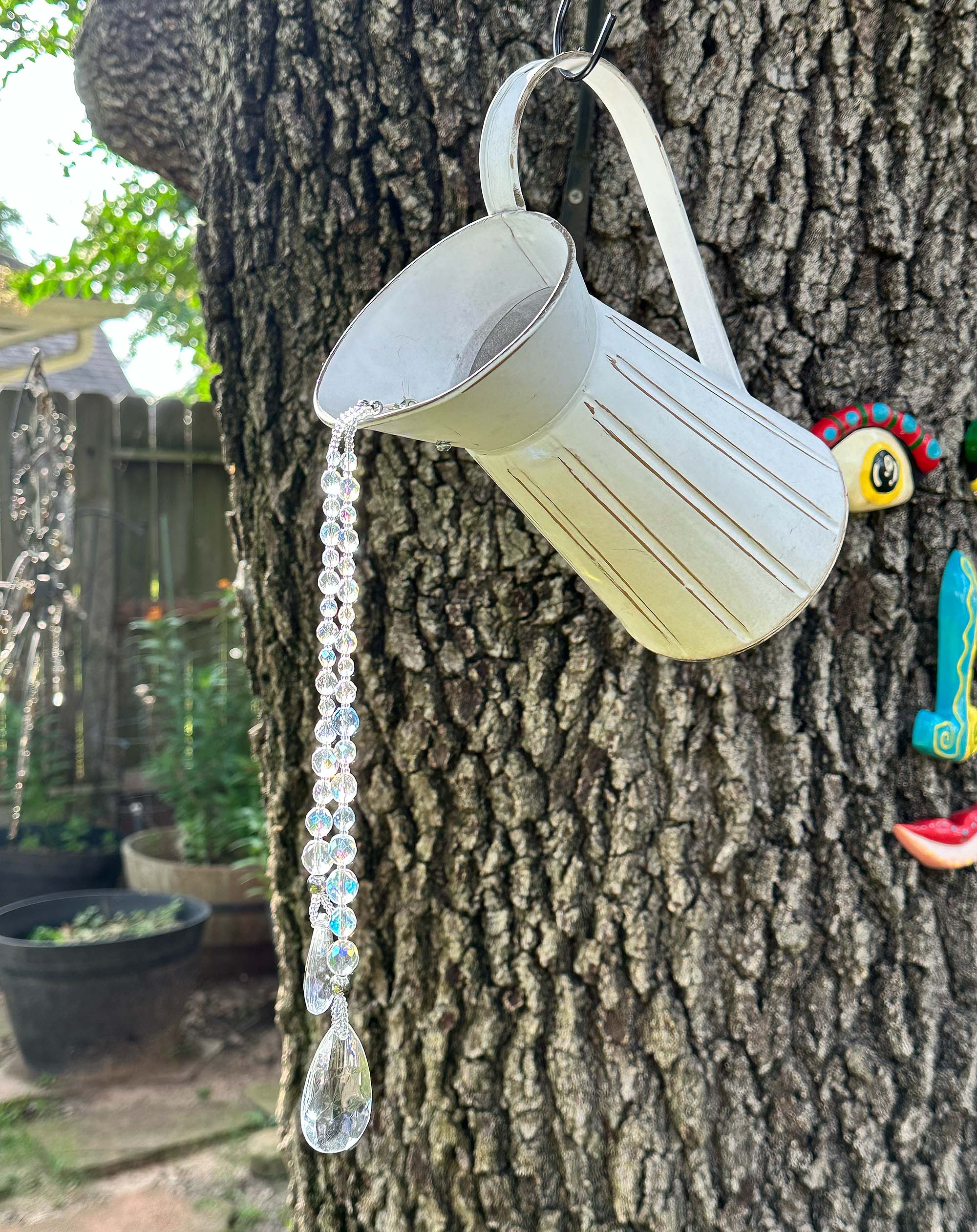 Add a touch of magic to your garden or patio with this charming handmade pouring crystals water pitcher art. Lovingly crafted, it showcases dazzling Czech glass beads, seed beads, and shimmering prisms that sparkle in the sunlight. Two crystal drops, each about 8 inches long, hang gracefully from a pitcher measuring 6 inches tall and 5 inches wide, creating a delightful water-inspired display that catches every eye.