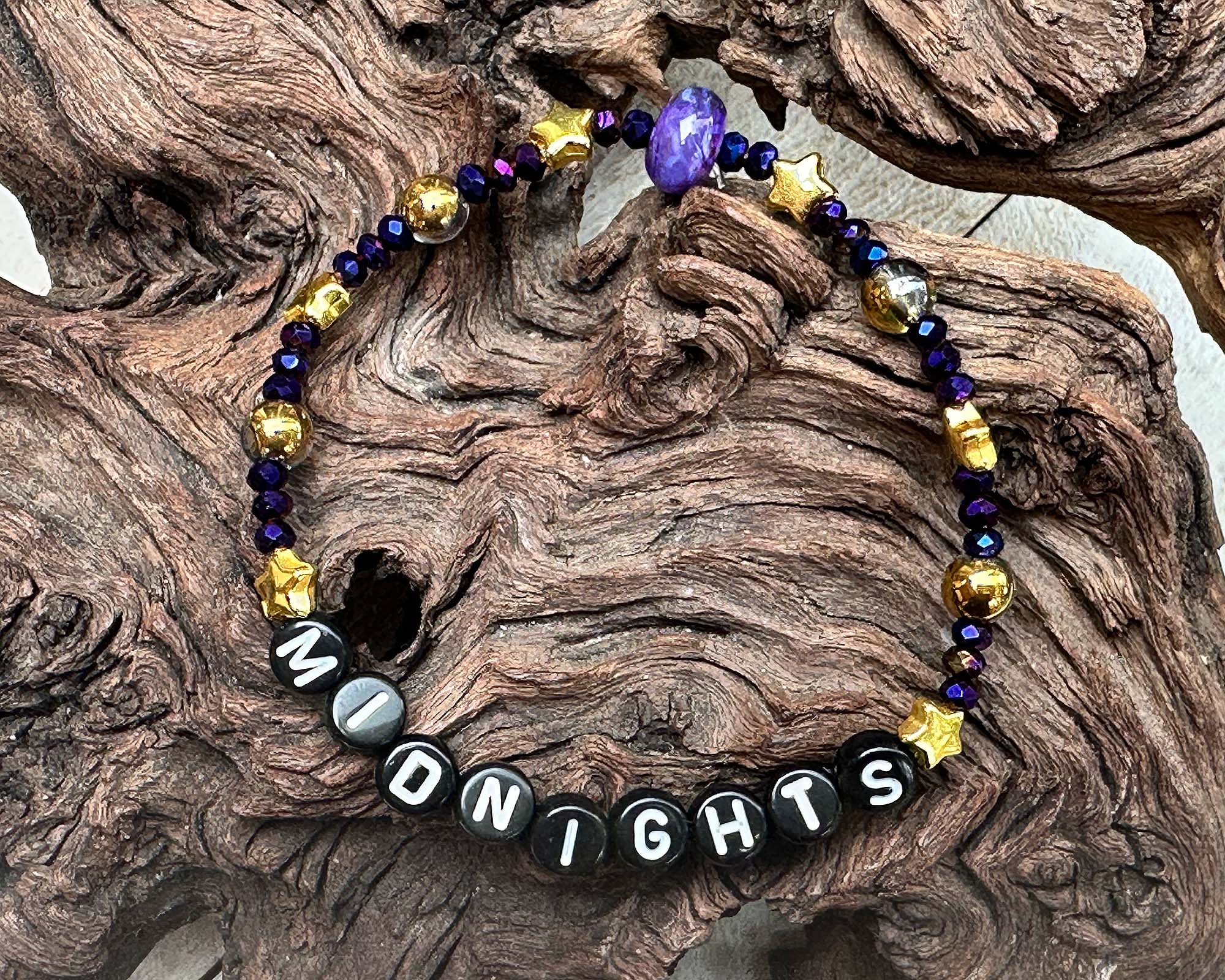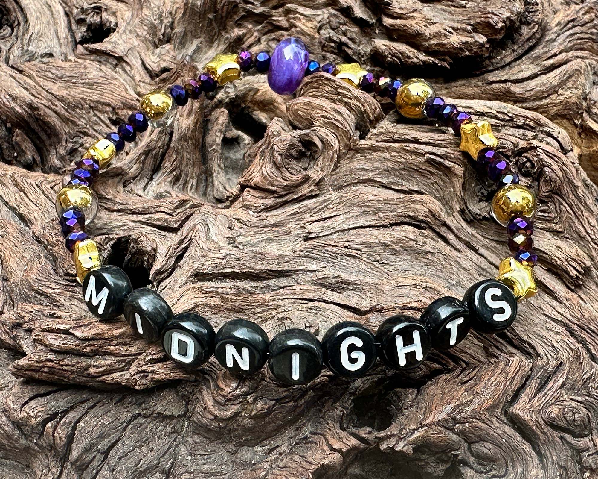 Discover the elegance of the "Midnights" Bracelet, a beautifully crafted piece featuring striking black, purple, and gold beads accented by a handcrafted lampwork bead. Each bracelet is carefully handmade, showcasing intricate craftsmanship and artistic detail that makes it truly one-of-a-kind. Designed with a gentle stretch, it offers a comfortable fit for smaller wrists (6 1/2 – 7 inches), making it a effortlessly chic accessory for any occasion.